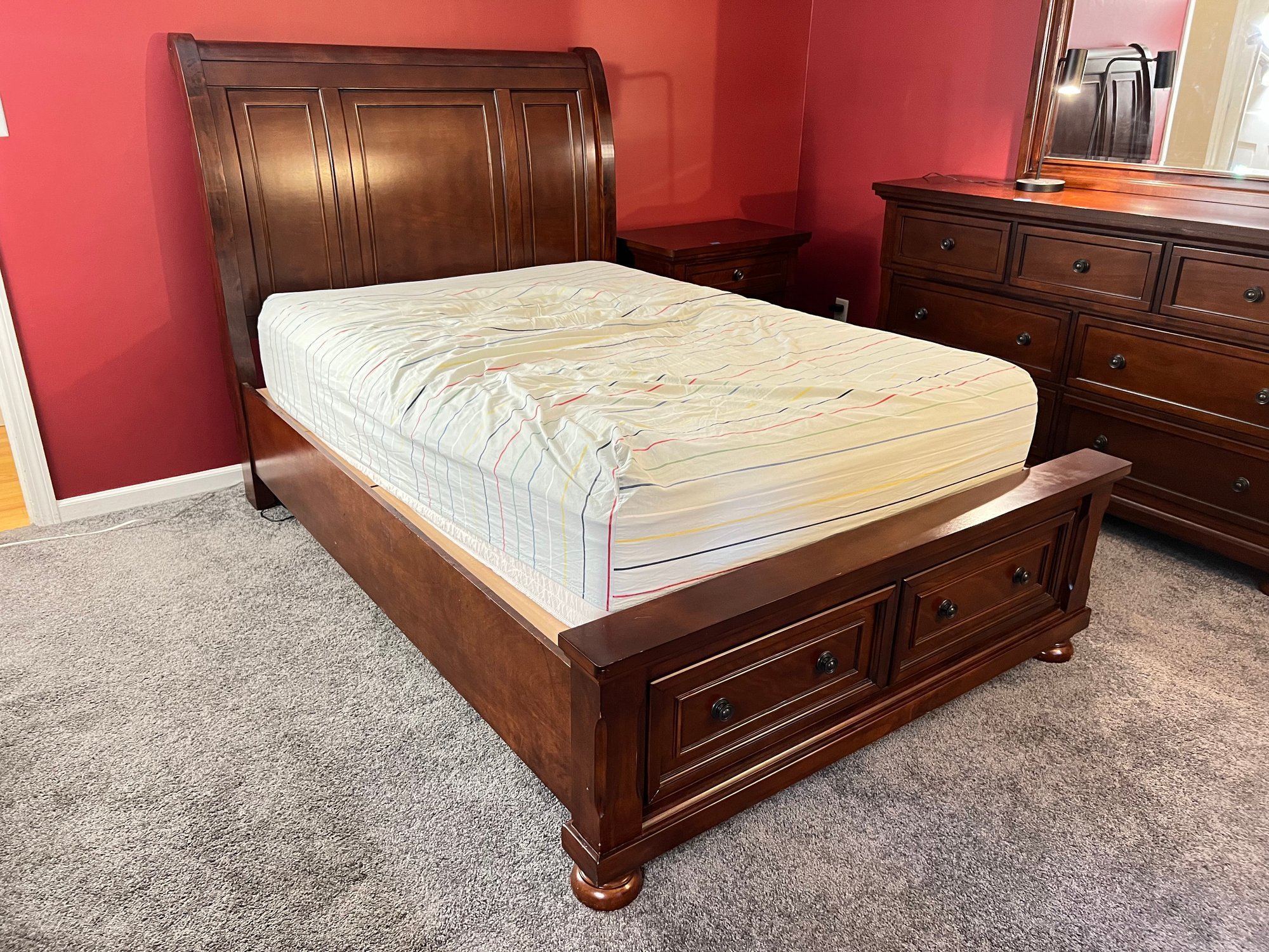 This matches the dresser, nice dark wood. Good shape. Headboard is 58" width, 57" height. 91" total length. Mattress not included.
