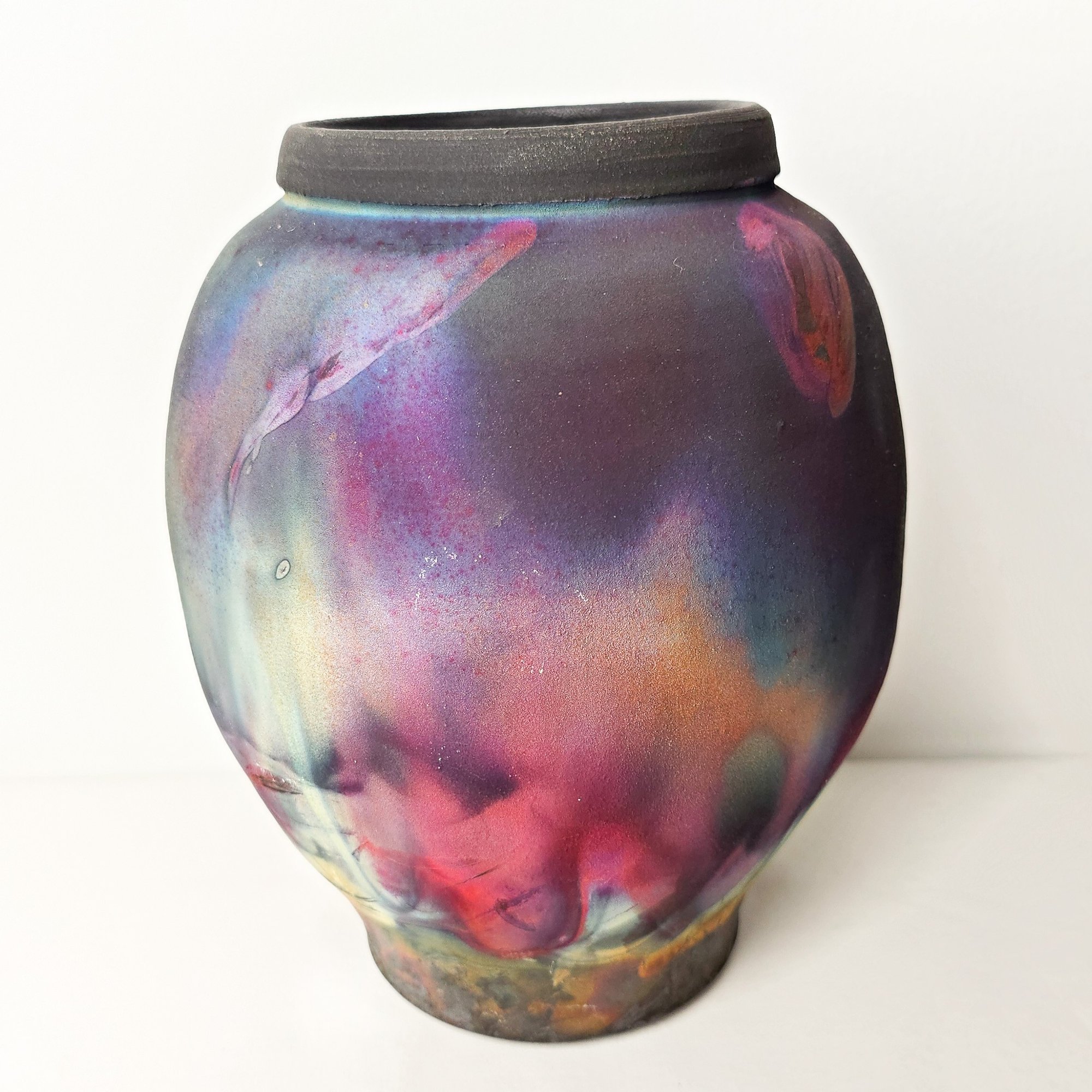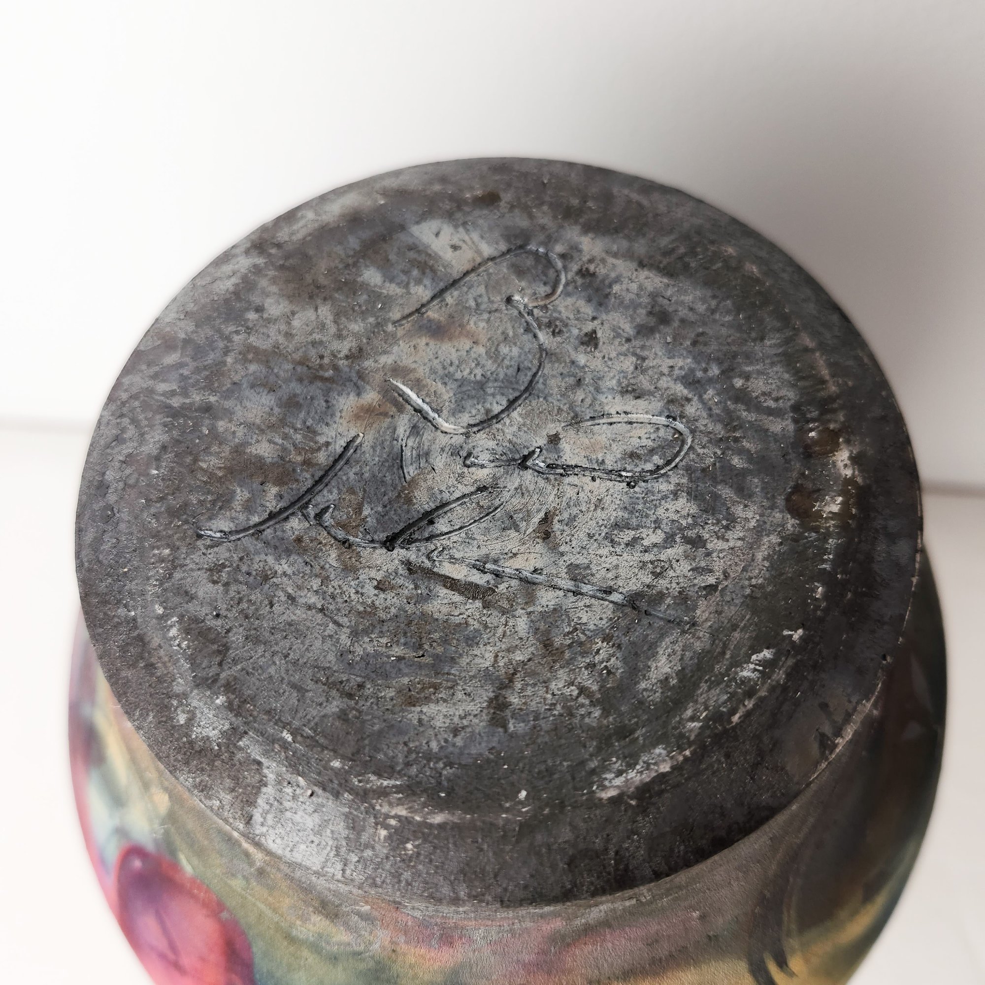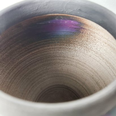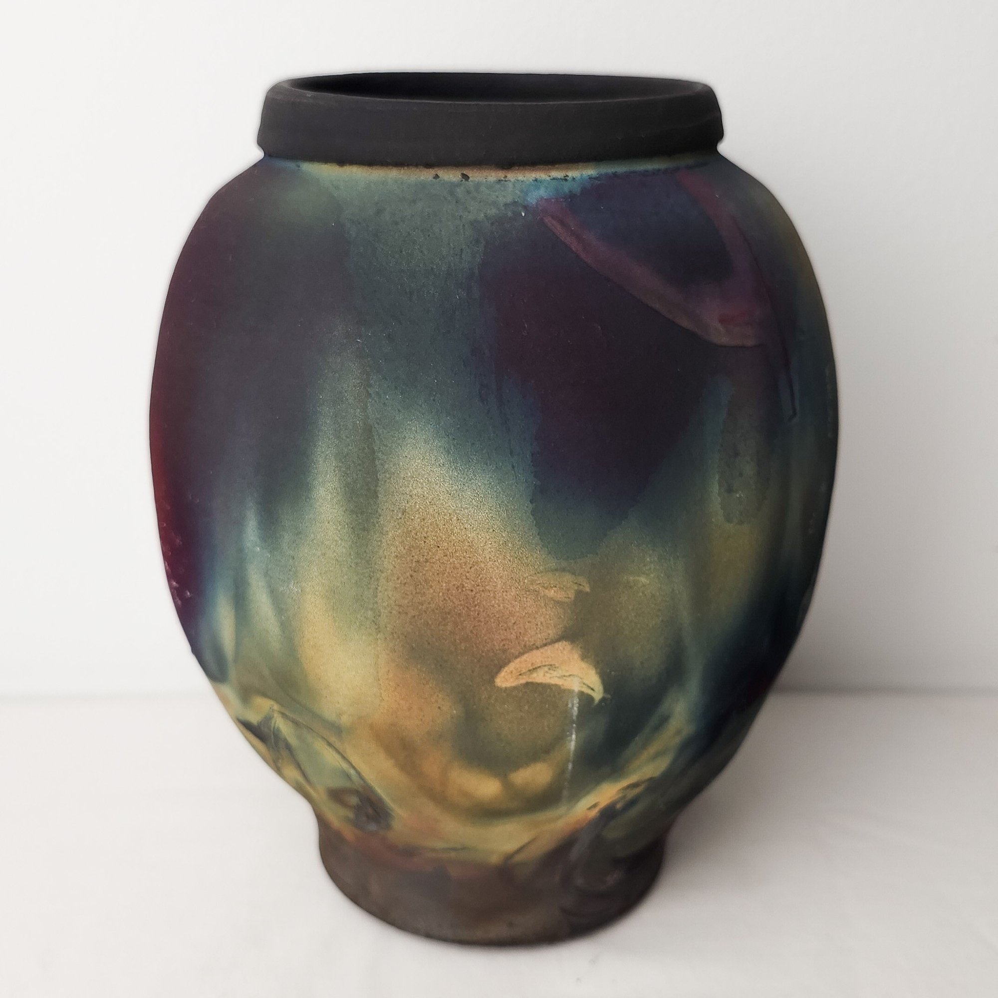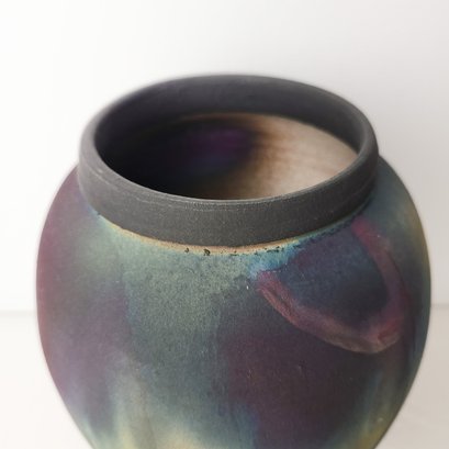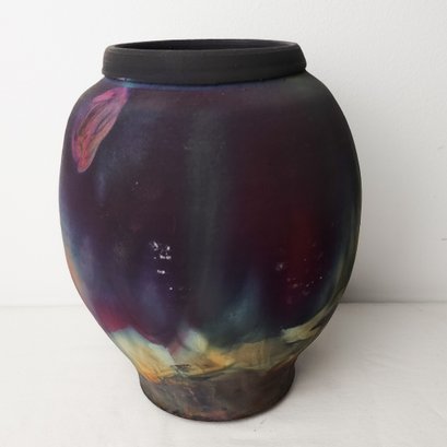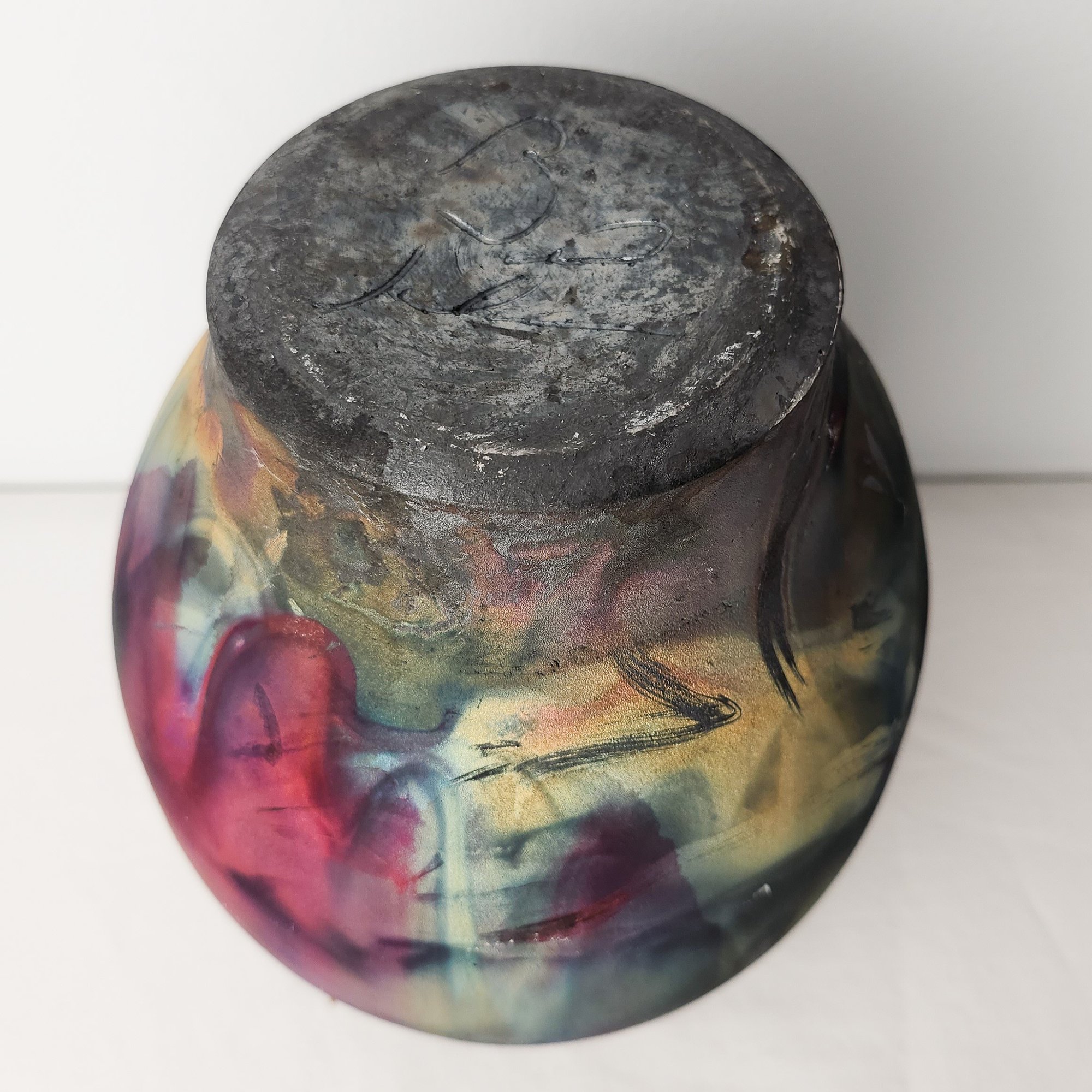 Deep colorful rake vase with matte surface and an opalescent coloring with a rough to the touch feeling, signed on bottom.