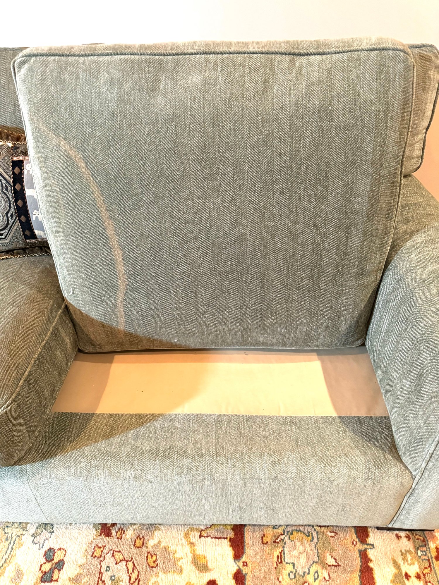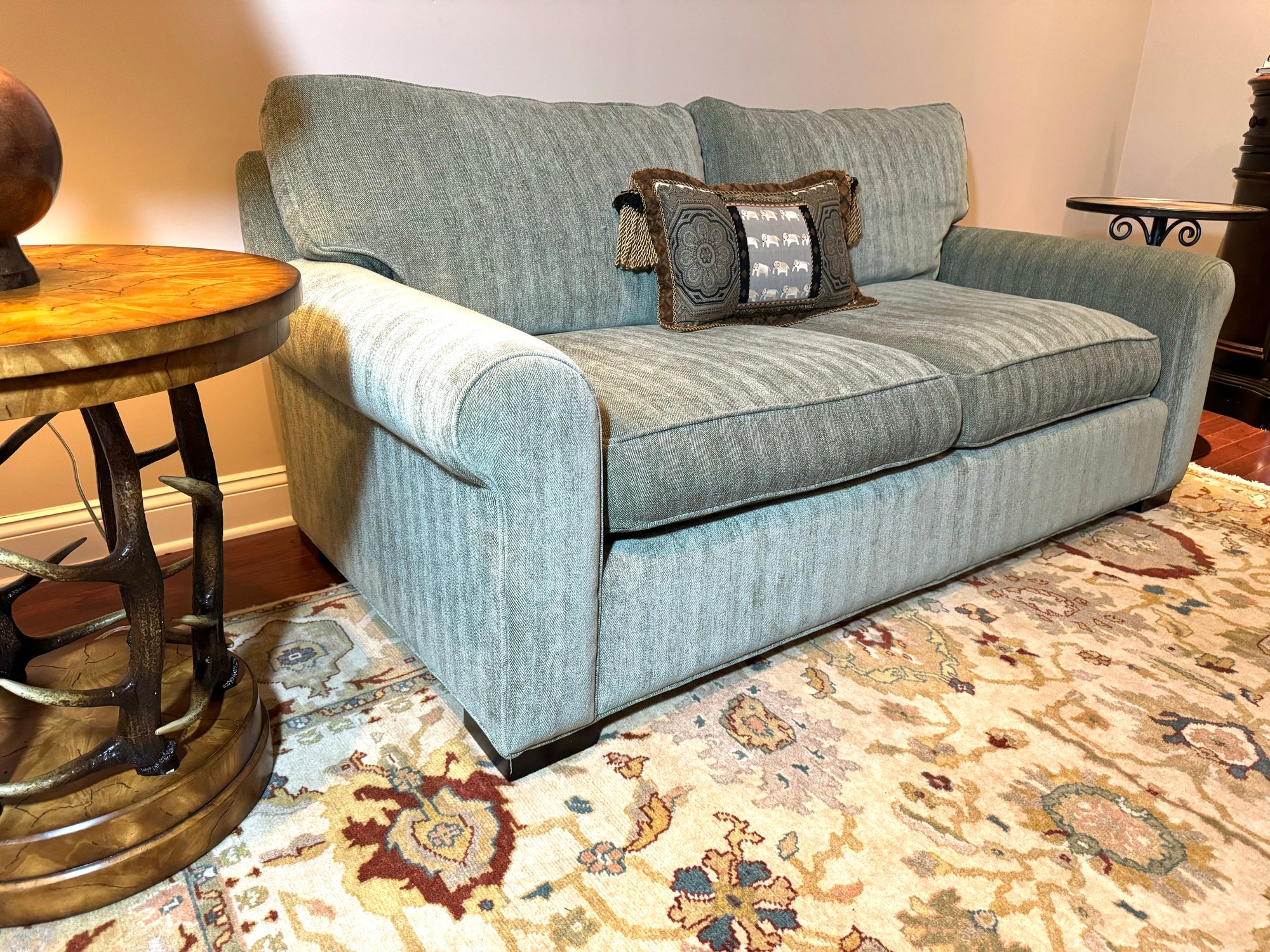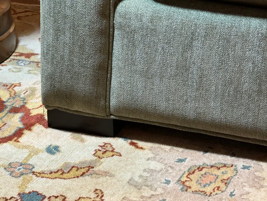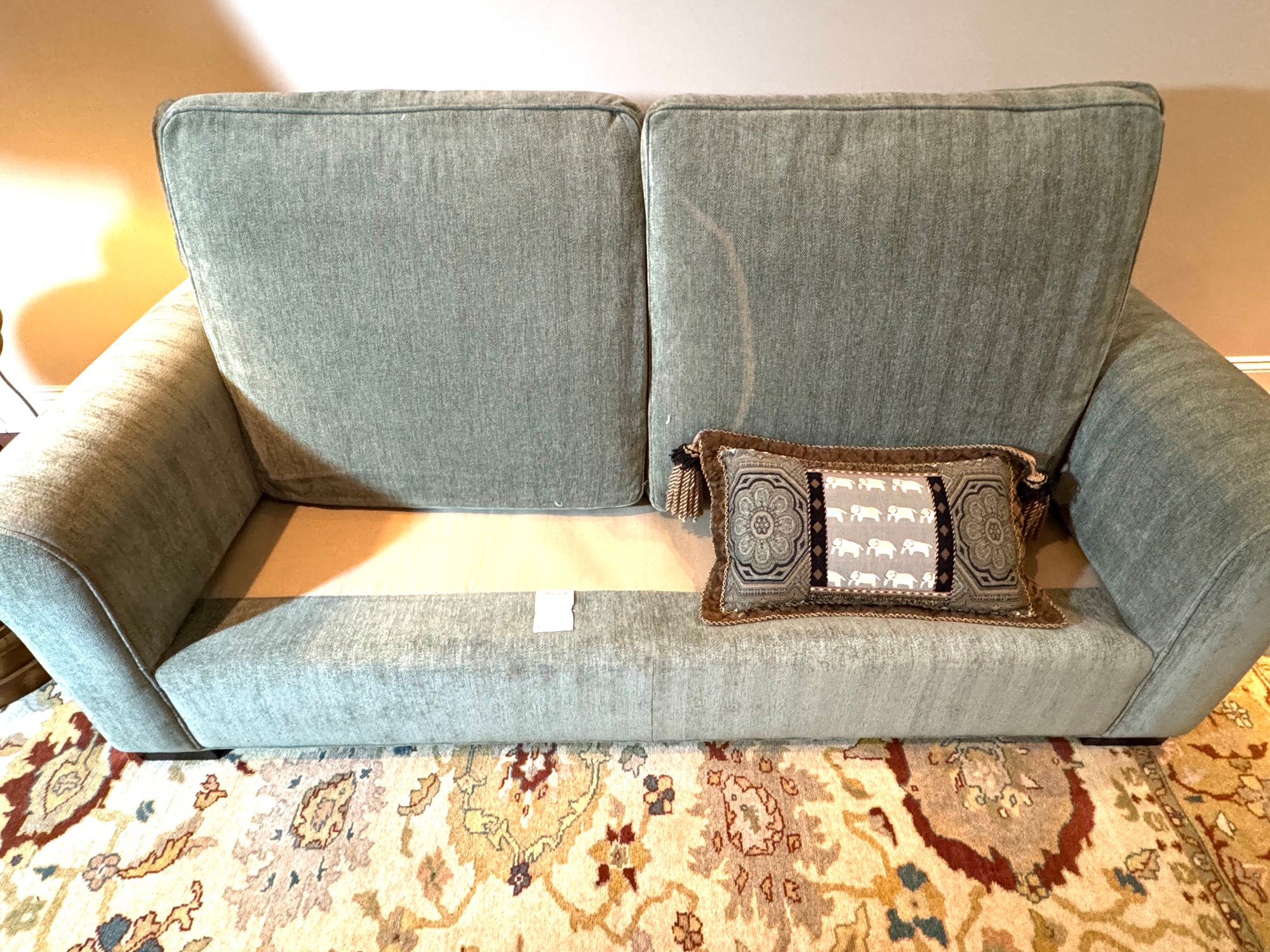 This is a super comfy two seater petite size club sofa made by McCreary Modern Inc. Upholstery is a soft chenille style. Back cushions are down filled. It has been used in a guest area with lite use and overall in very nice condition. It has a fade mark on underside of one cushion and a smaller on on the other. Otherwise perfect for apartments as is its name or family room. Size 81 L x 44 D x 31.5 Back H x 20 Seat H