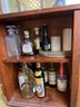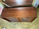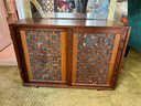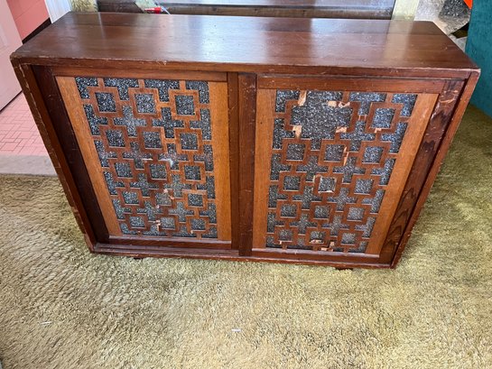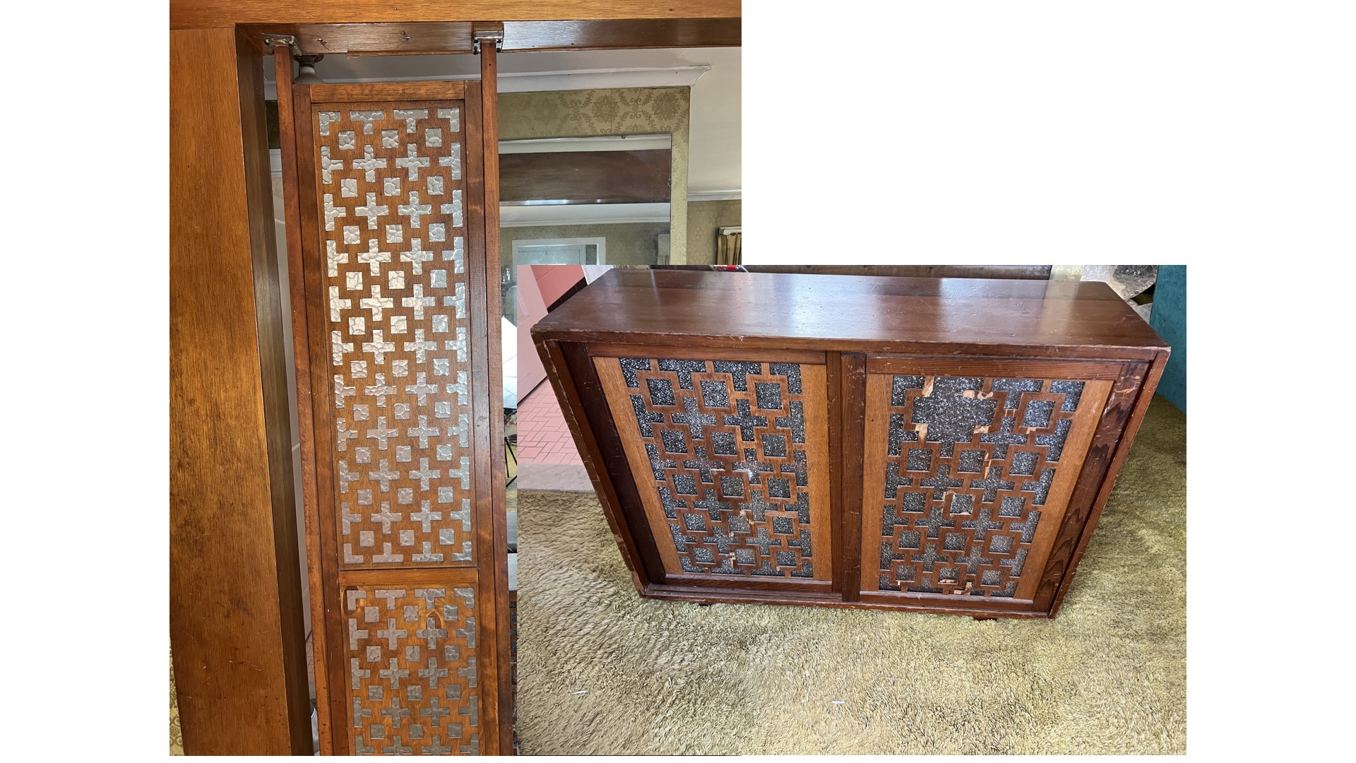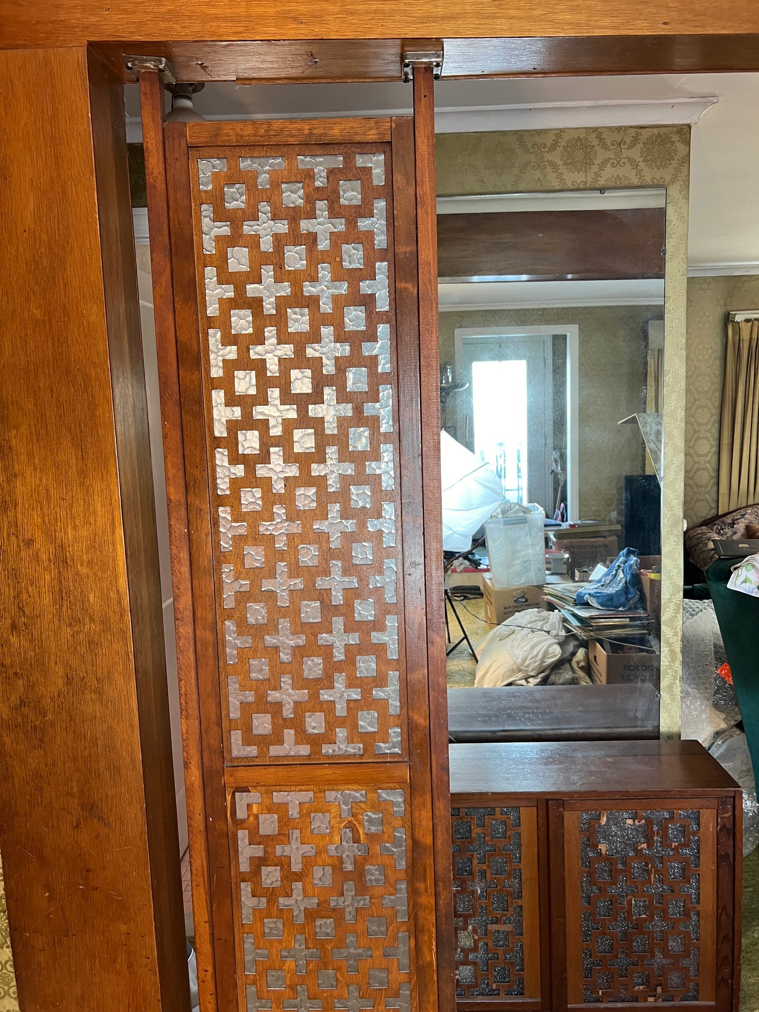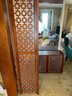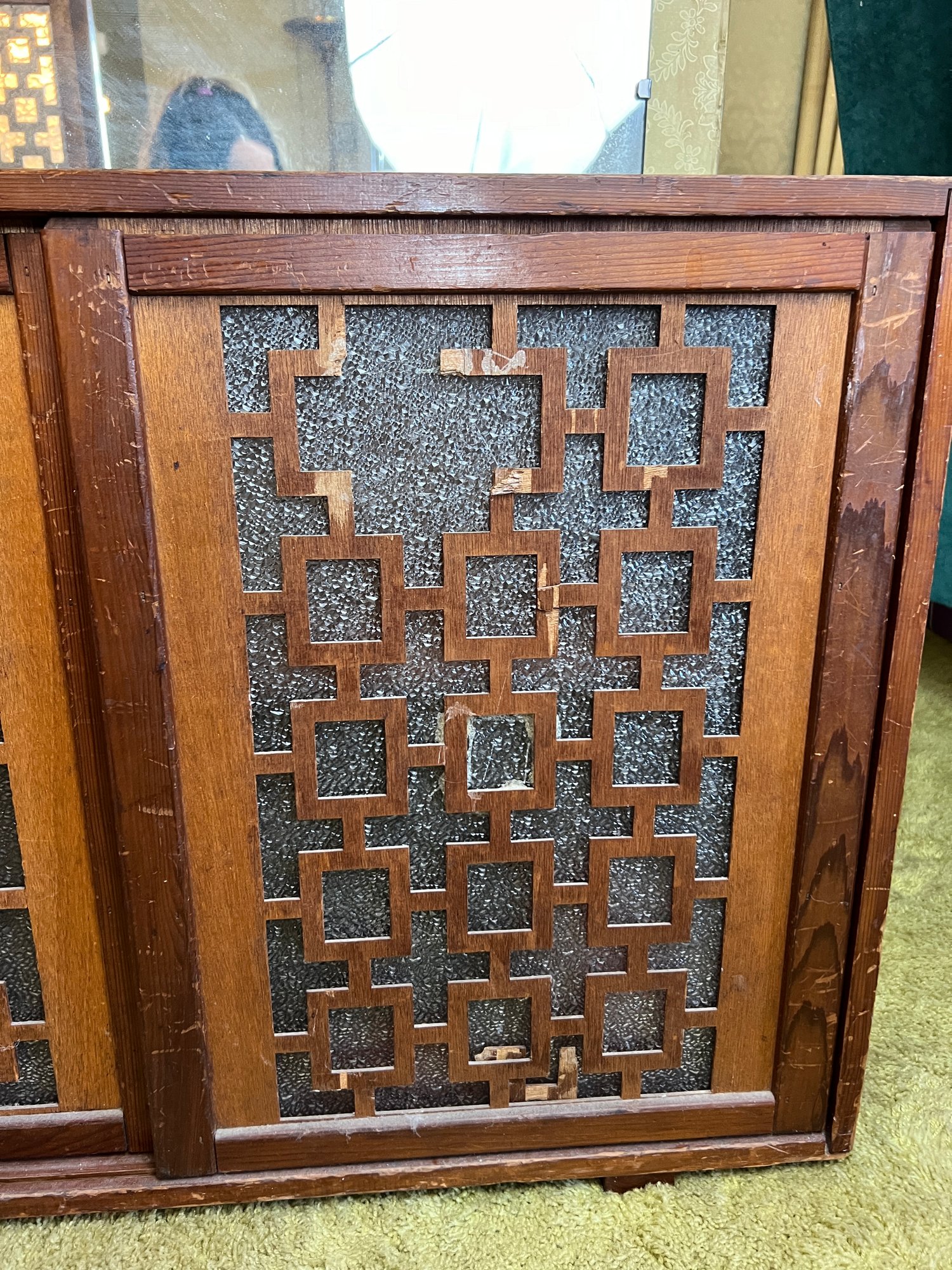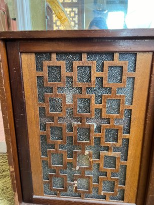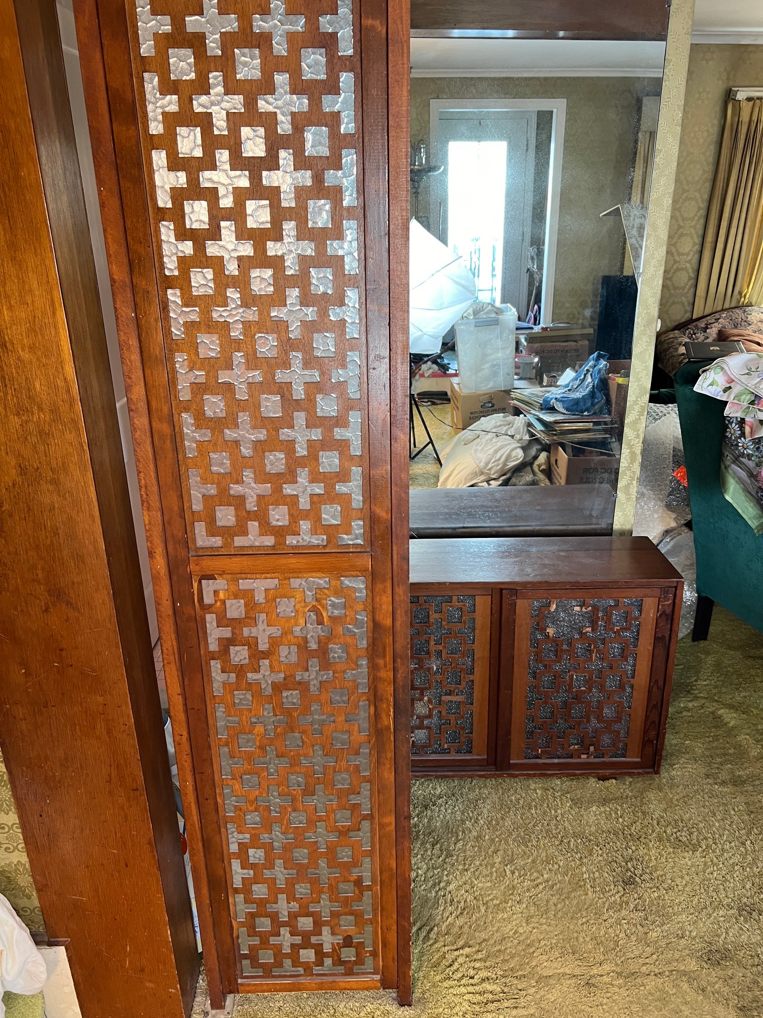 Mid century modern bar and room divider panel both featuring the same geometric lattice and textured plexiglass. One of the bar doors has damage to the lattice, this could be fixed by replicating the pattern or using a piece from the room-divider panel.