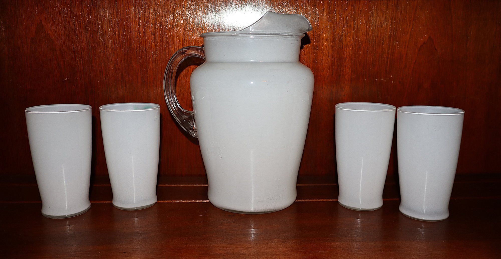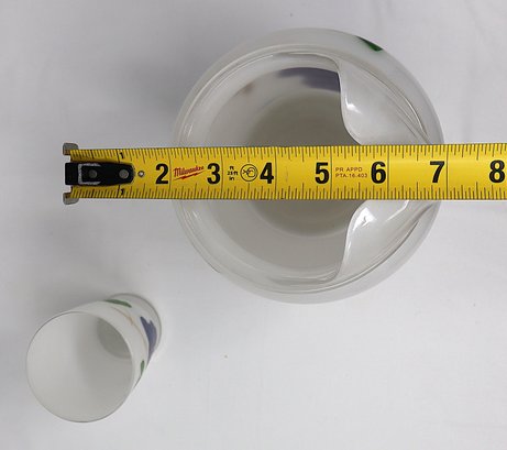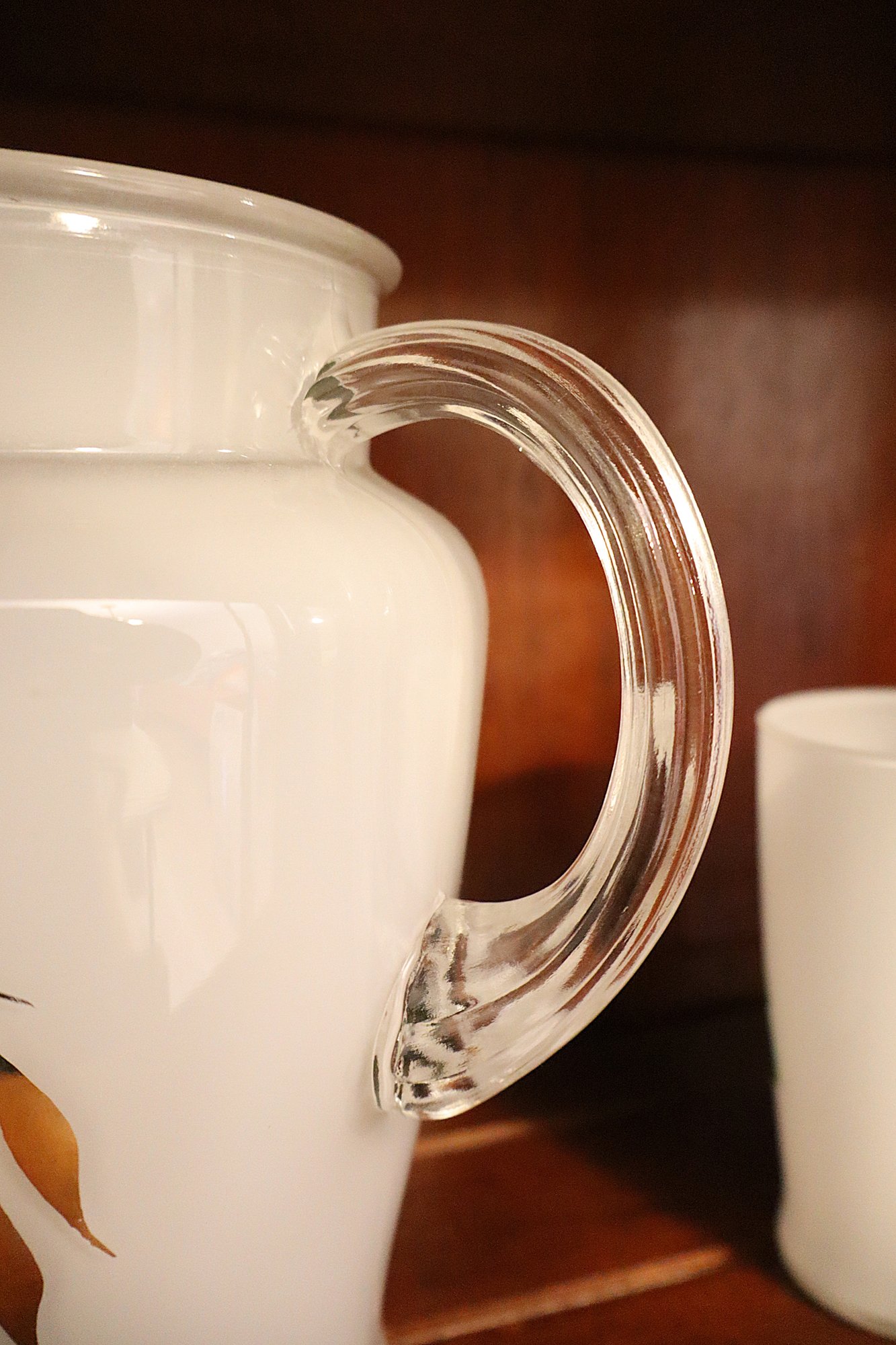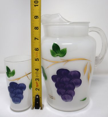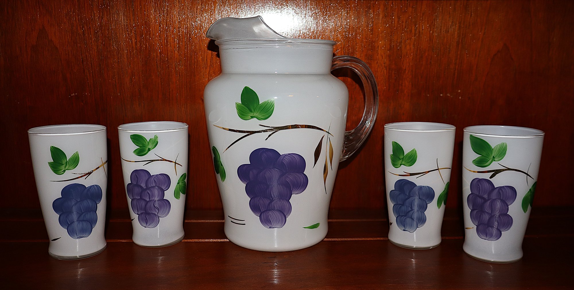 MCM Bartlett Collins Hand Painted Grape White Glass Pitcher & 4 Tumblers