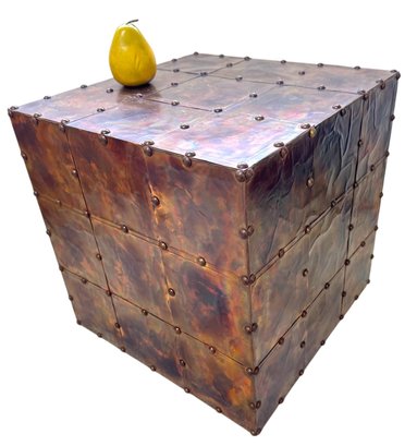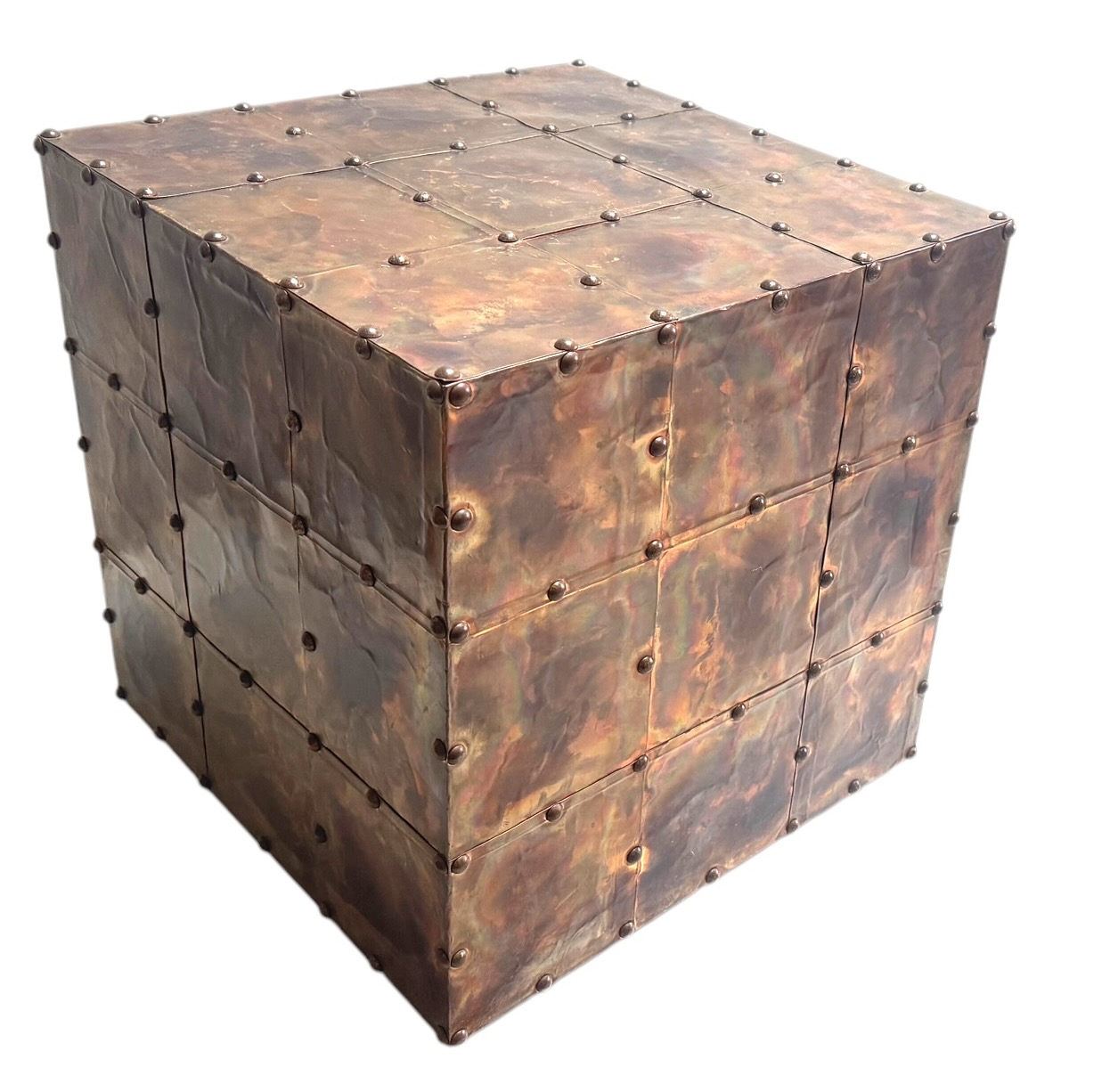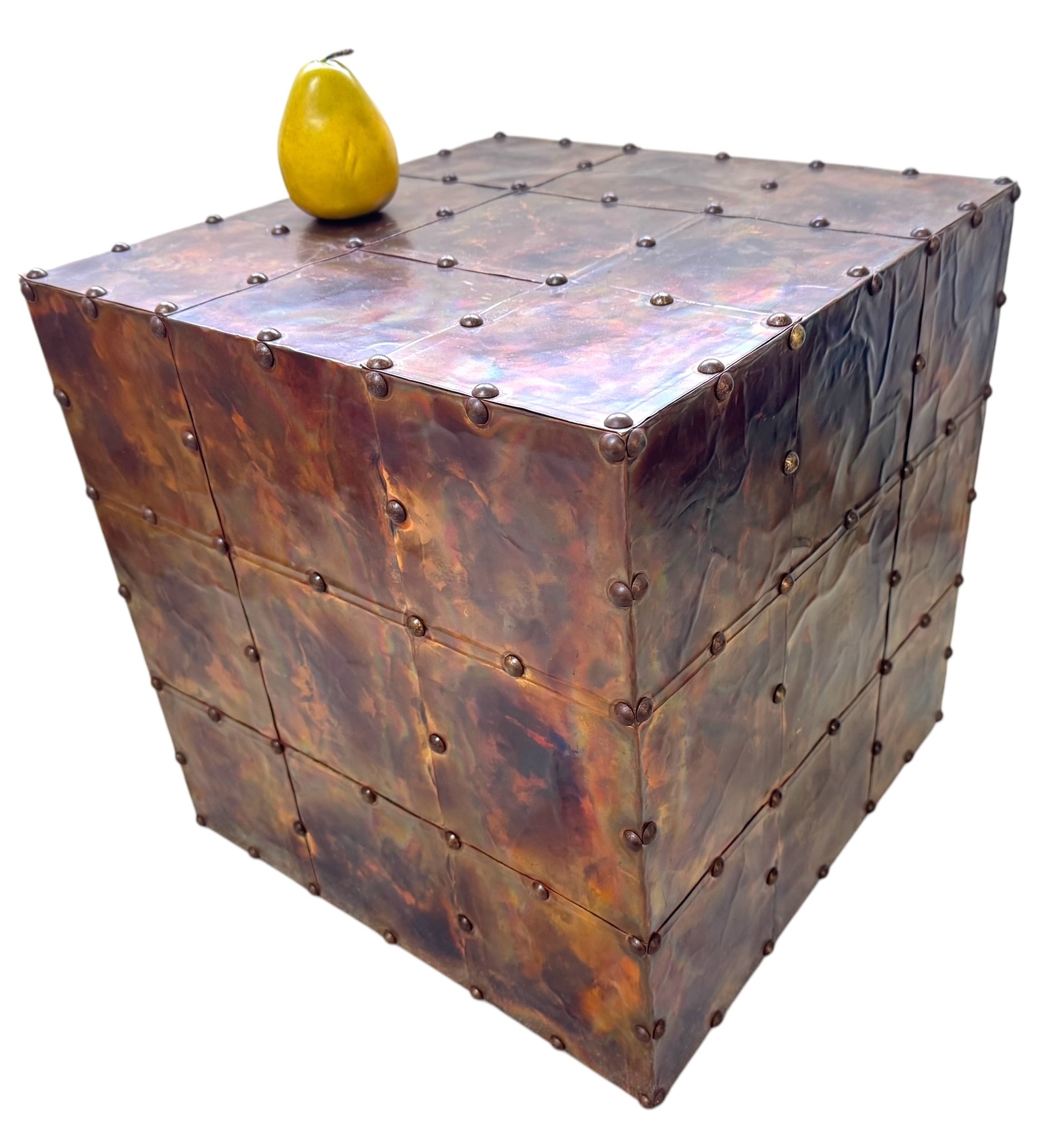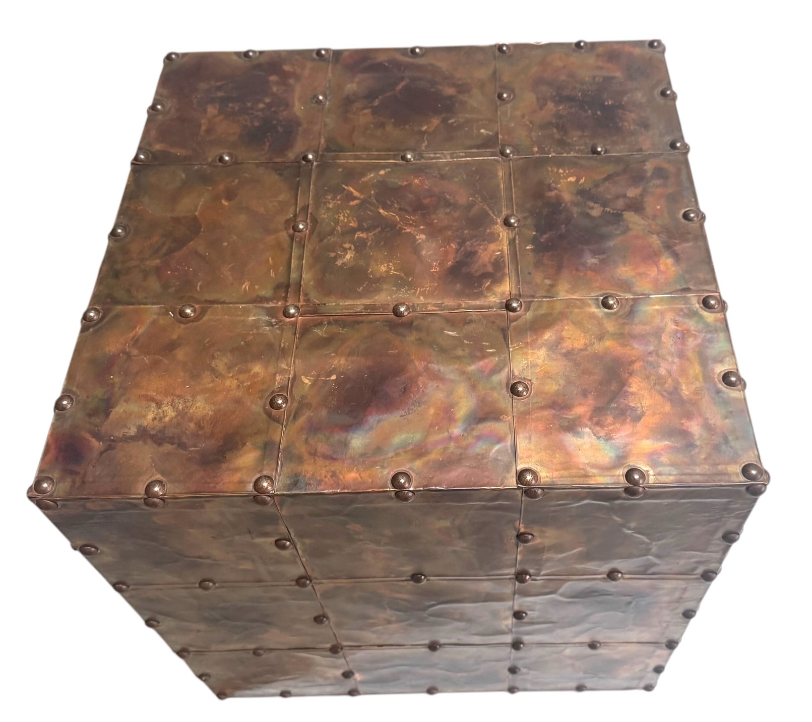Fantastic MCM Copper cube-shaped accent table that has a rustic and industrial design. The Constructed from individual metal plates with riveted edges creating a noticeable grid-like pattern, enhancing its MCM or steampunk aesthetic. It measures 16" X 16" X 16".