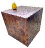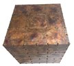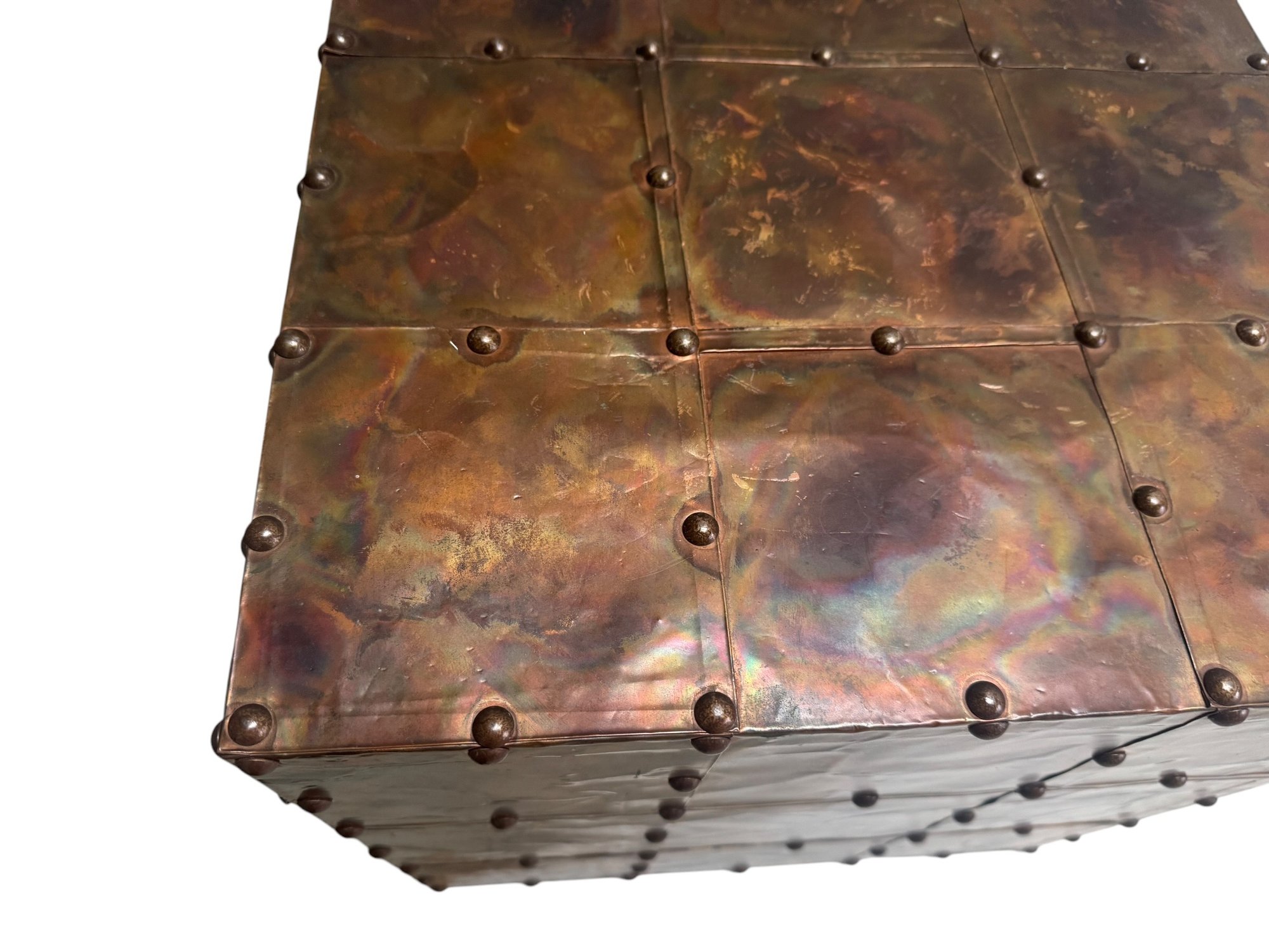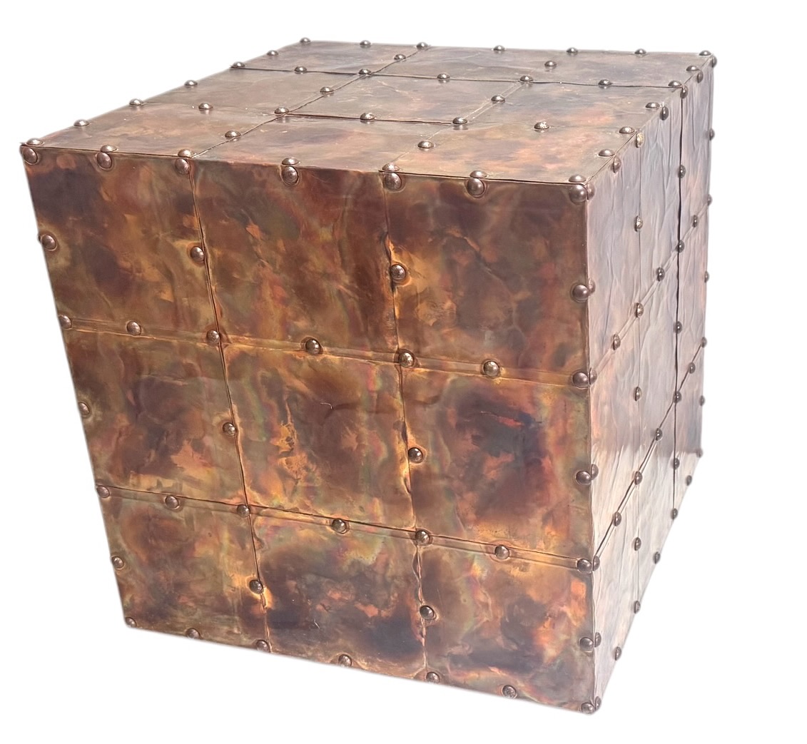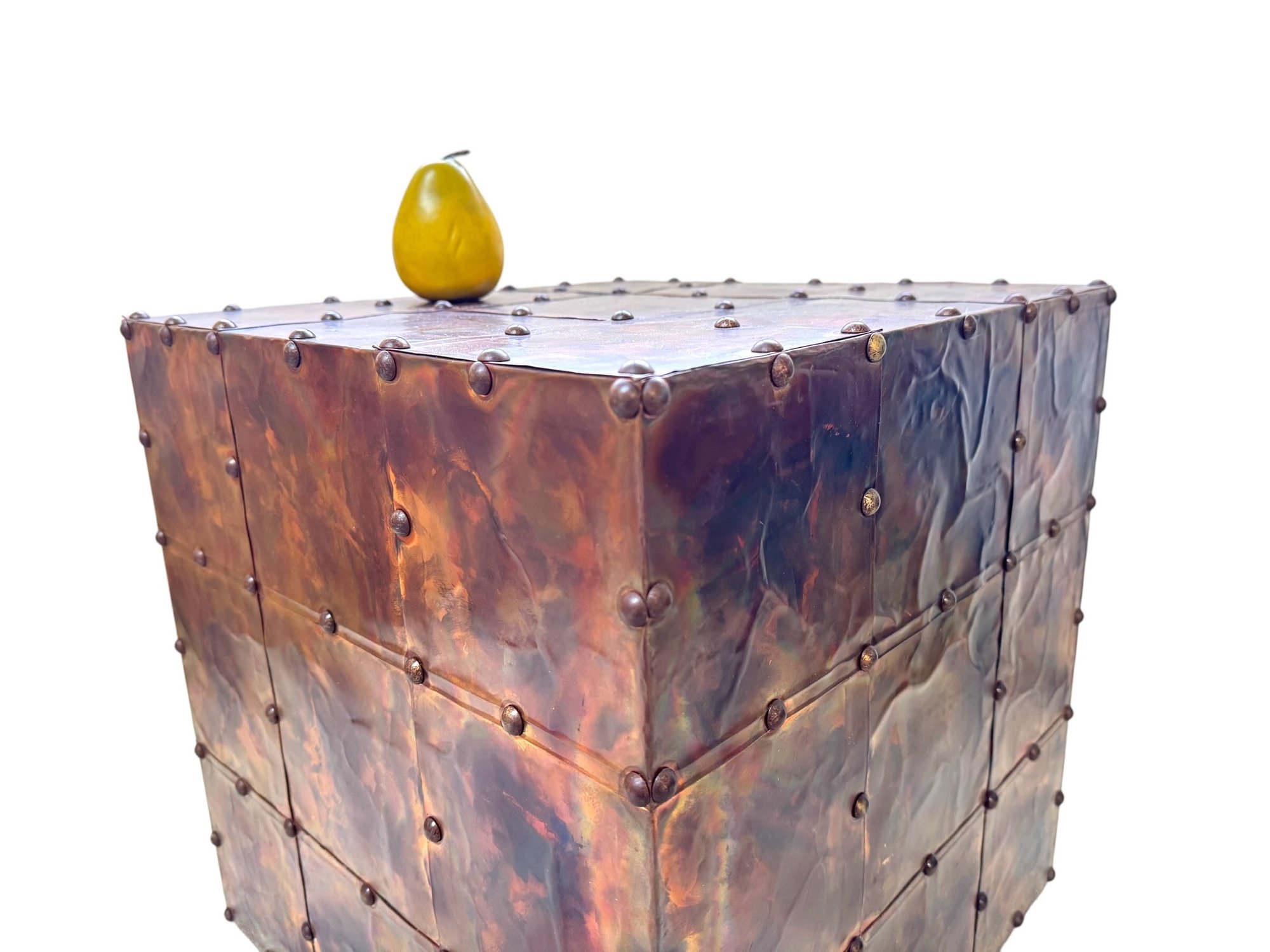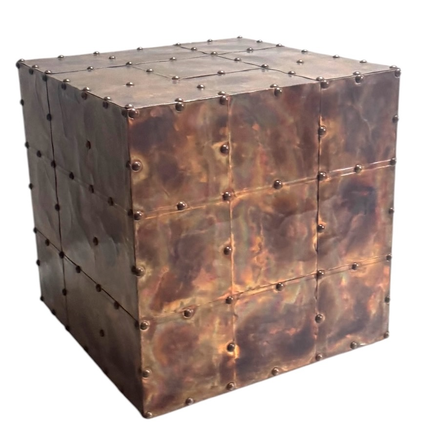 Fantastic MCM Copper cube-shaped accent table that has a rustic and industrial design. The Constructed from individual metal plates with riveted edges creating a noticeable grid-like pattern, enhancing its MCM or steampunk aesthetic. It measures 16" X 16" X 16".