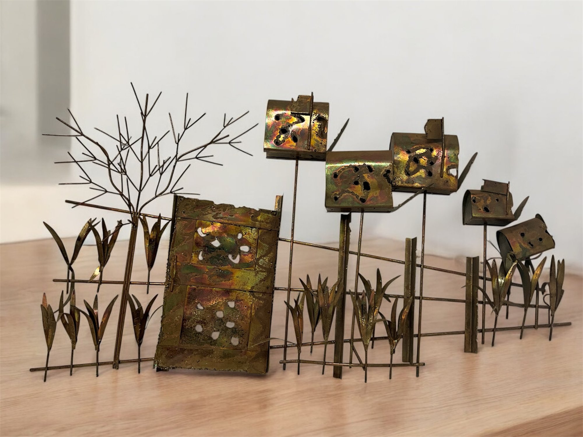 Brutalist wall sculpture constructed of brass and copper in the Curtis Jere style.