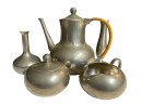 Vintage Daalderop Tiel Royal Holland Pewter Coffee Tea Pot Bamboo Wrapped Handle and accessories. Good Condition.