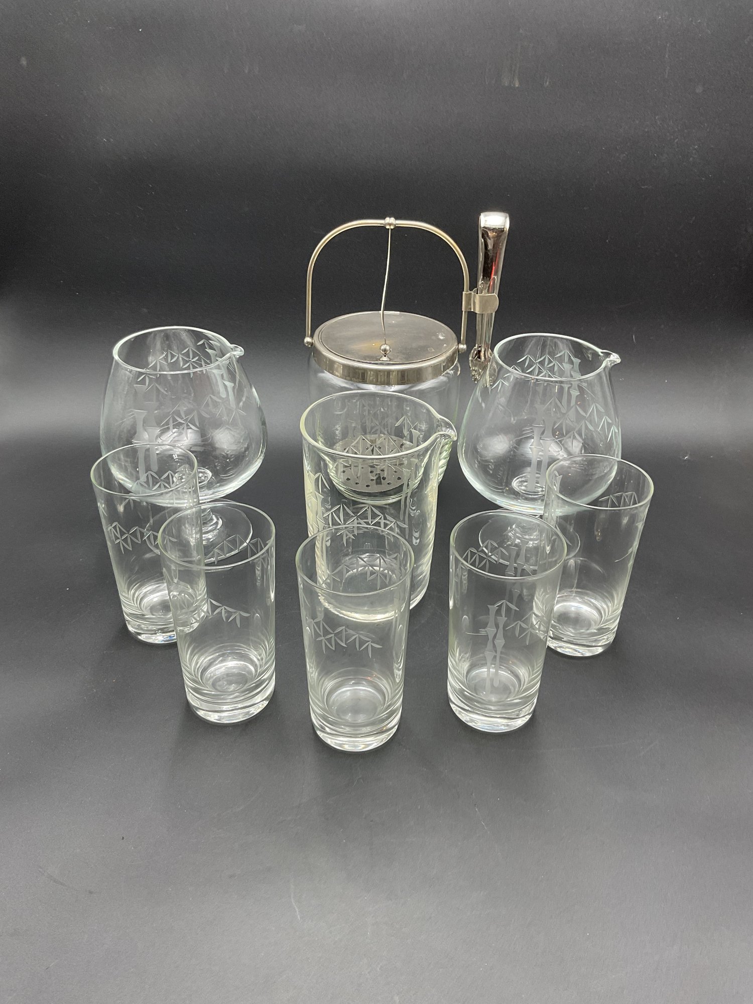 This is a beautiful mid-century vintage bar set with Asian-style etching of bamboo. Believed to be Noritake Sasaki. Includes lidded ice bucket with tongs and insert, a heavy glass pitcher, two unusual large footed snifters with spouts (possibly decanters?), and 5 tall cocktail glasses. All in excellent condition except for scuffs and slight oxidation to ice bucket lid.