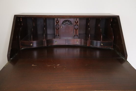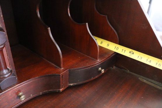 Features a rectangular top over a slanted lid that opens to reveal 6 pigeon holes flanking a centralized door