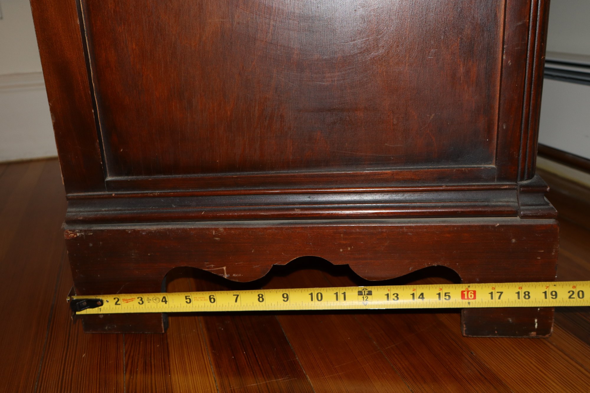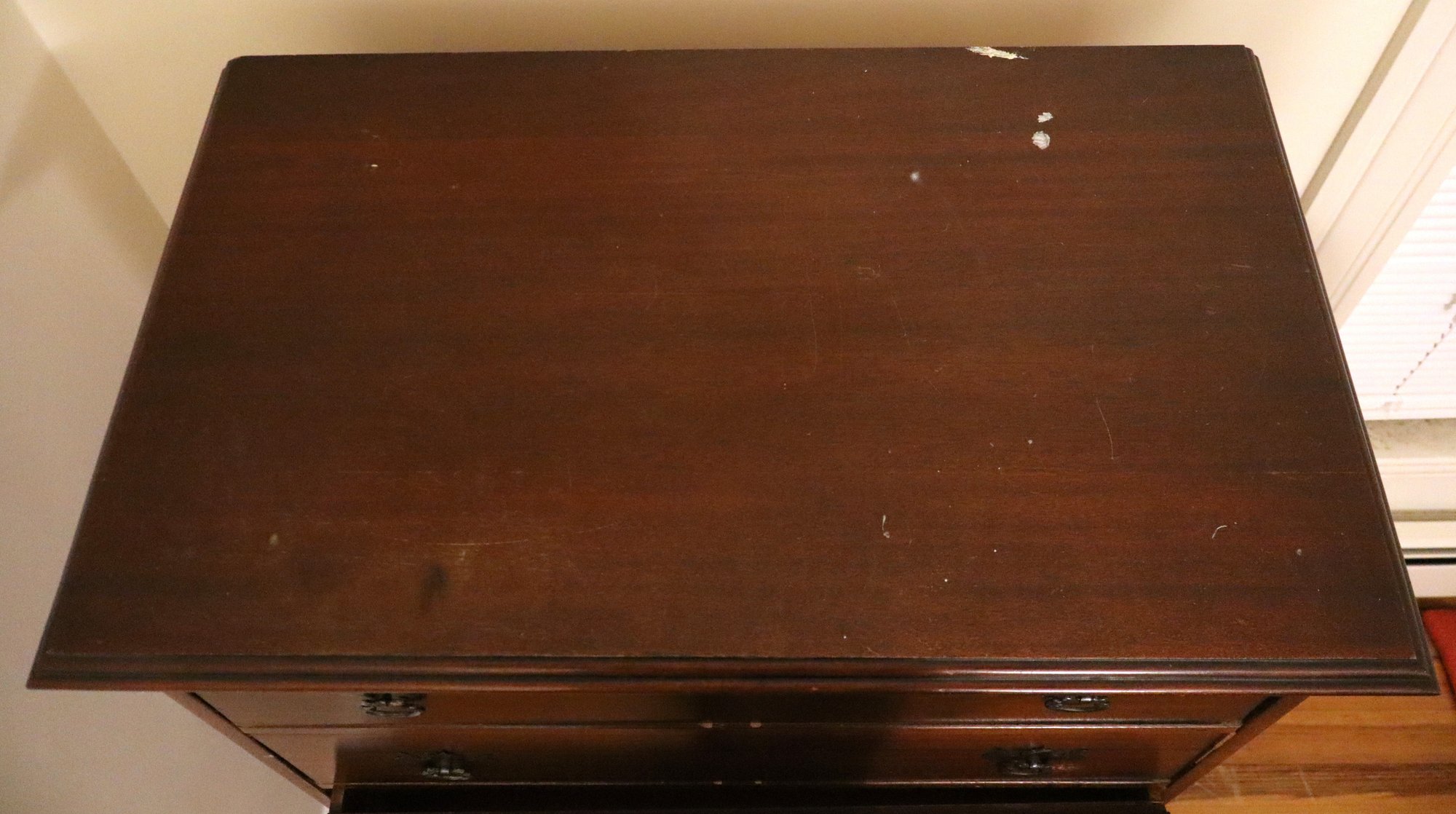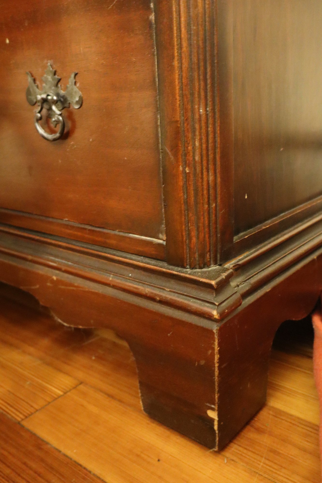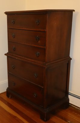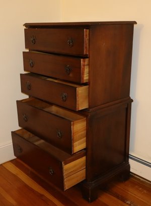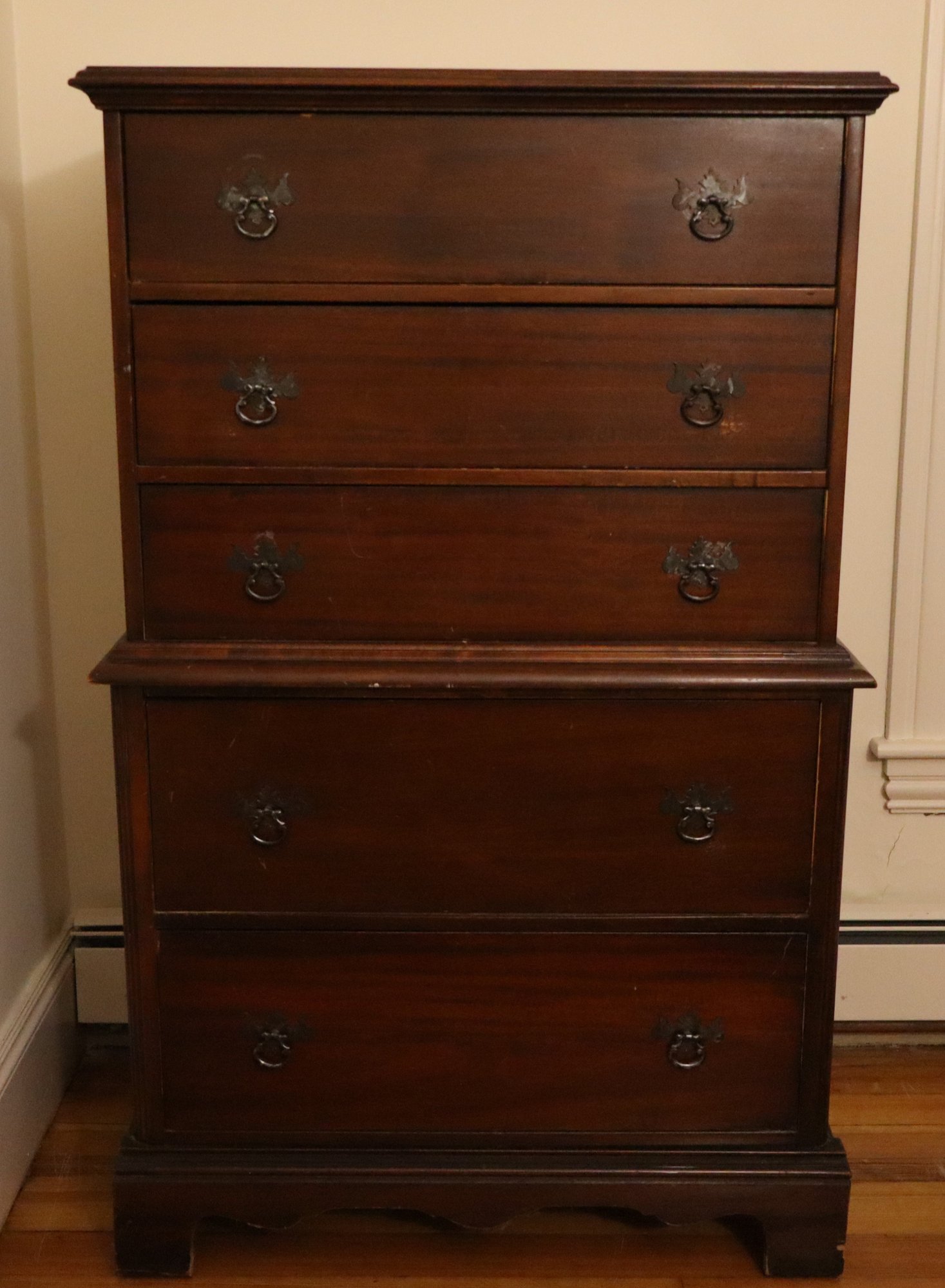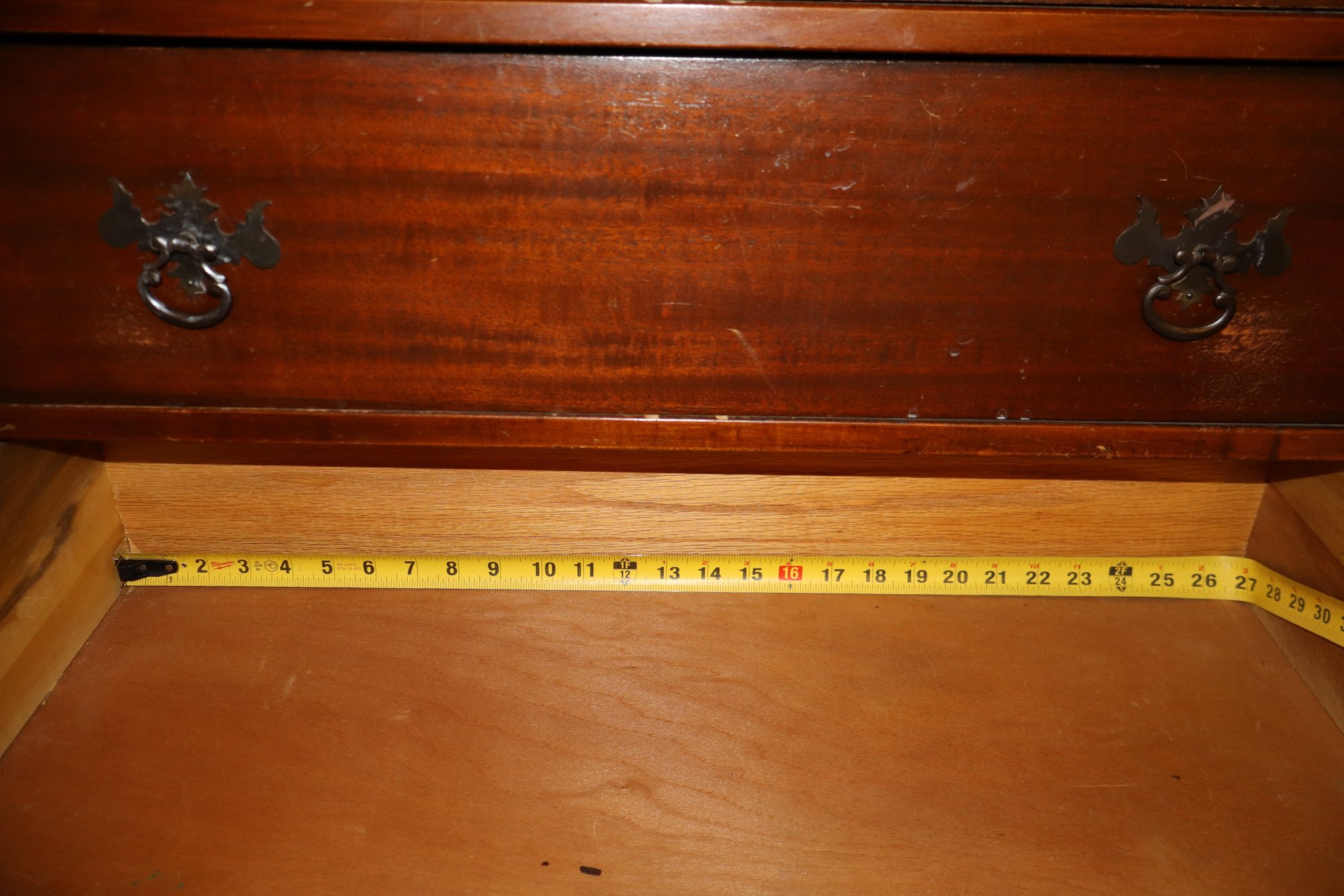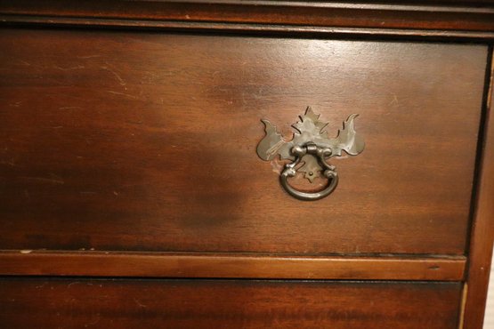 Features 5 drawers with dovetail joints, bracket feet with scalloped apron & brass drop bail pulls