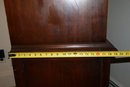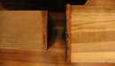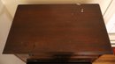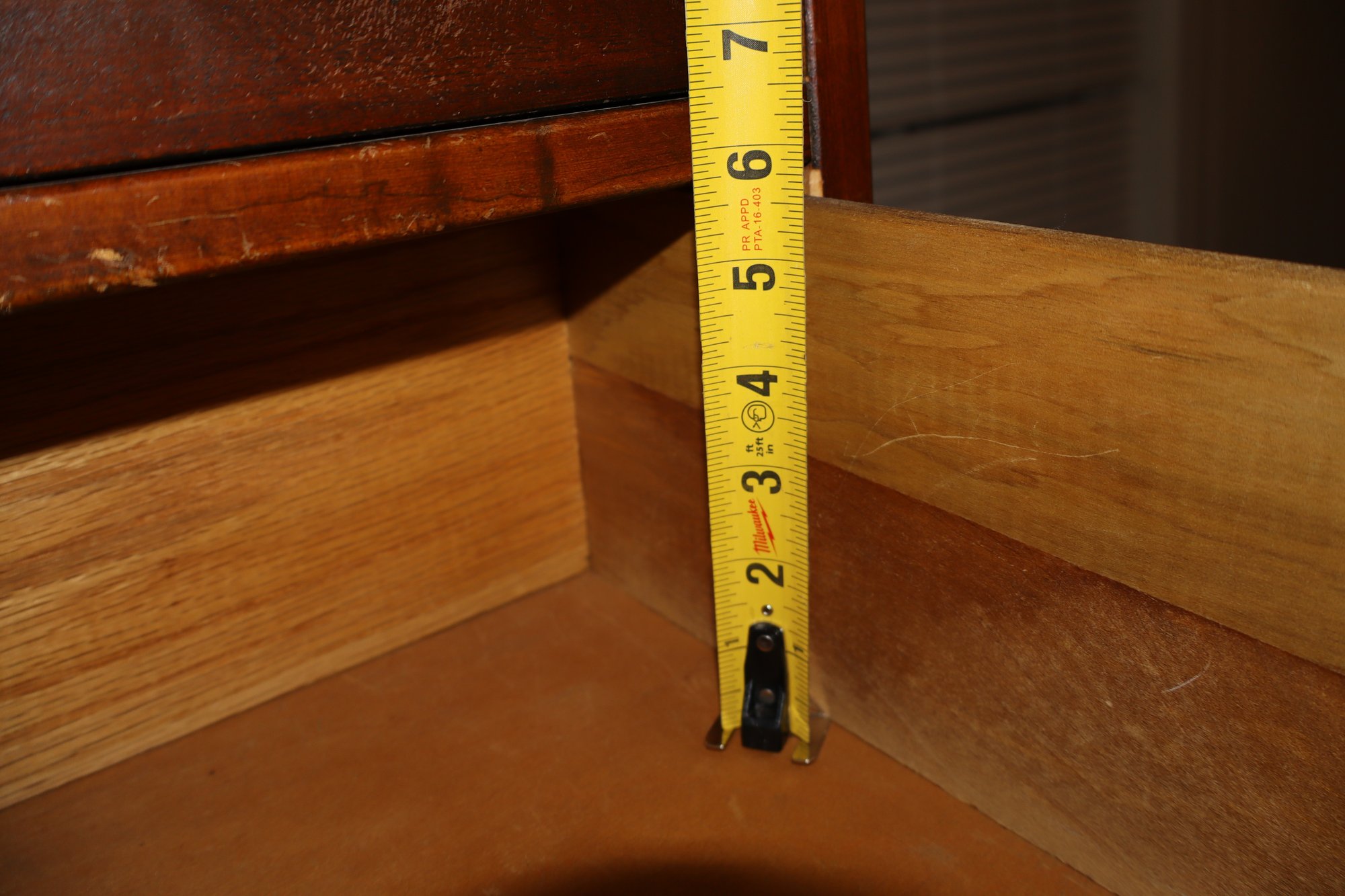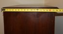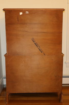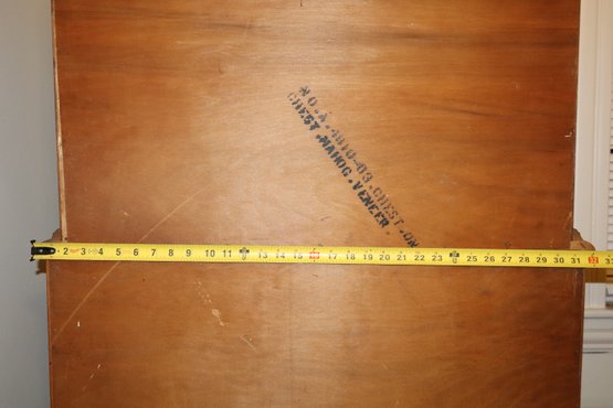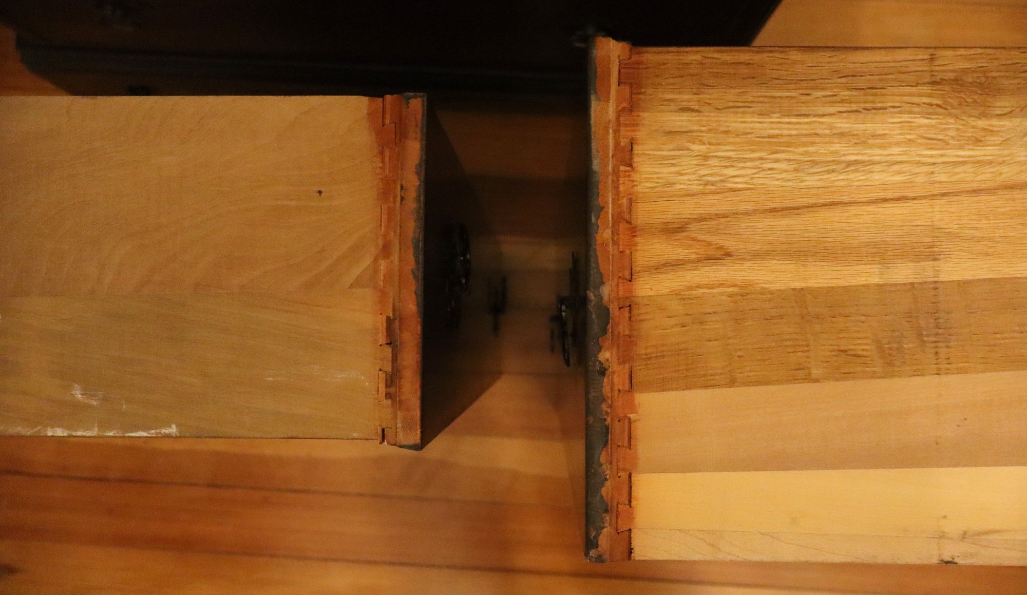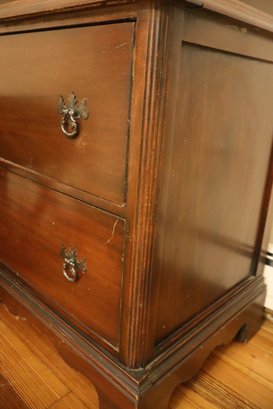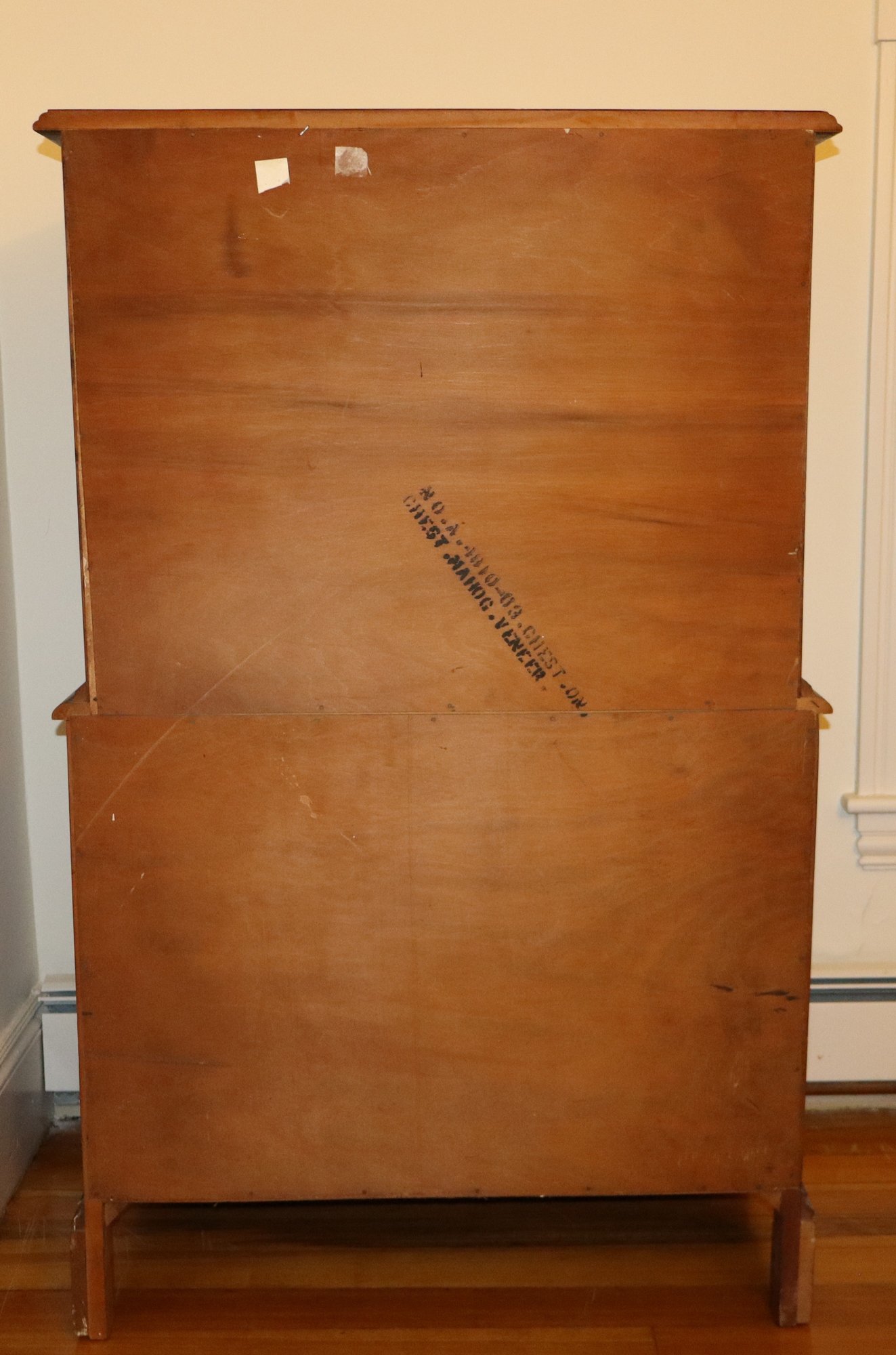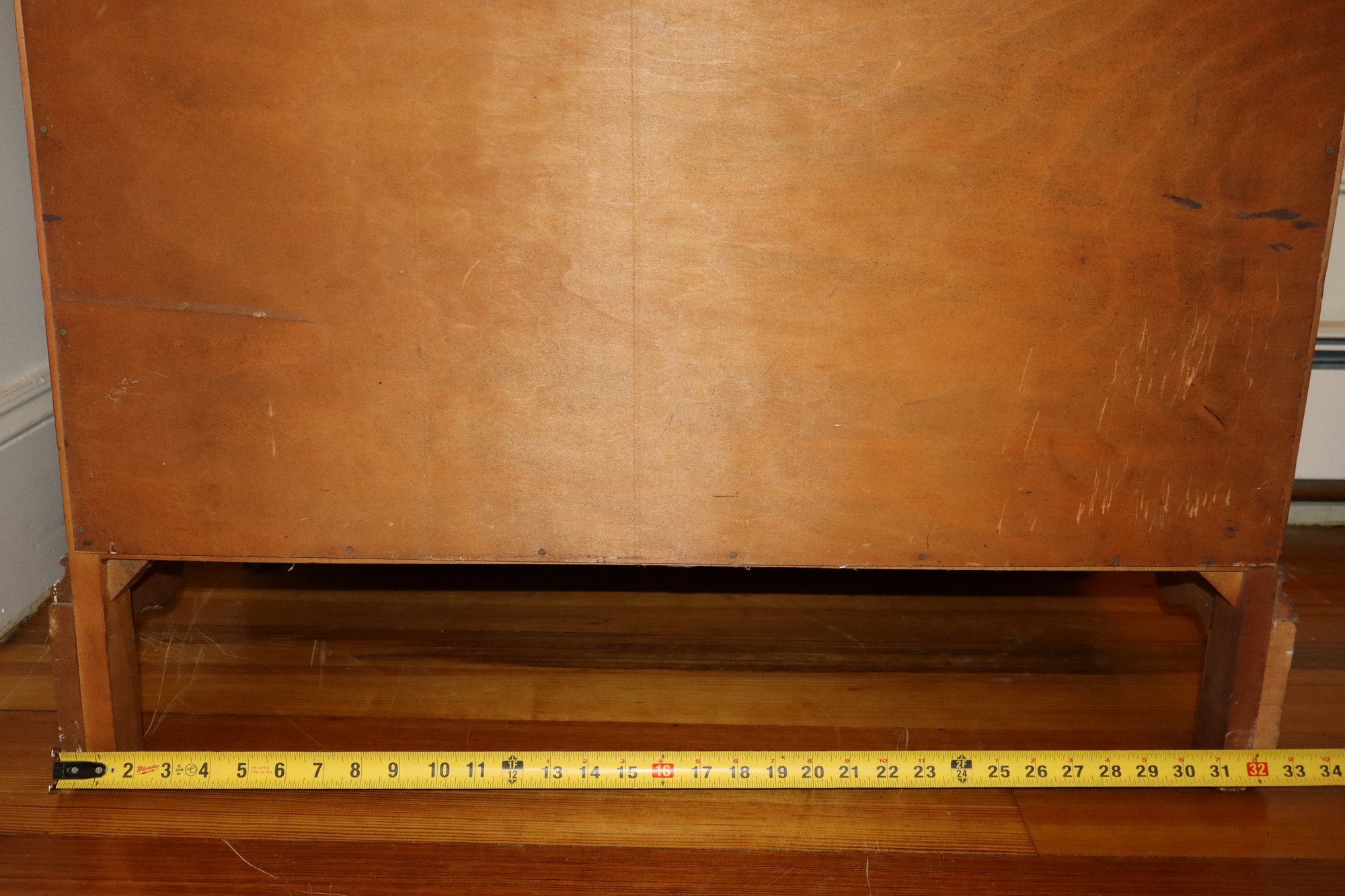 Features 5 drawers with dovetail joints, bracket feet with scalloped apron & brass drop bail pulls