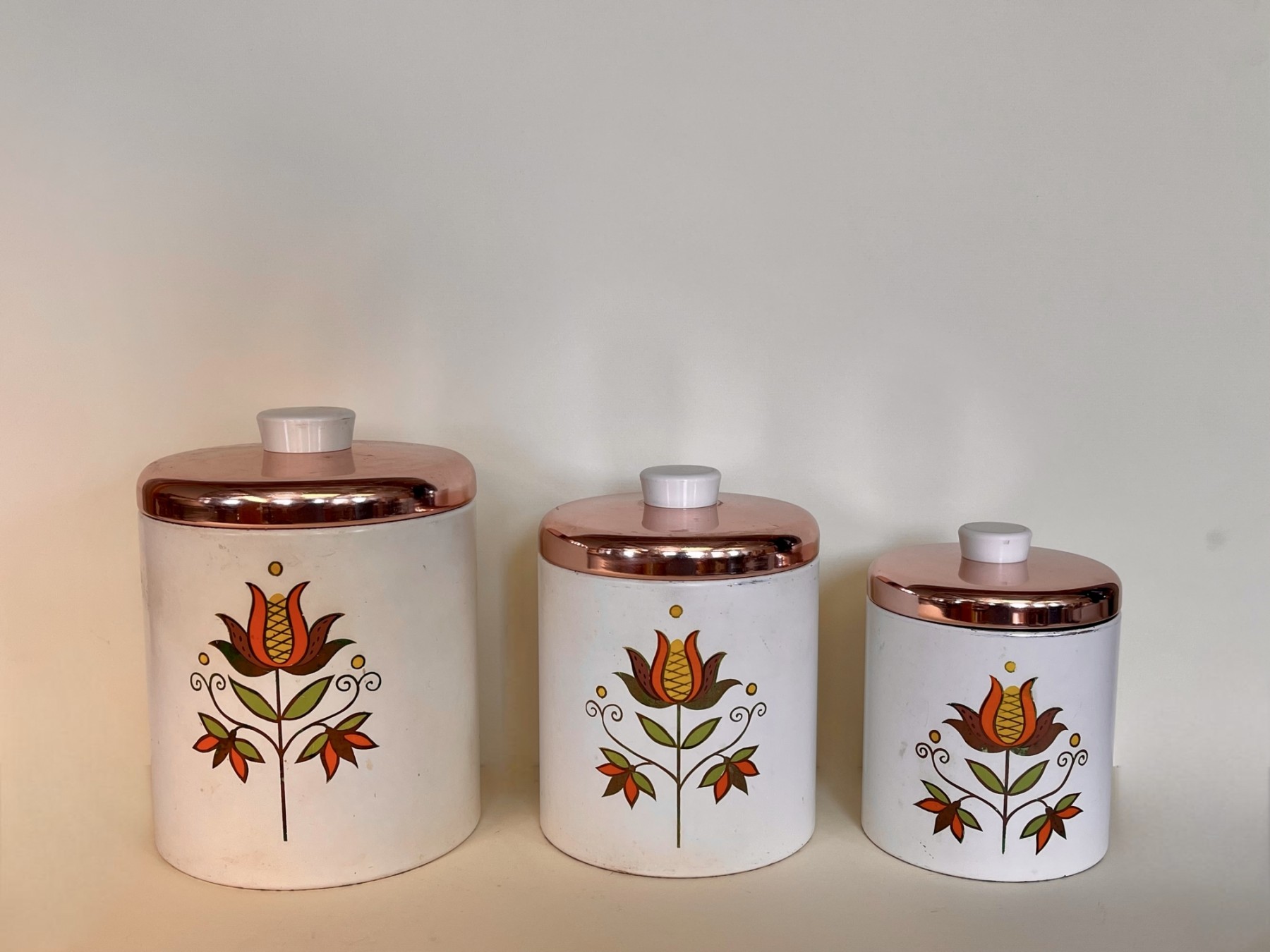These are such a great MCM throw back. The danish modern look with the copper toned tops and vintage floral print are a great addition to your kitchen decor. The largest measures 9 inches tall with a 7 inch diameter. Middle is 8 inches tall with a 6 inch diameter and smallest is 6.5 inches tall with a 5 inch diameter. As seen in photos, some scuffs in areas and the smallest canister lid doesn’t sit completely flush but adds to its vintage charm.