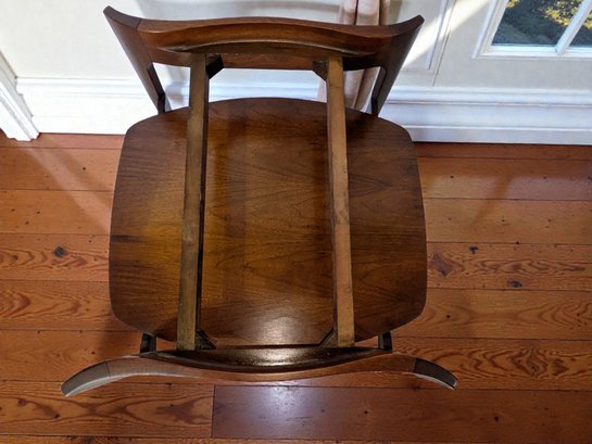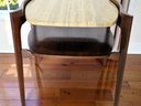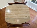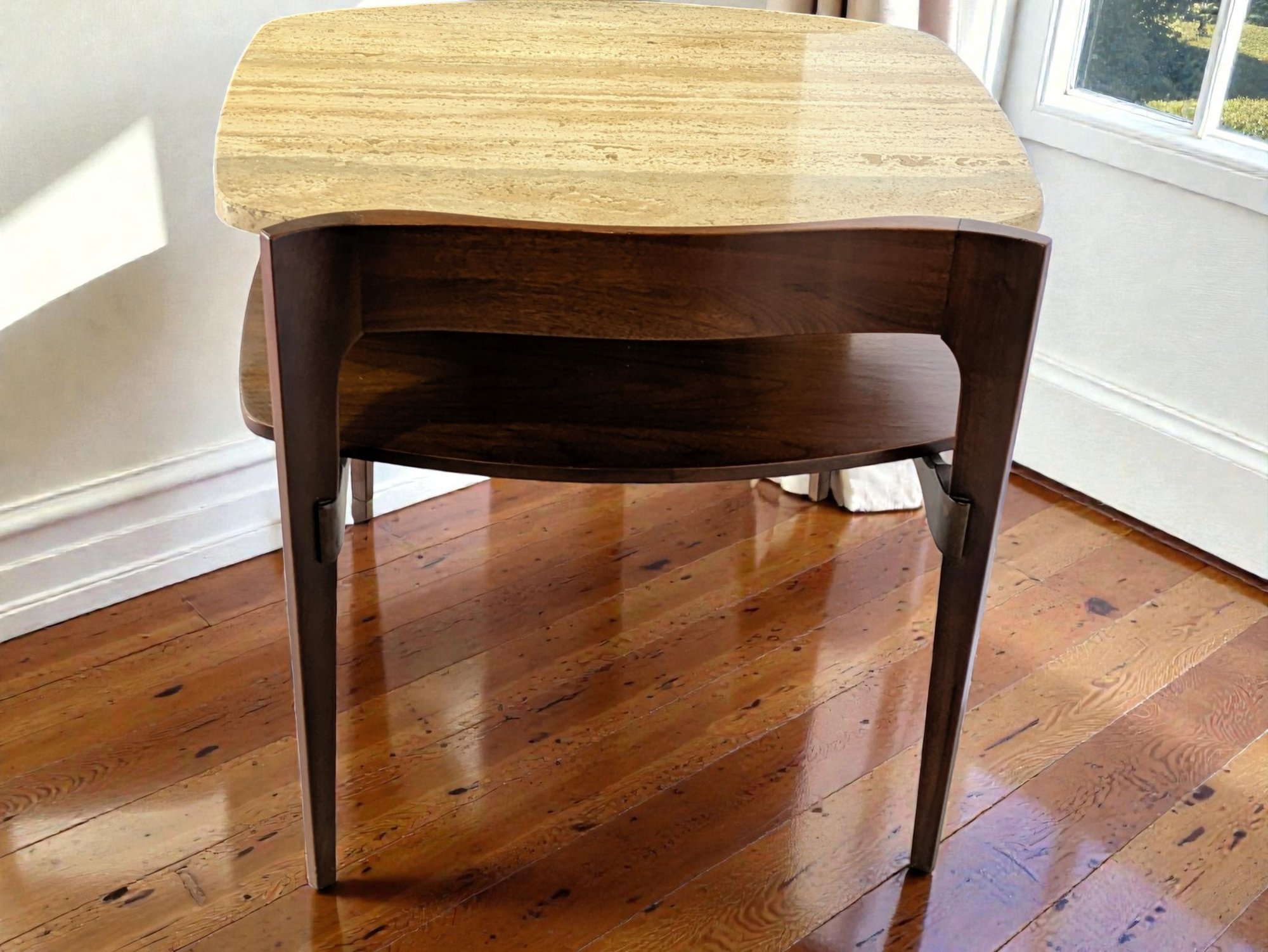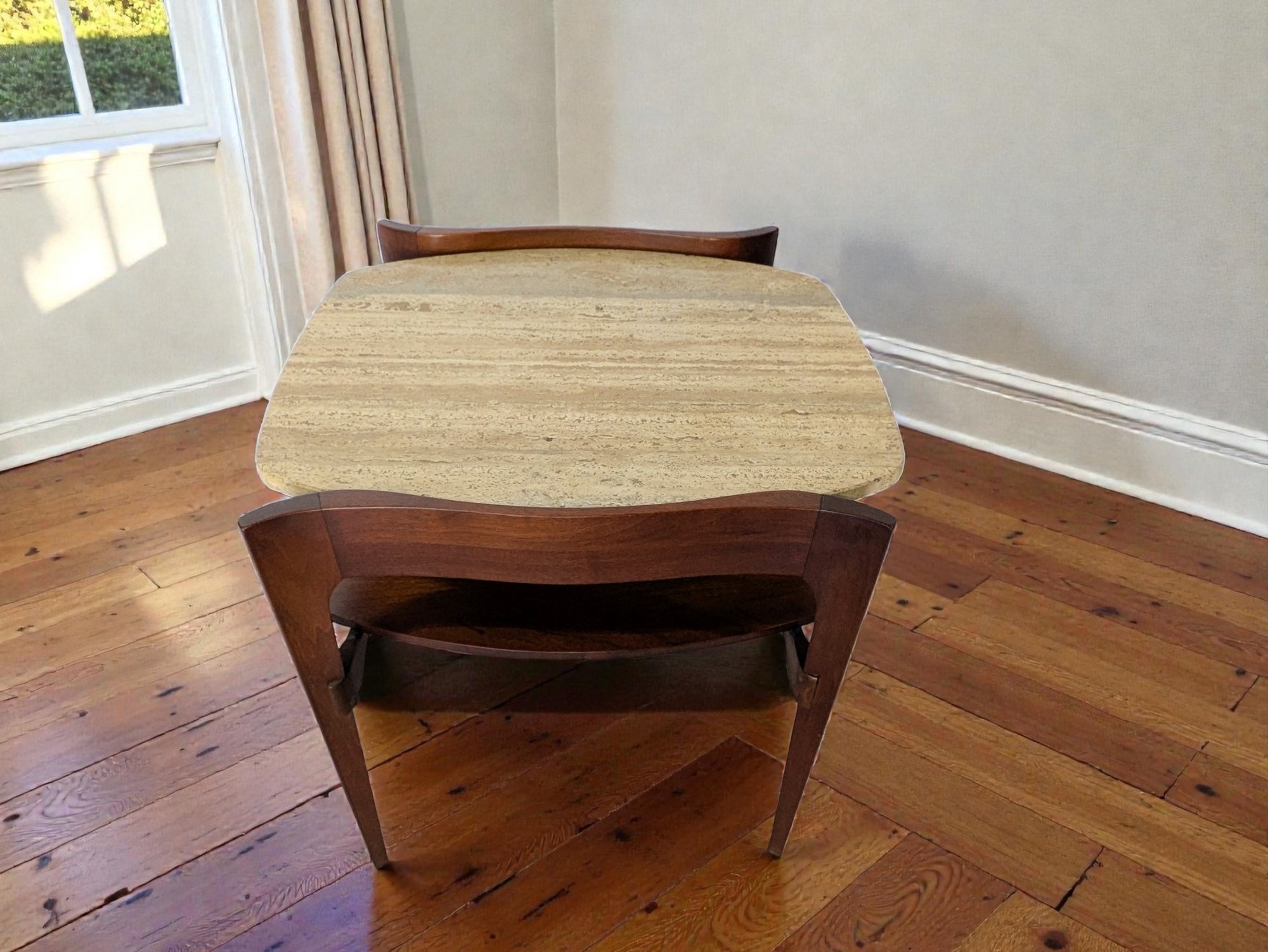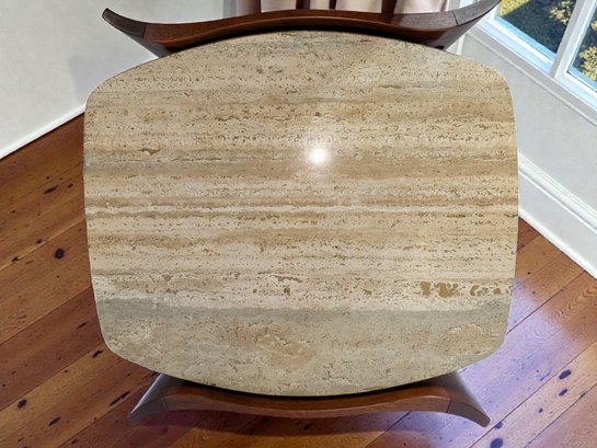 Sculpted Design MCM Walnut & Italian Travertine Side Table. Solid Walnut with Italian Travertine Stone Inserted Top and Wood Bottom Shelf. Beautiful Detailing with Clean Line Design. A couple of light marks, consistent with age and use, easily filled in with stain renew. Overall, Very Good Condition. Please see all photos as part of the description and condition. 23W x 22.5"H x 24"D.