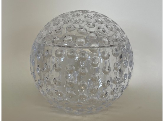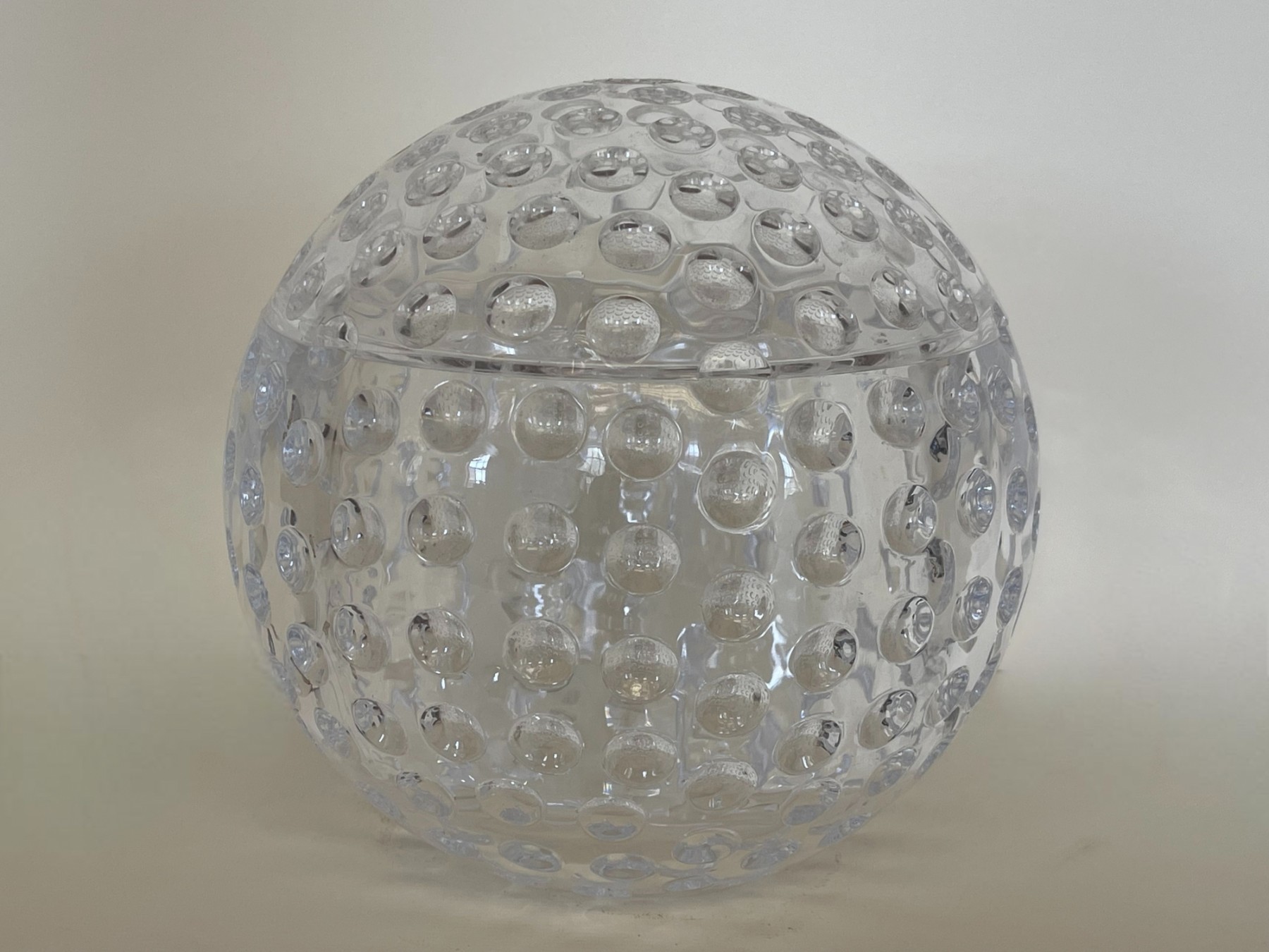 A fantastic MCM Vintage lucite grainware Mario Luca ice bucket with a golf ball design. The top swivels to the side. There are controlled bubbles within each divet, so cool! Love the amazing hues coming from the lucite. It measures 8 inch diameter.
