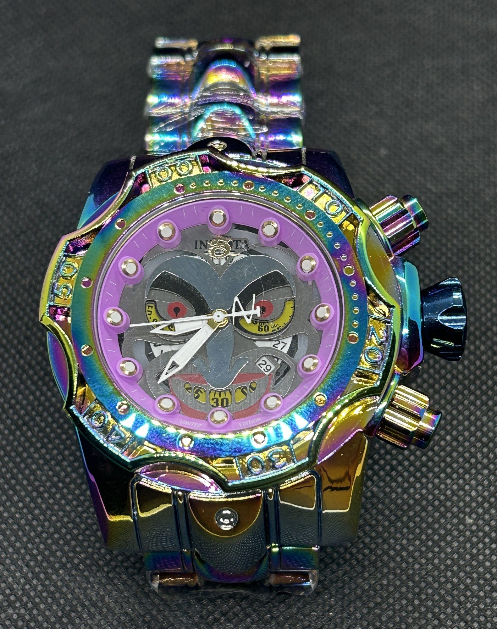 This is a HUGE watch, with 53mm case diameter, not including the the crown and pushers! Made in a limited edition in conjunction with D.C. Comics, this is the JOKER RESERVE chronograph, with iridescent case and band and face of joker as the dial [his eyes and mouth are the chronograph's sub-registers]. It is still in shrink wrap, BRAND NEW/ never worn. Highly collectible watch, with a unique aesthetic. Originally, it was quite expensive. We are opening it for $1 with no reserve.