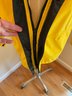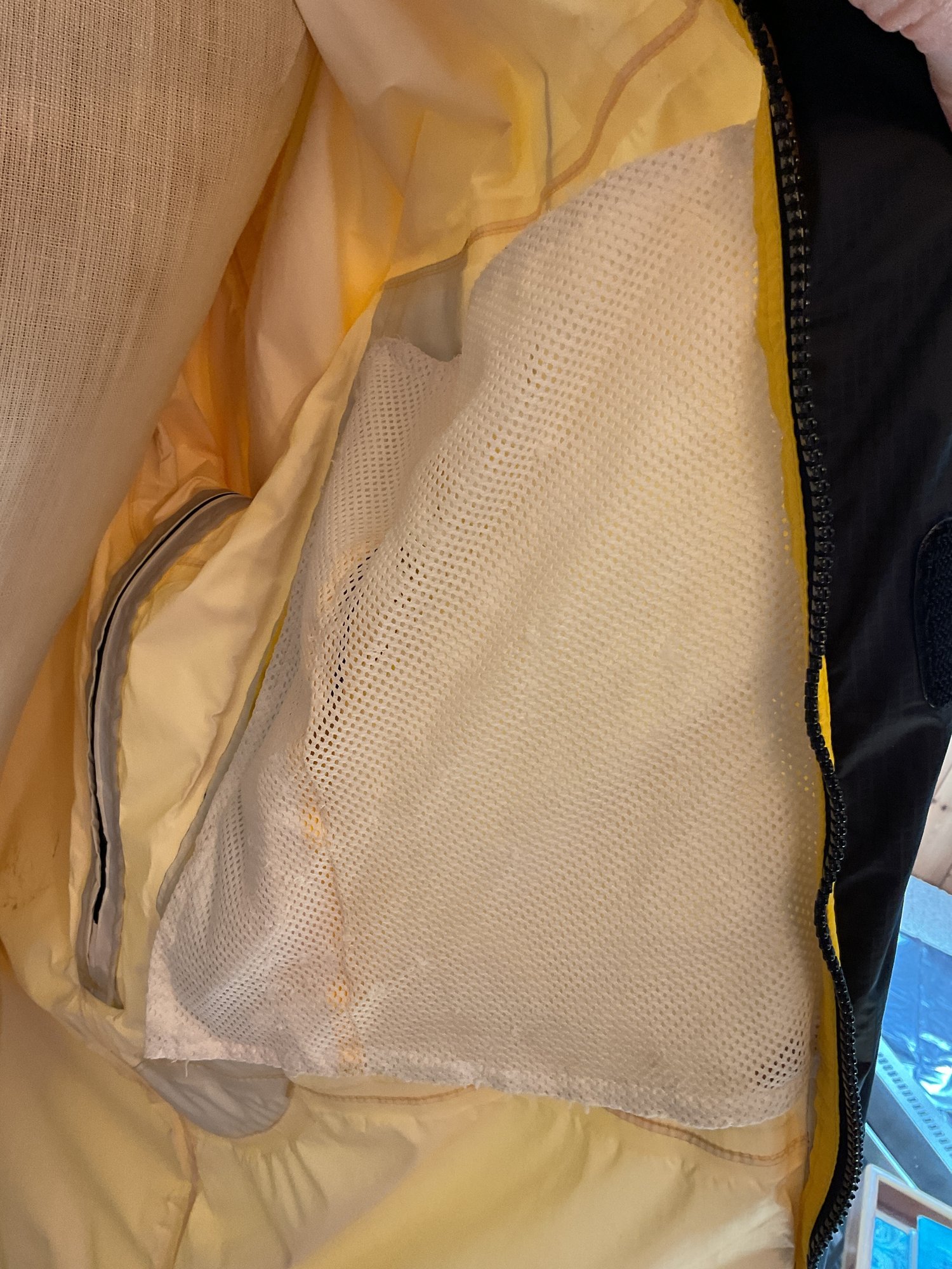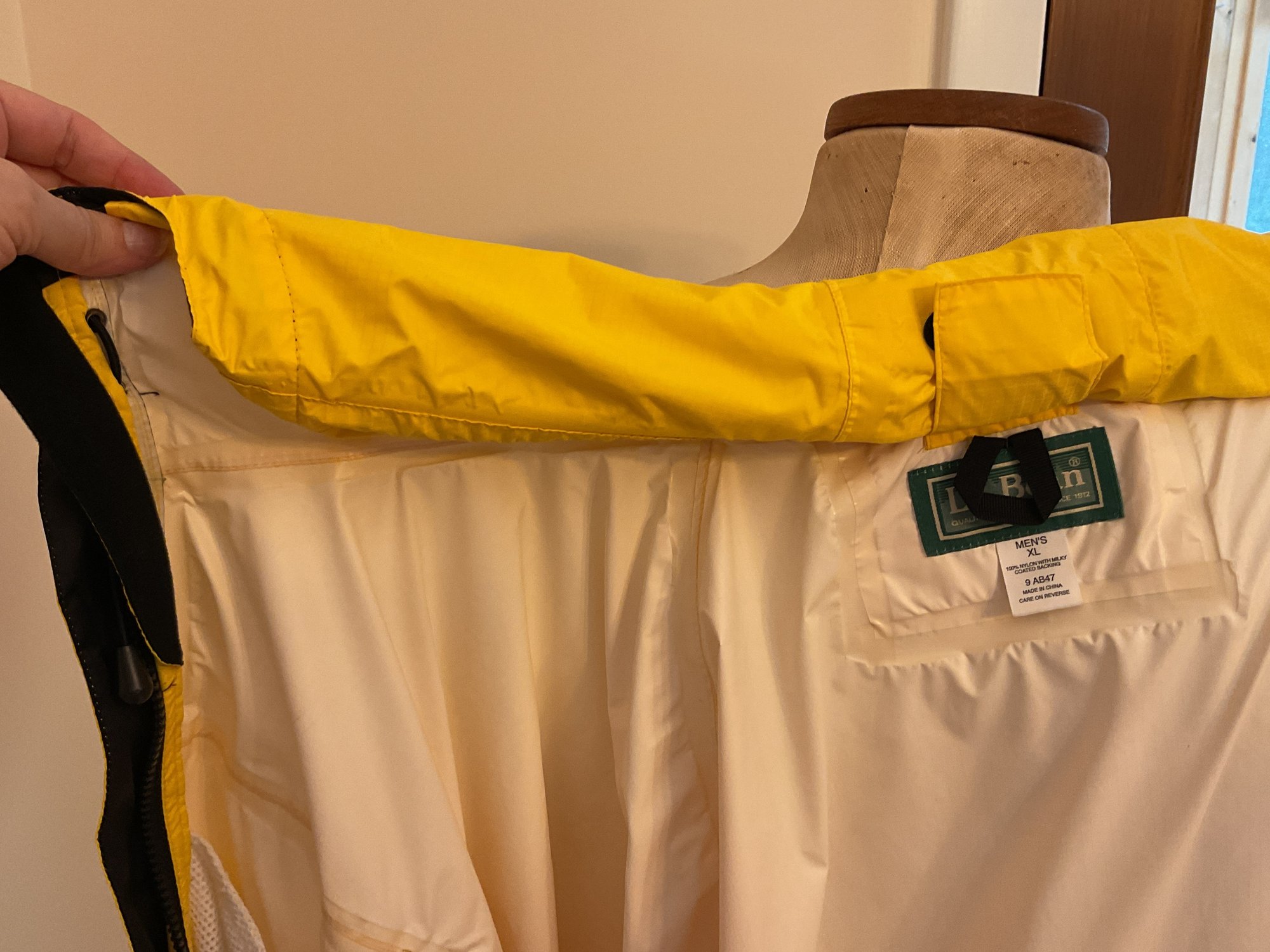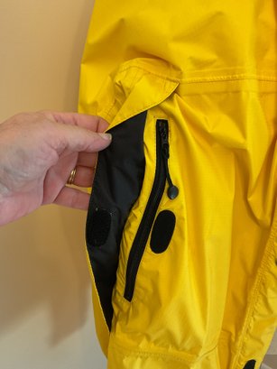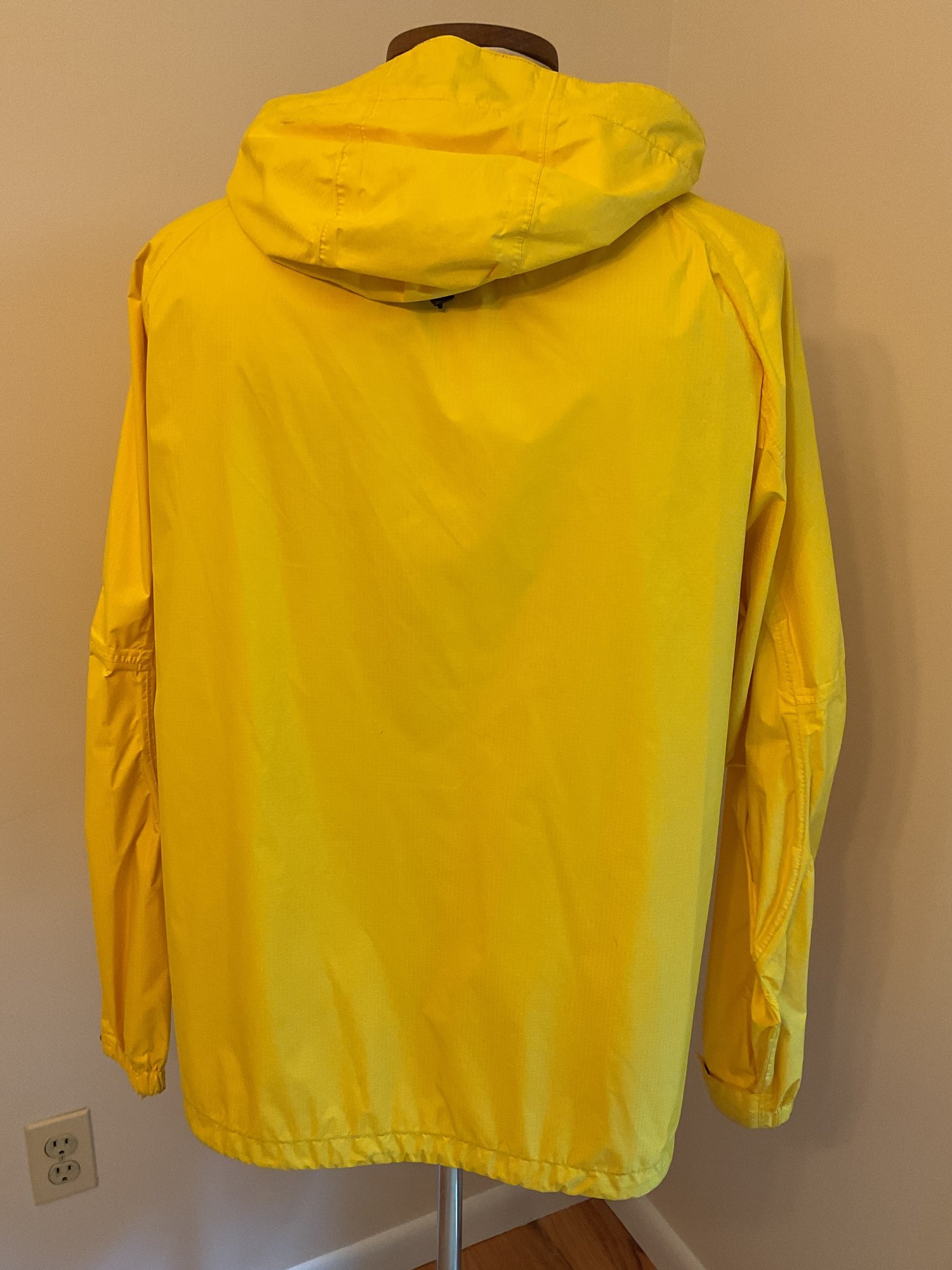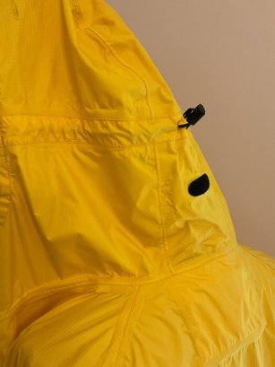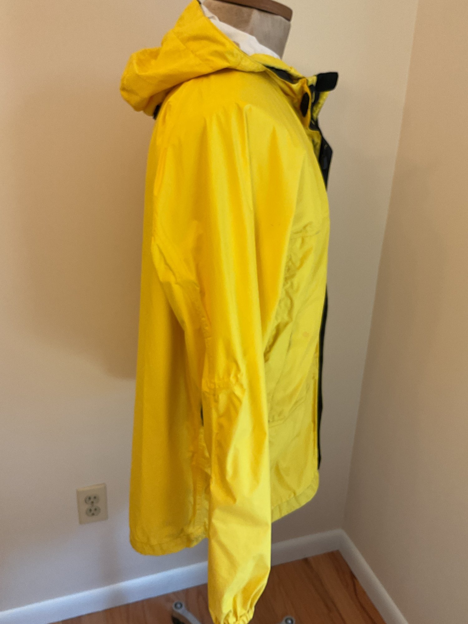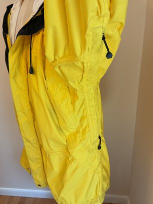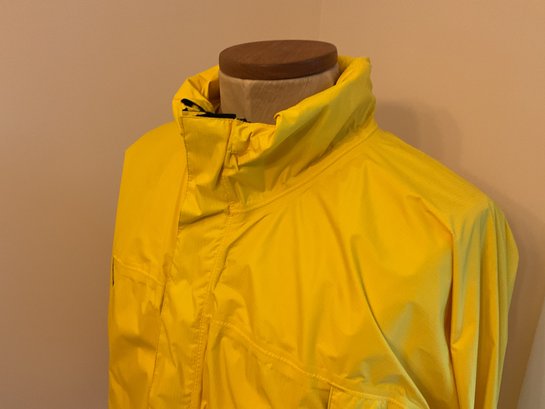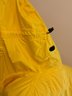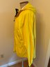 Lightweight men's raincoat in bright yellow for visibility. Zip front with velcro zipper cover, attached hood rolls up and stores as a collar. Two front pockets, adjustable hood, plus pit zips for breathability. Excellent condition.