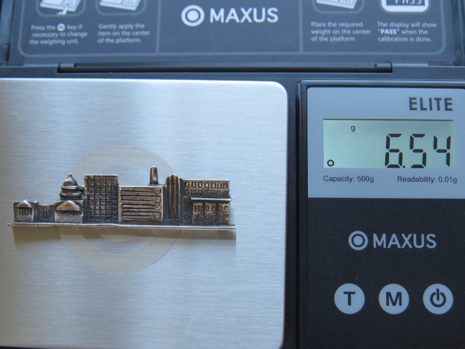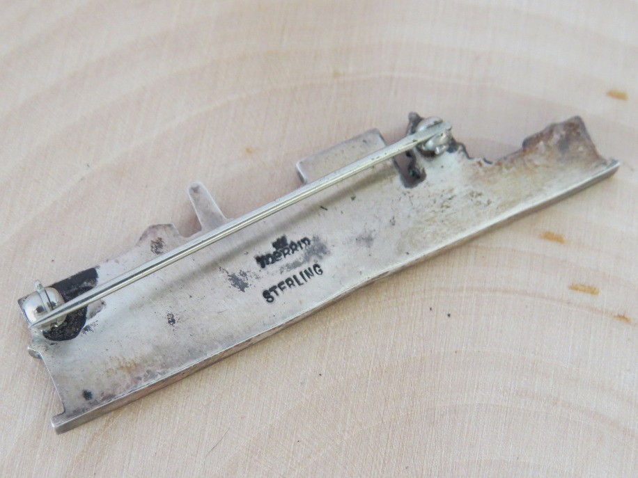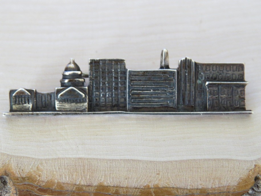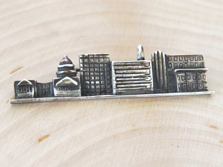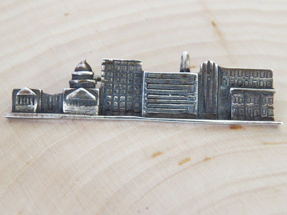 Wonderful city scape bar pin created by Merrin, New York City. Pin is marked Sterling, Merrin on the back and has a working clasp. Weighs 6.54 grams.