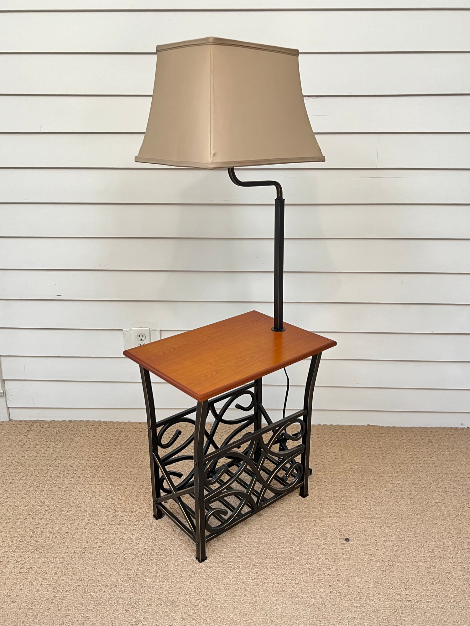 20” by 14” wood top, 23” height. 53” total height.