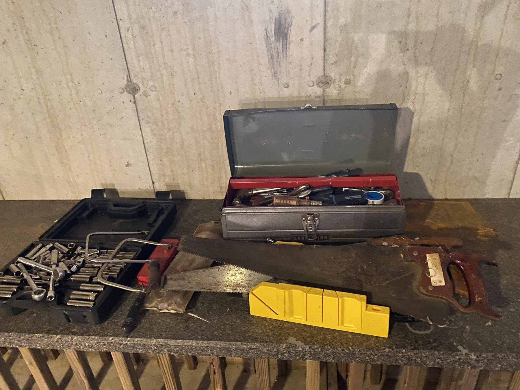 Tons of hand tools, vintage tool box, screw drivers, mitre box and saw, hack saws, flashlight, and much more!