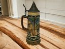 This antique stein portrays the capturing of a rabbit poacher. It was probably painted by Matthias Girmscheid at the turn of the century. Back marked. the is a small chip on the decorative rim near the handle, and the pewter thumb latch has been repaired where is joins the lid.