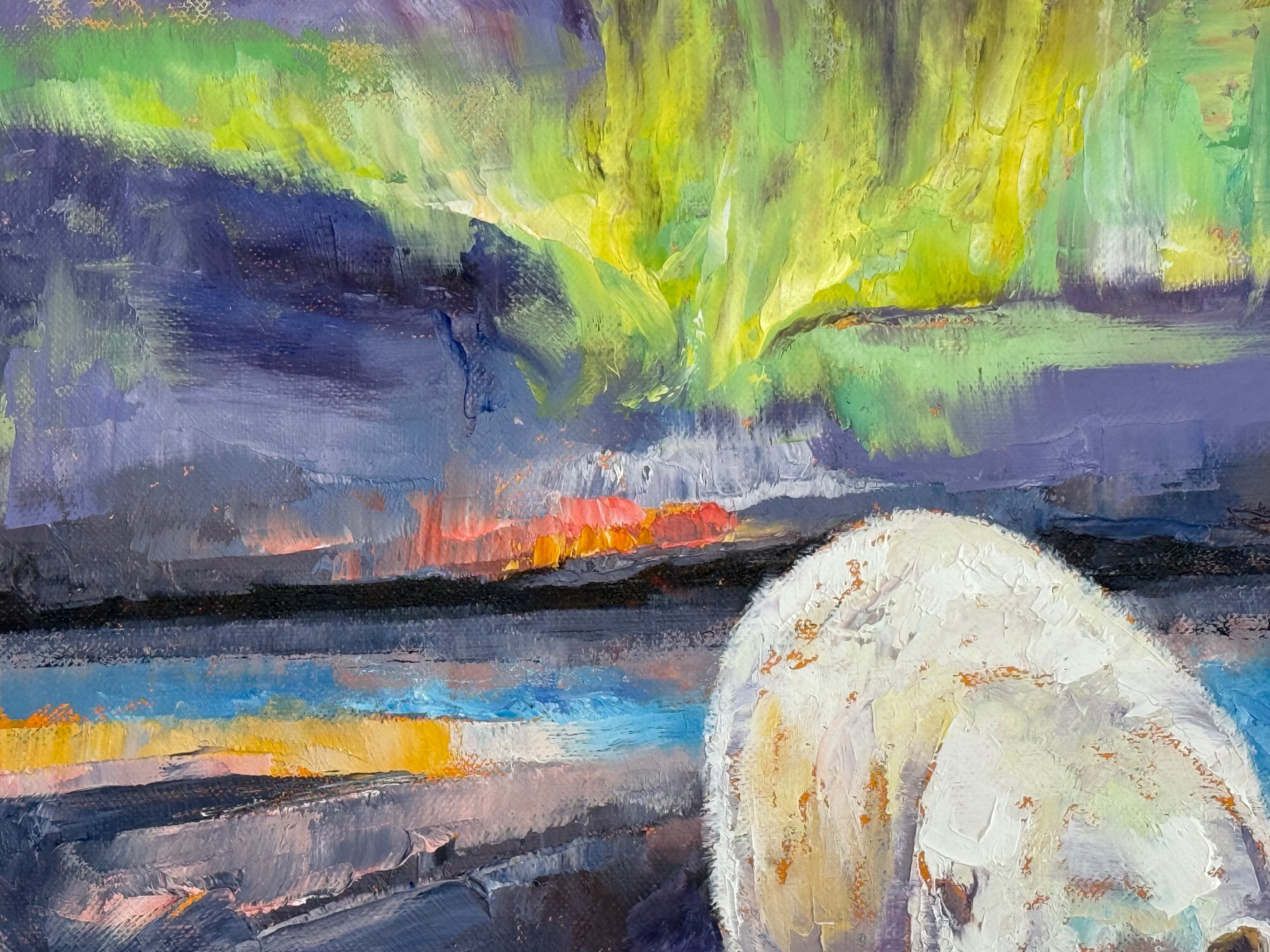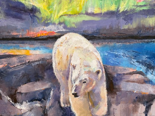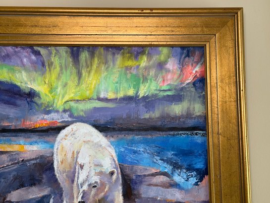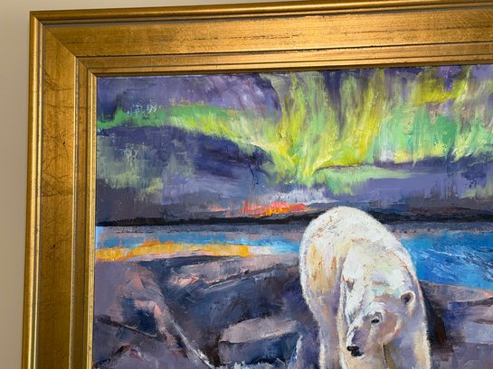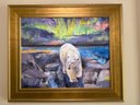 This beautiful original oil painting features a polar bear in the foreground with the aurora borealis in the background.
