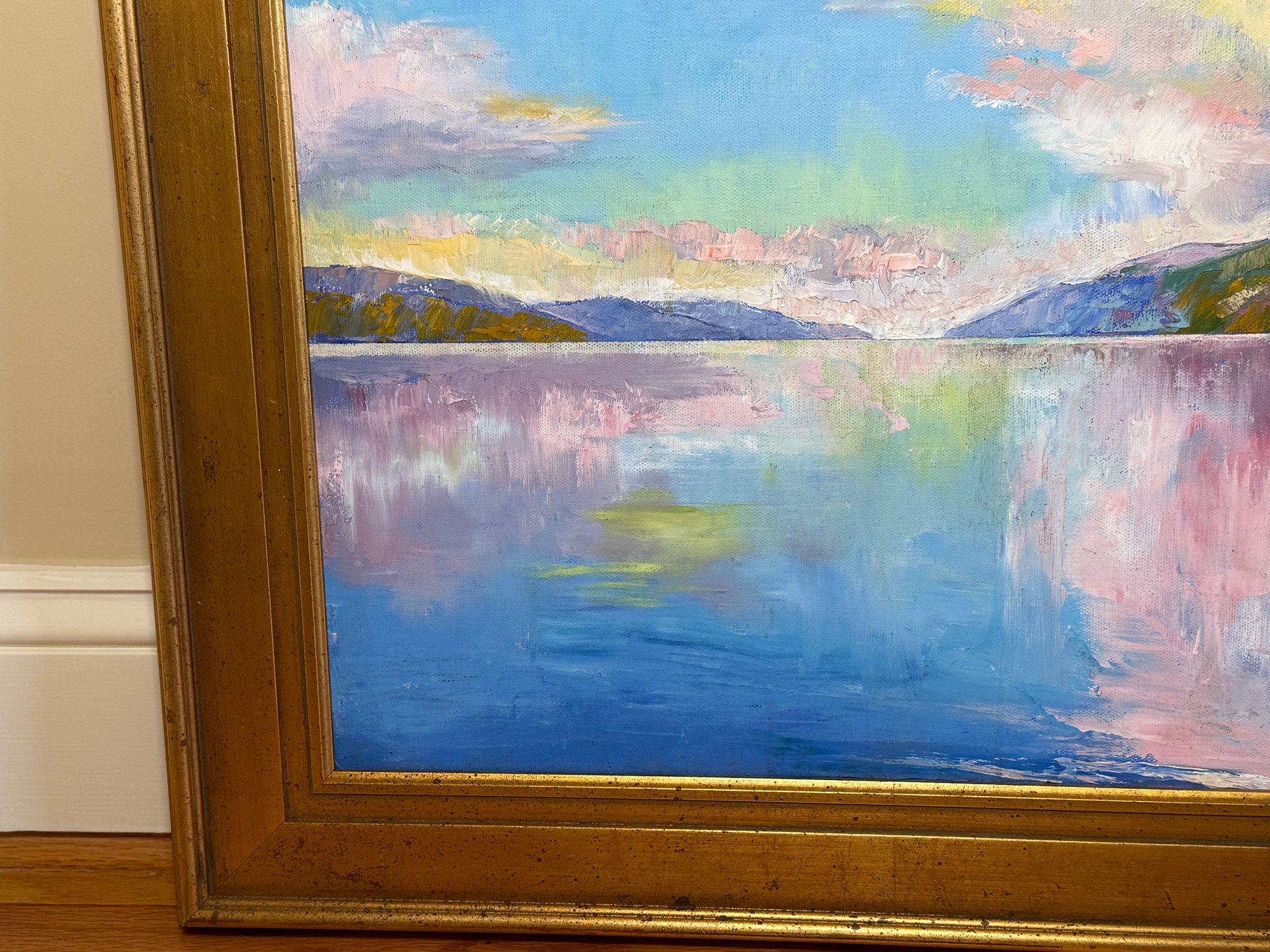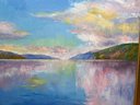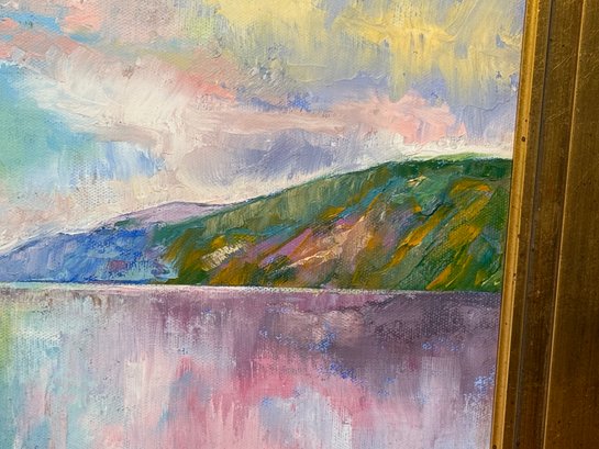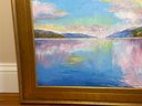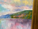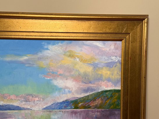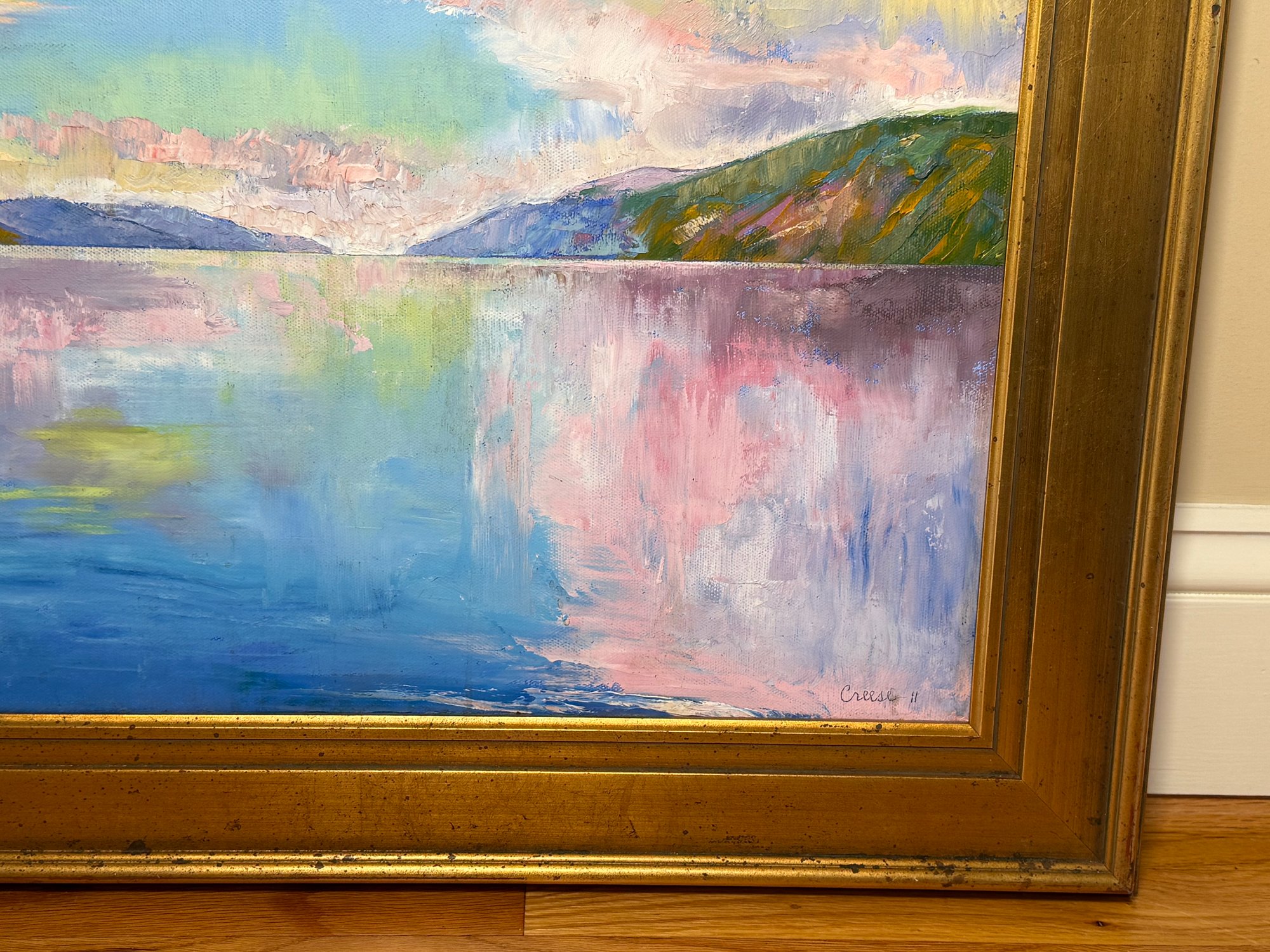 A beautiful and serene original oil painting by Michael Creese featuring a Nordic landscape. It has amazing calm colors and nice texture. It is signed bottom right hand corner. Pretty gold painted frame.