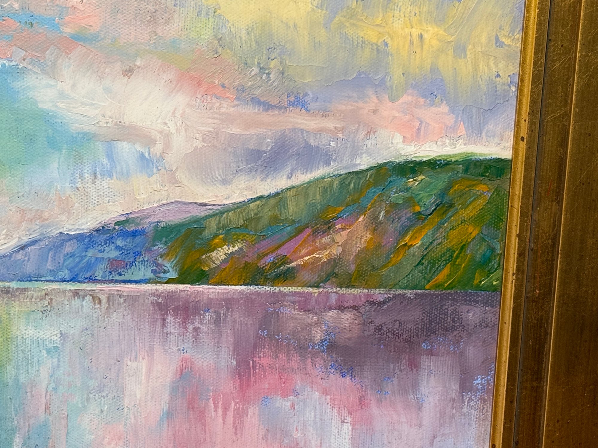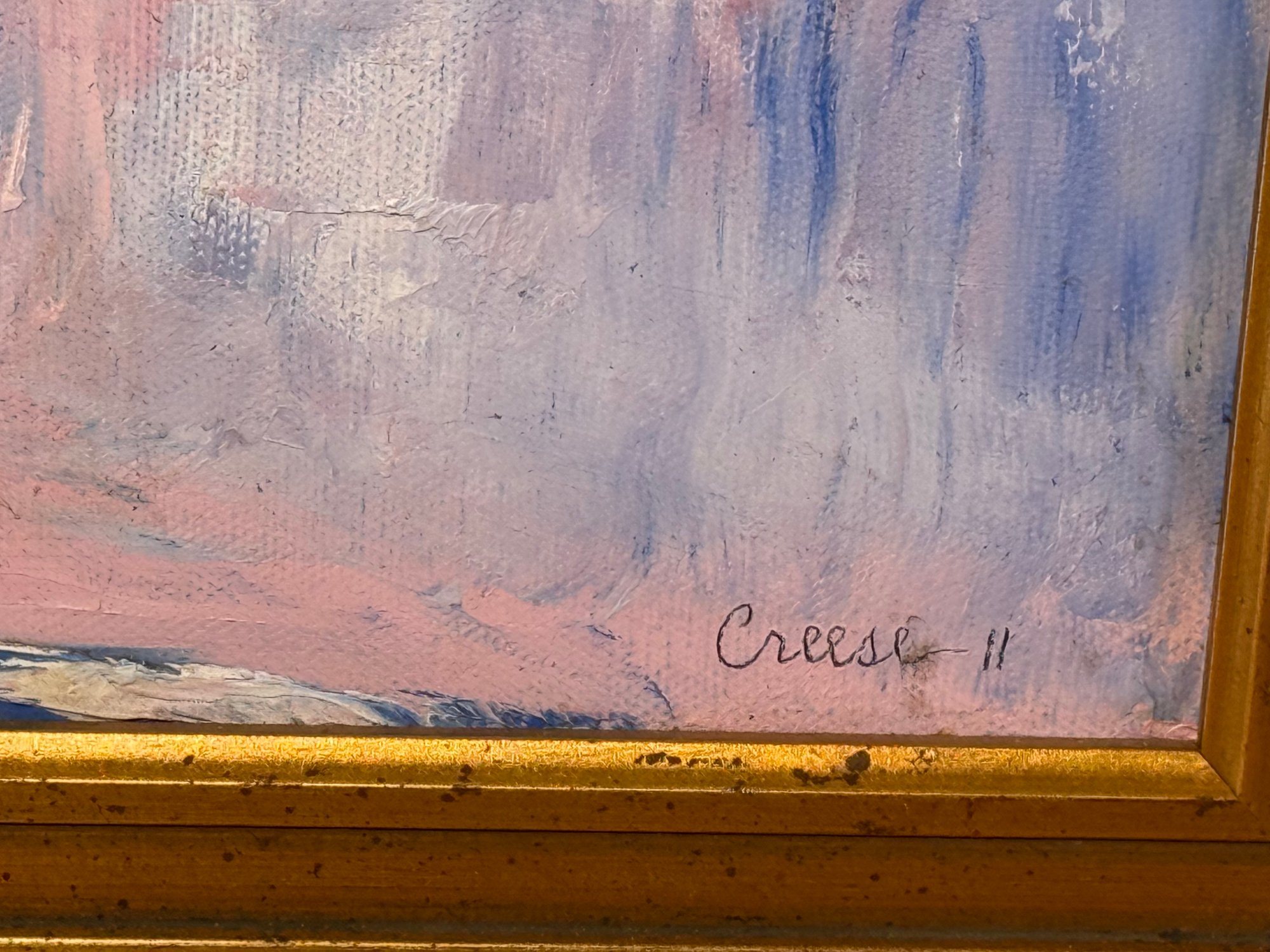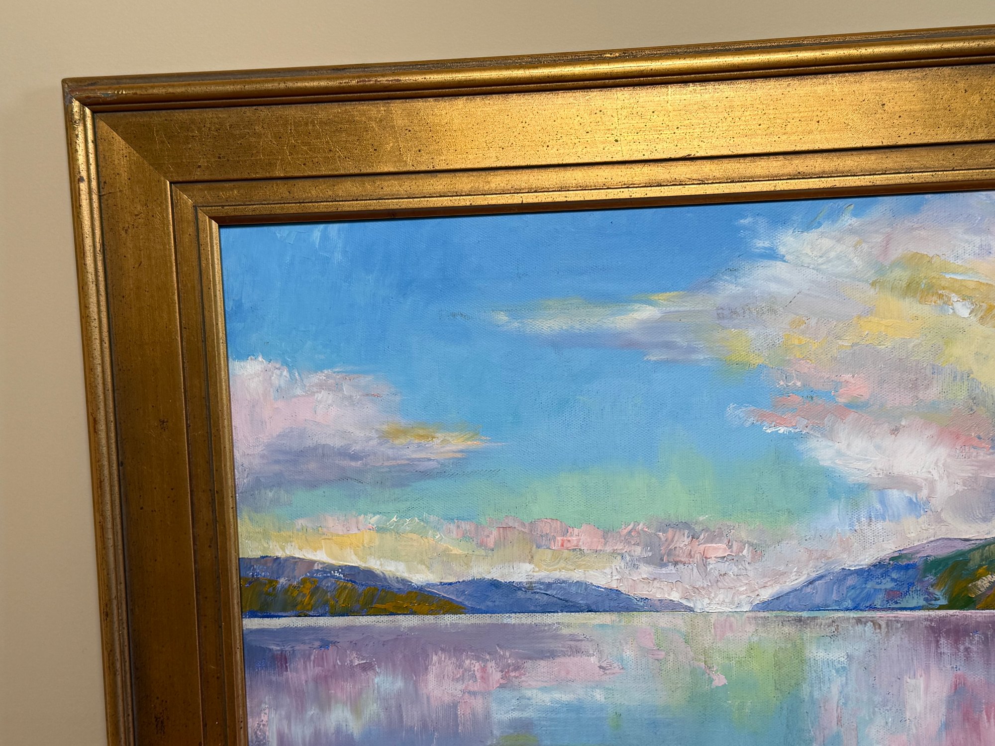 A beautiful and serene original oil painting by Michael Creese featuring a Nordic landscape. It has amazing calm colors and nice texture. It is signed bottom right hand corner. Pretty gold painted frame.