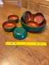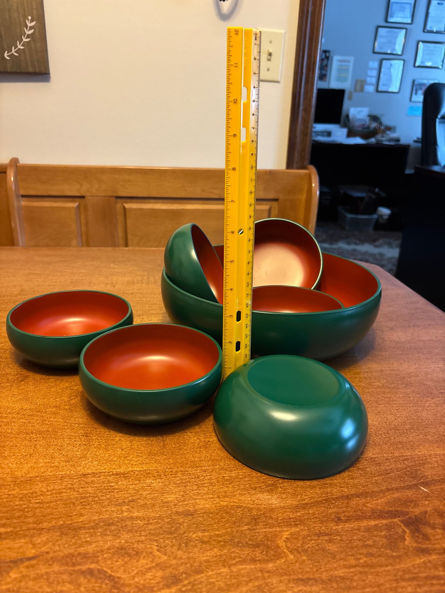 This specific color combination—a deep teal/seafoam green exterior paired with a burnt orange or "terracotta" interior—is a classic MCM palette. These sets were popular imports from Japan and are often made of lacquered wood or high-quality melamine (plastic) designed to mimic the look of traditional Urushi lacquer.