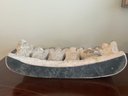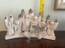 Charming one-of-a-kind ceramic folk art piece featuring a row of expressive, textured figures with arms joyfully raised, each topped with a hollow cup