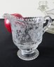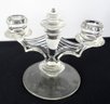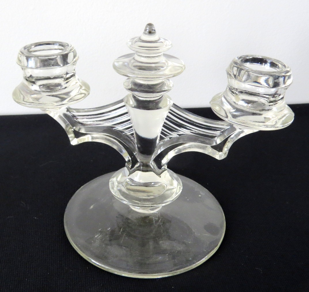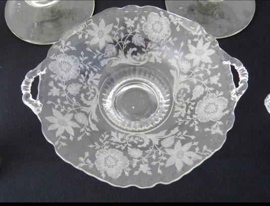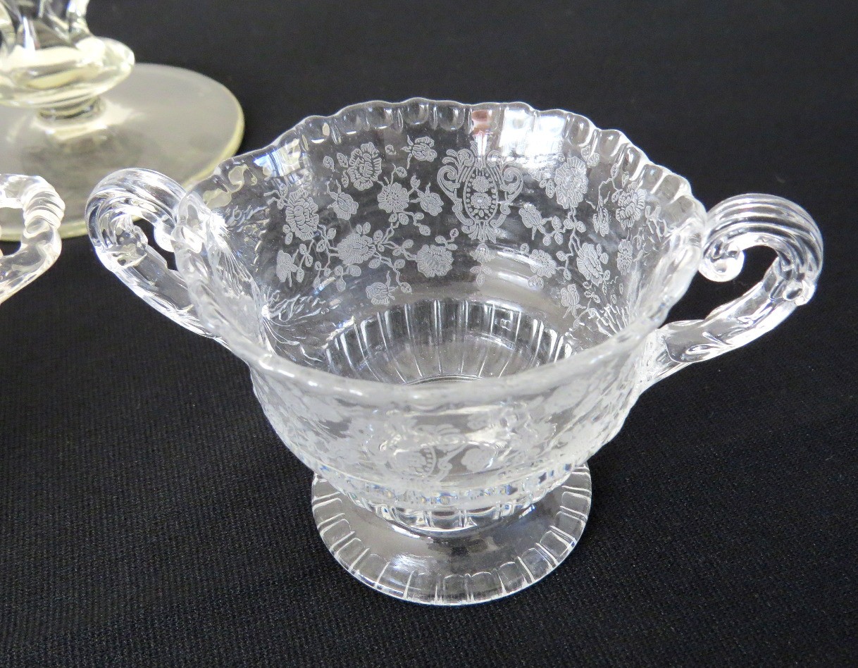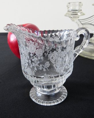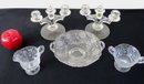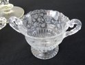 Five piece grouping including Cambridge Rose Point cream and sugar, Cambridge Wildflower pattern bowl and Tiffin Glass Candlesticks, all in good shape.