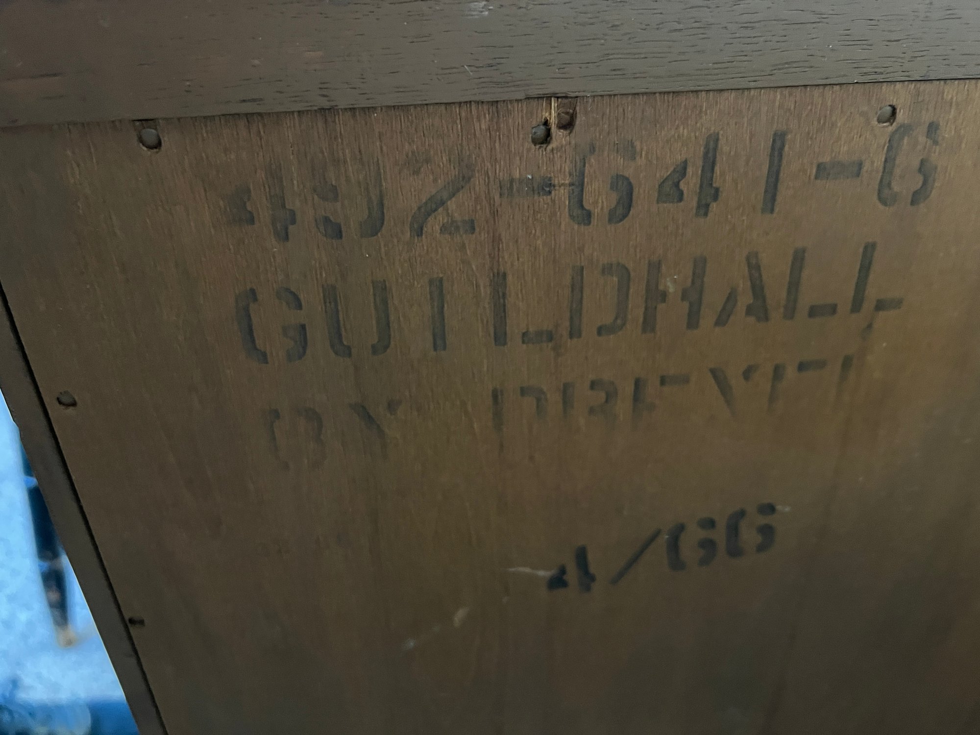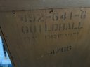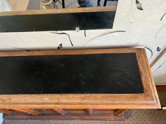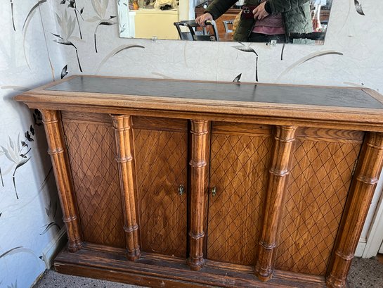 Smaller size sideboard or console cabinet with a mock bamboo and lattice motif at the front and a faux slate inset top, stamped Guildhall by Drexel dated 4/66 on the back.