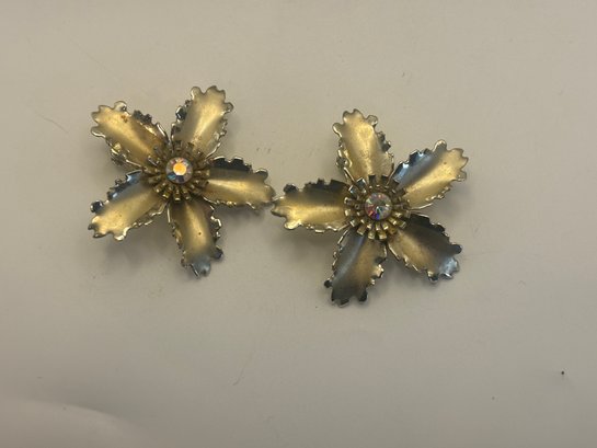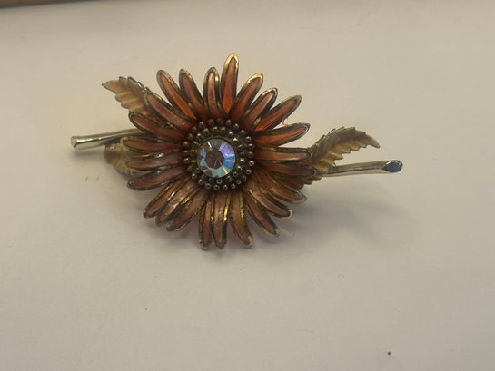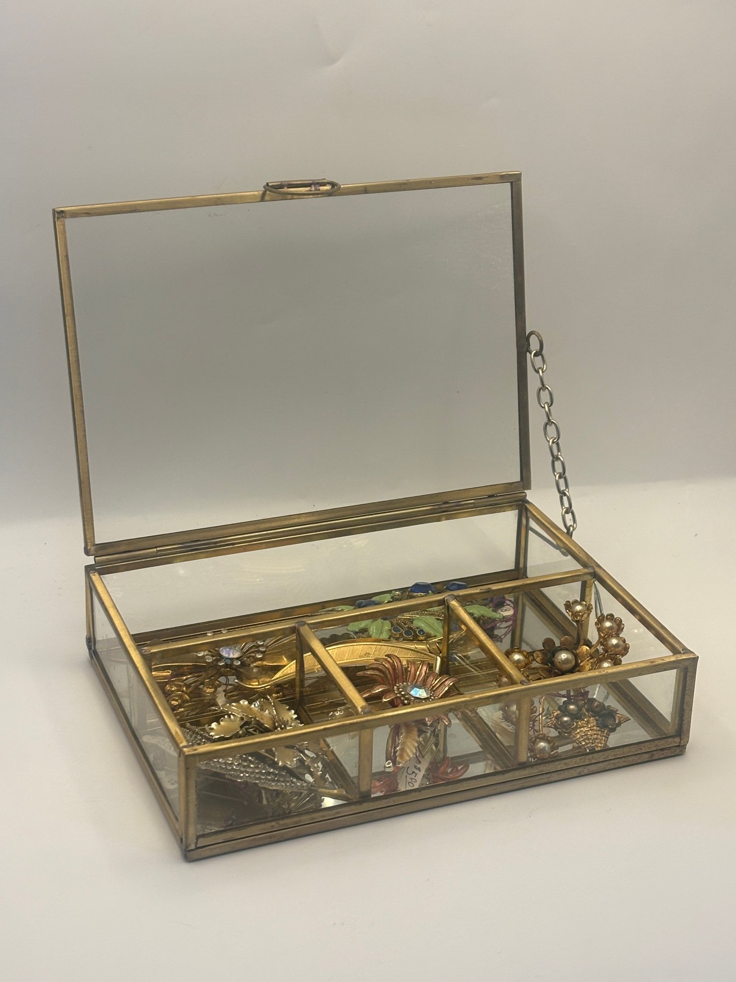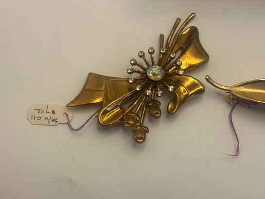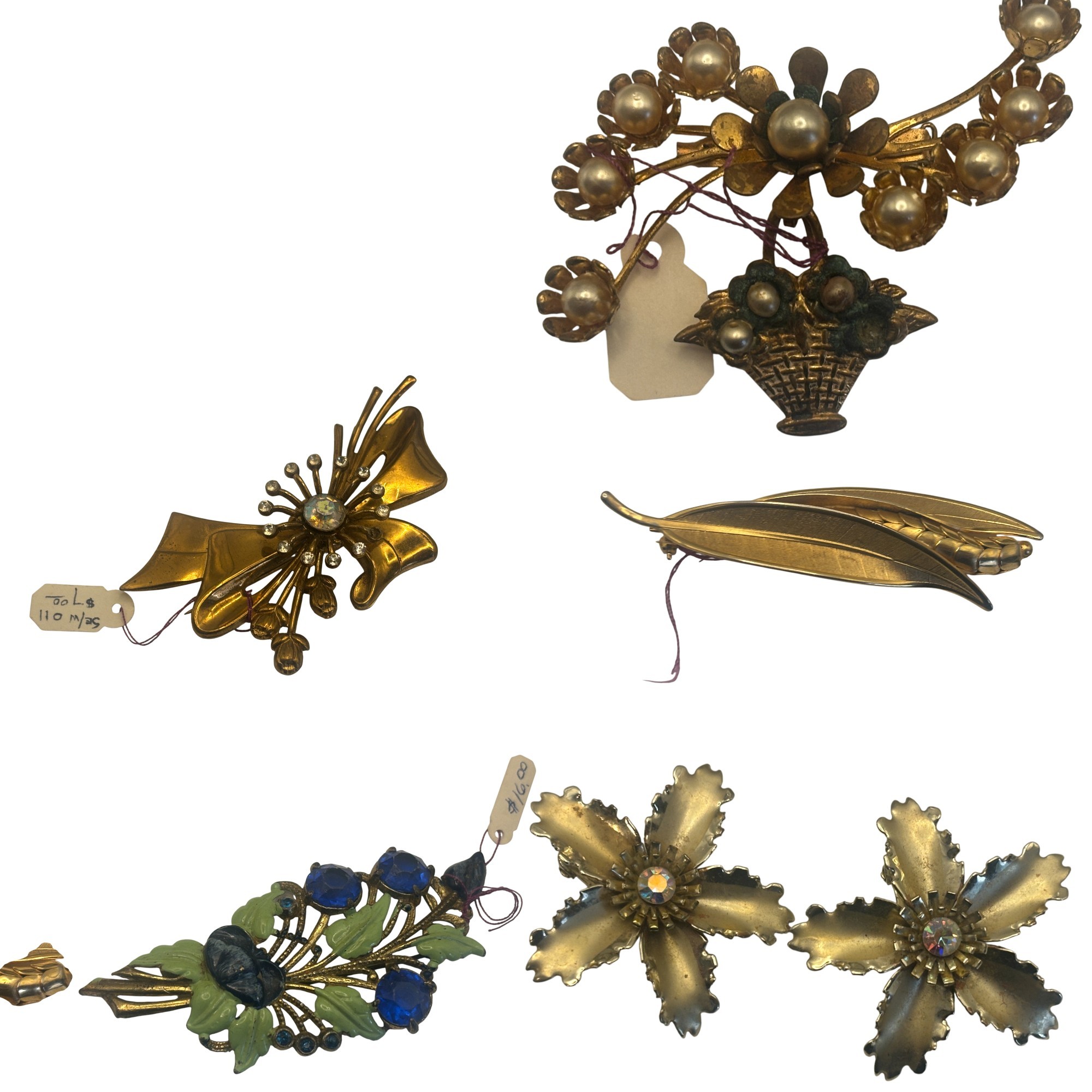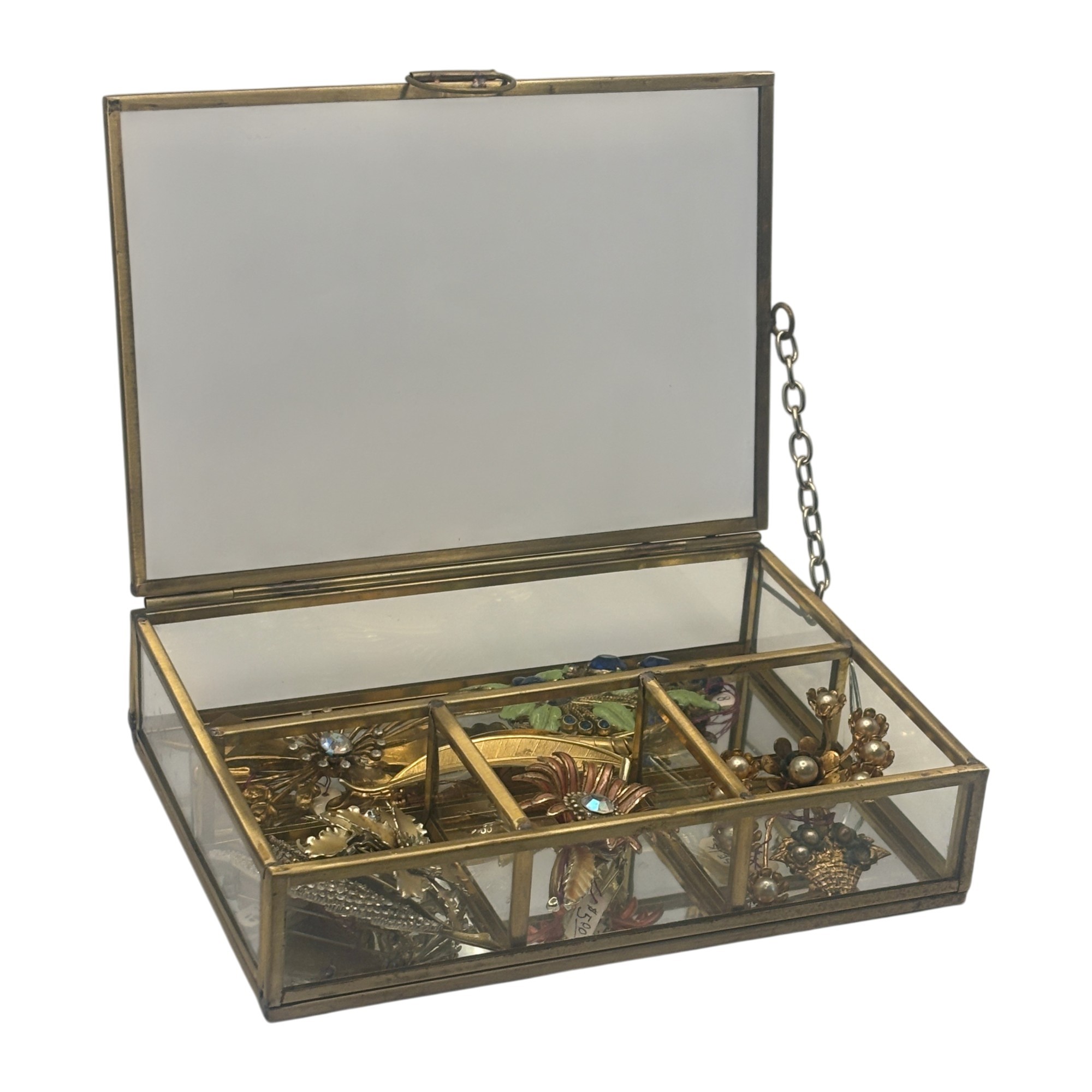 A true collector’s grouping featuring a glass-and-brass vintage jewelry box paired with eight mid century floral brooches, many retaining original collector or price tags. This curated assortment showcases dimensional gold-tone flowers, rhinestone-centered blooms, enamel accents, pearl details, and sculptural petal designs that feel straight out of a 1950s–60s showcase case.