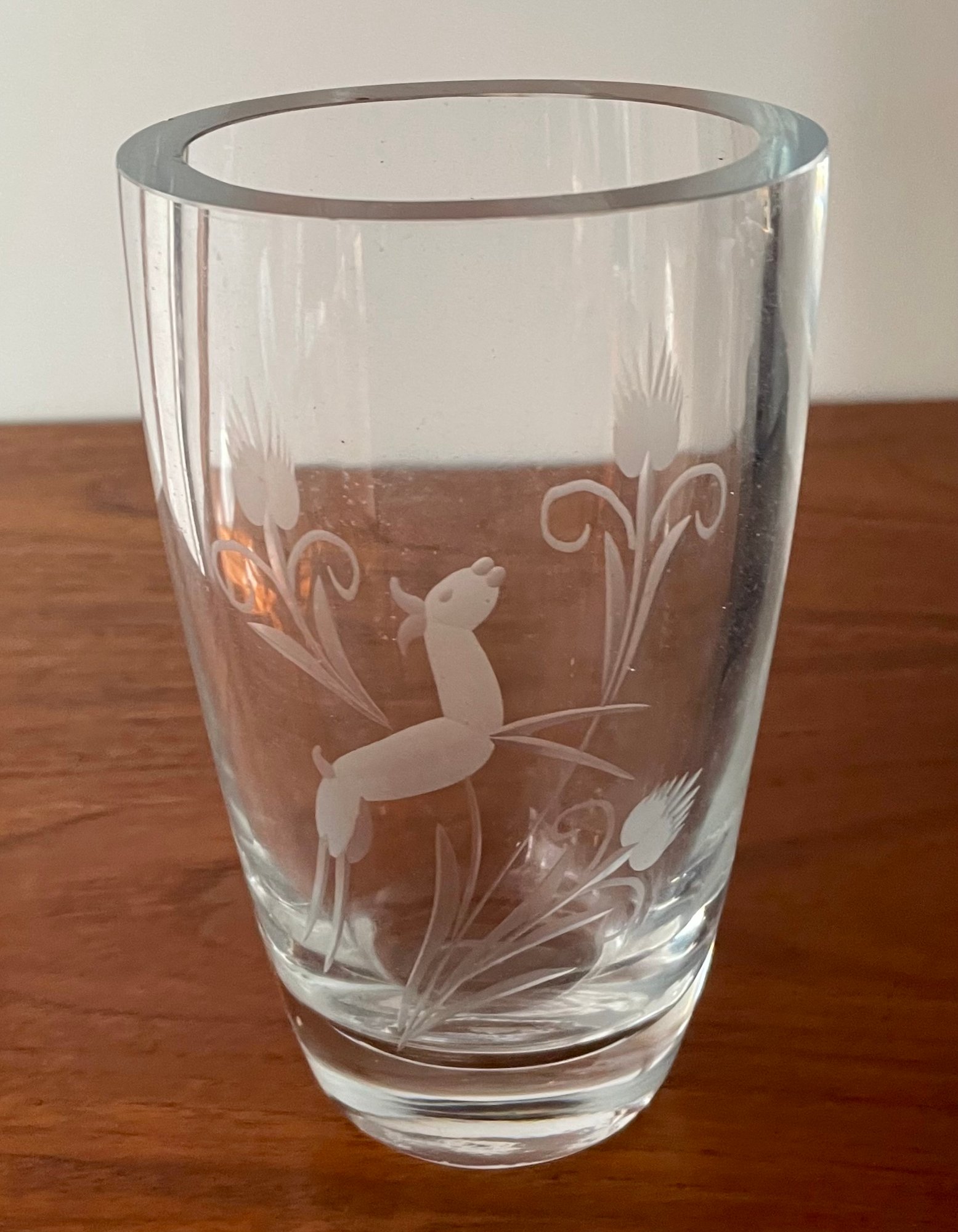 This lovely etched crystal vase is 6 3/4" high. It is oval shaped at the top where it measures 3 3/4" by 3". The design is very well down - a deer and floral designs. It quite heavy, and in very good condition.