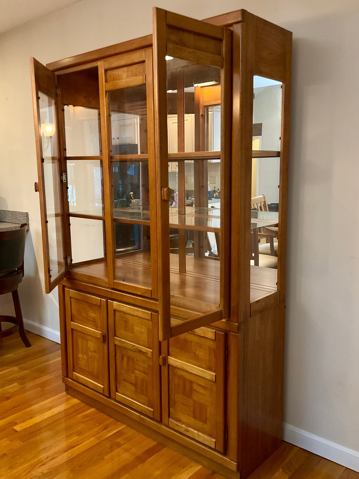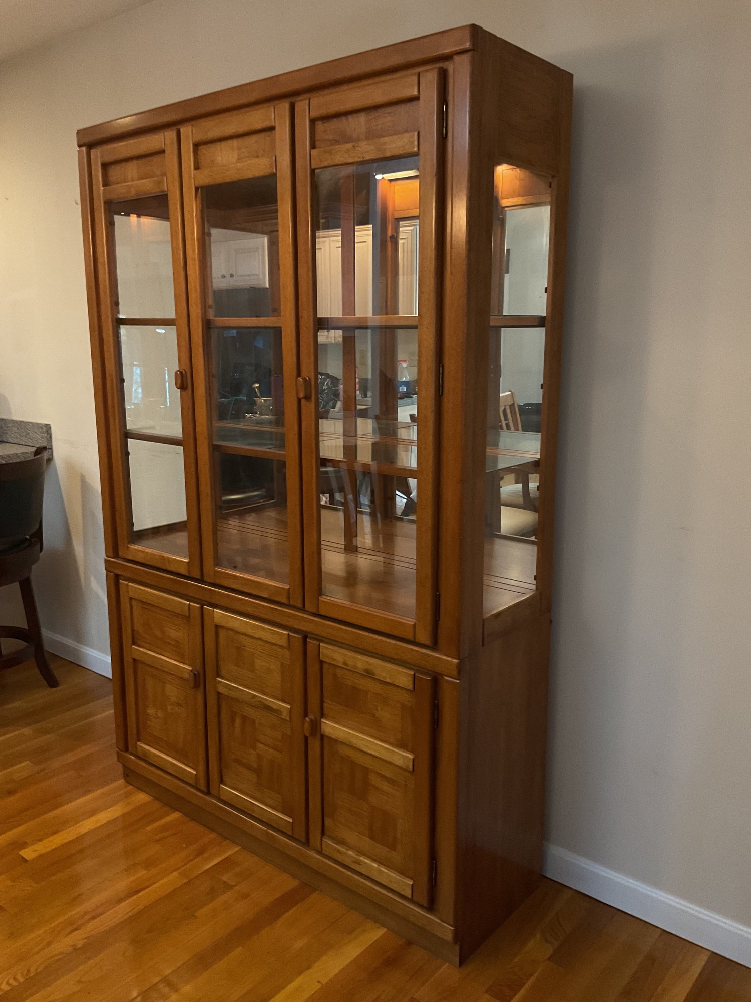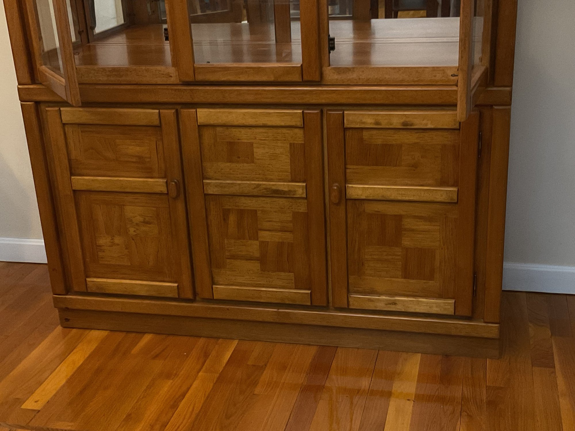 Handsome two-piece lighted china cabinet and buffet. Featuring a distinctive parquet-style wood inlay on the lower cabinet doors, this unit offers a blend of Mid-Century Modern aesthetics and practical storage.