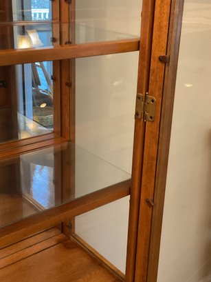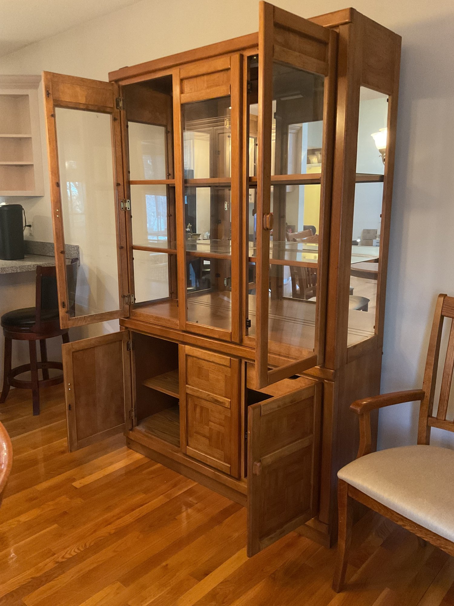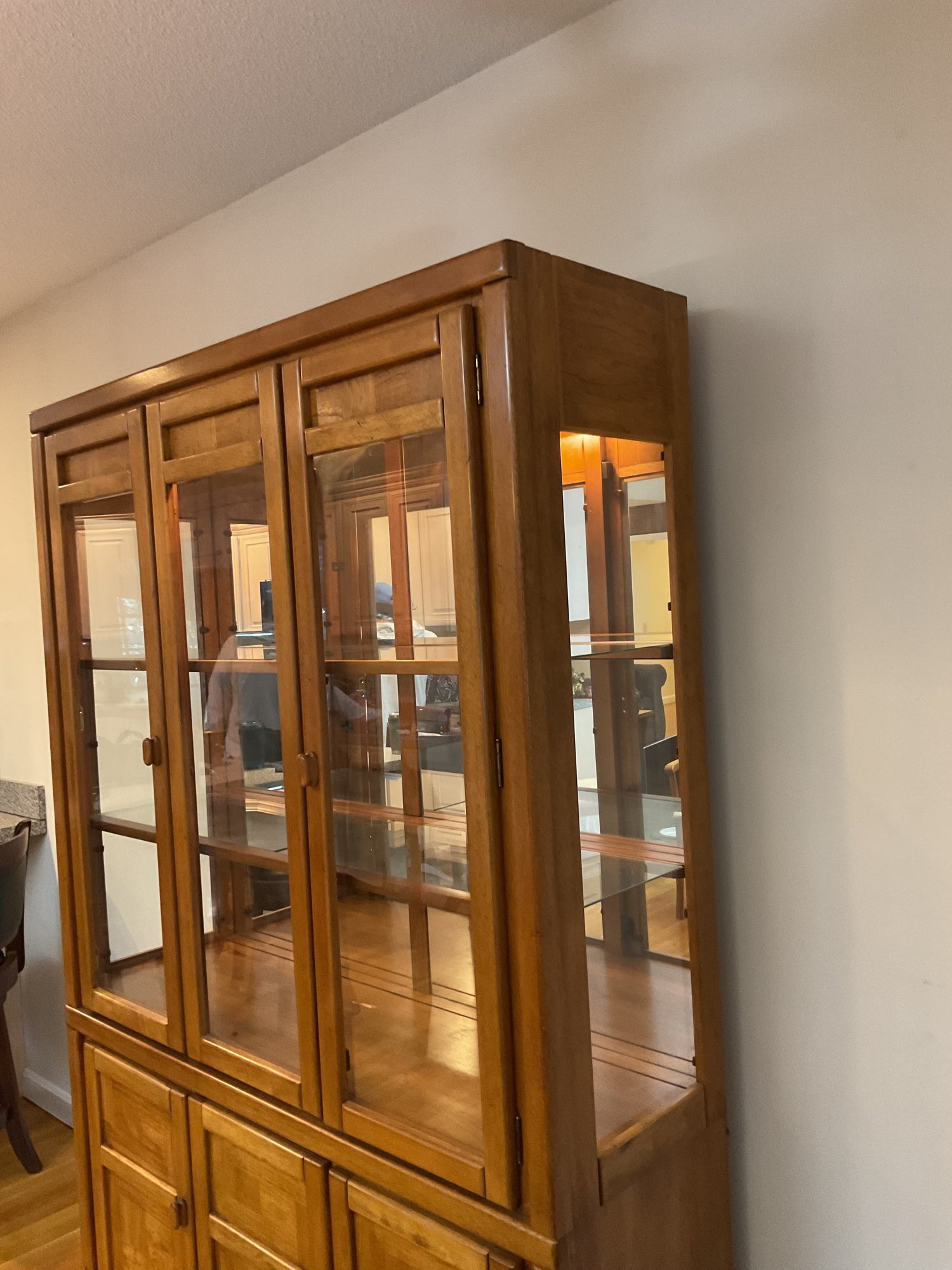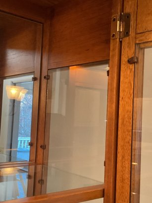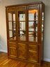 Handsome two-piece lighted china cabinet and buffet. Featuring a distinctive parquet-style wood inlay on the lower cabinet doors, this unit offers a blend of Mid-Century Modern aesthetics and practical storage.