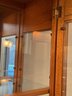 Features: Integrated lighting, mirrored back, glass shelving, and decorative wood inlay.
