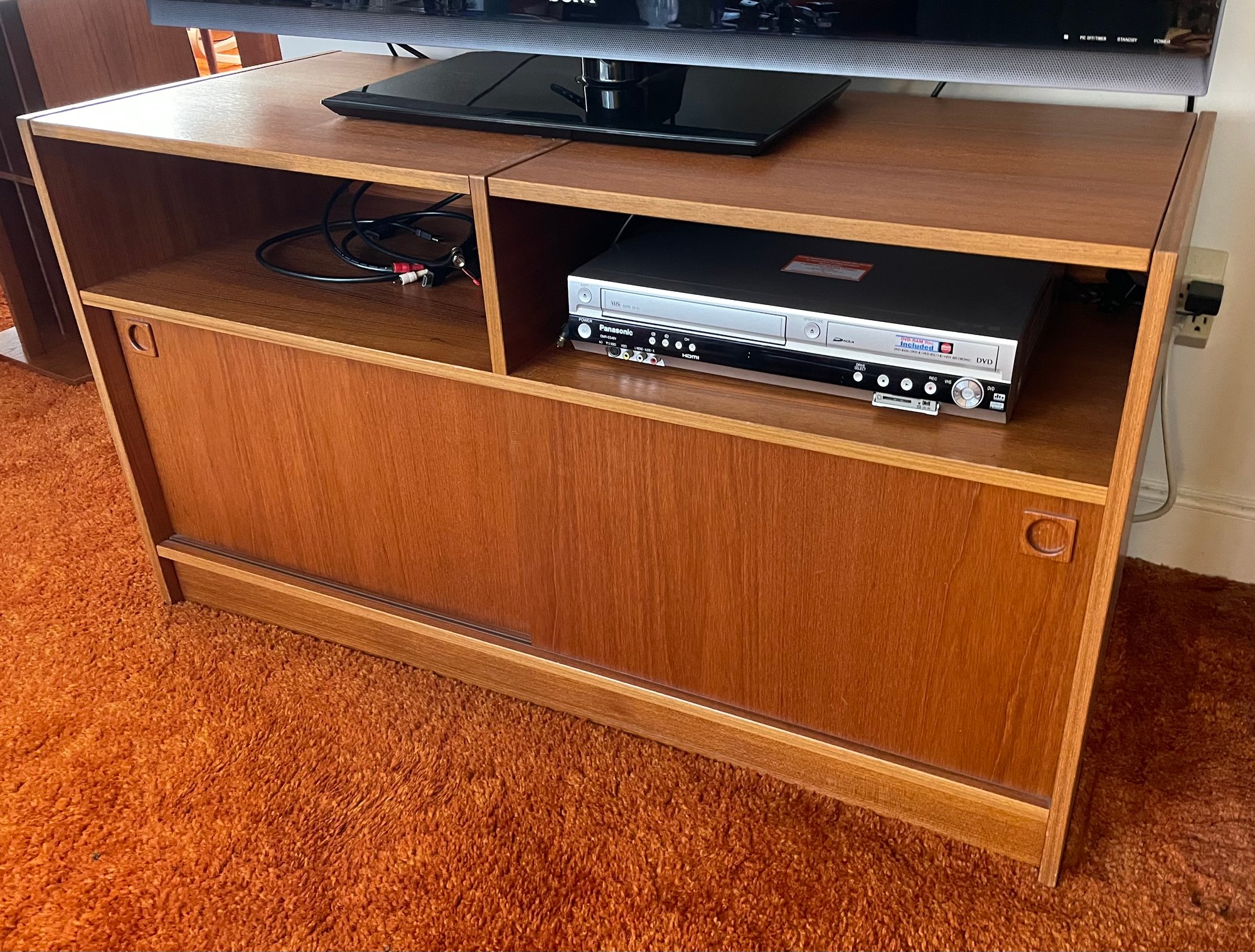 A good looking and very useful stereo and TV cabinet, and it has quite a bit of storage room behind the 2 two sliding doors. It's in good vintage condition with only very minor signs of wear.