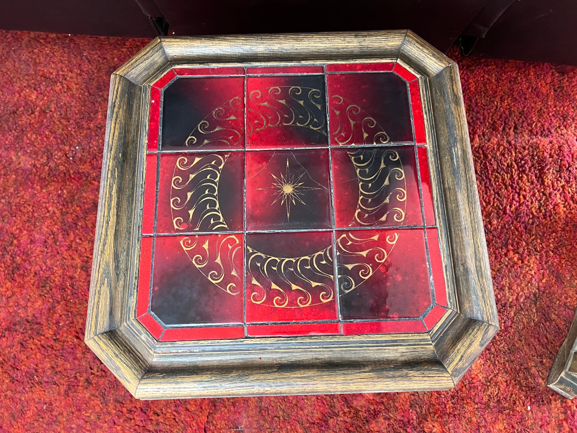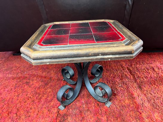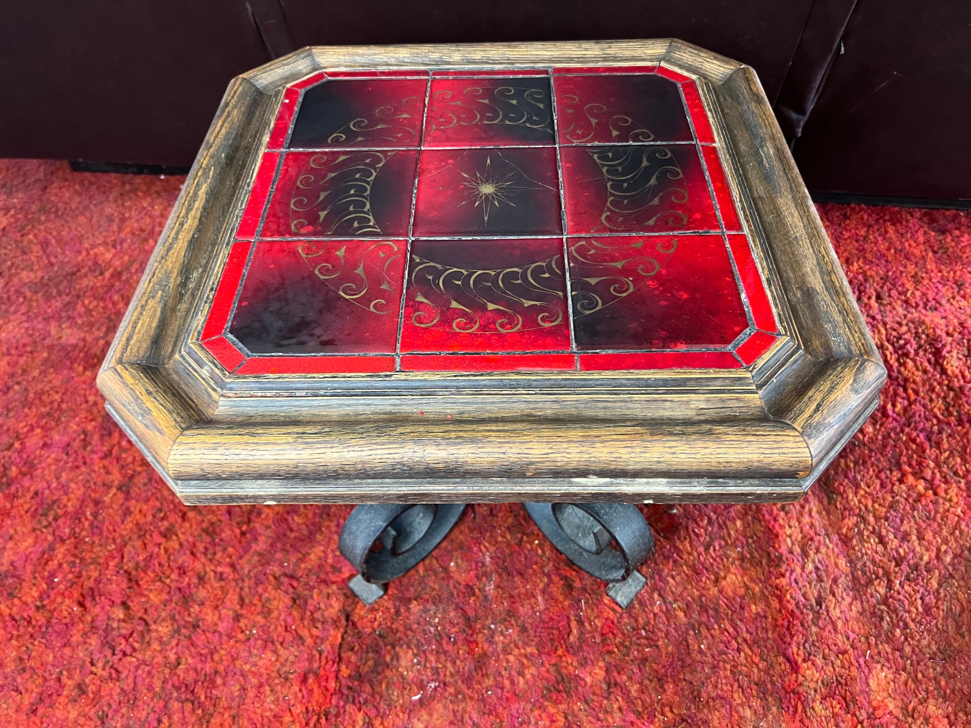 Very funky mid century accent table with a red and black inlaid tile top with gold hand-painted accent in a celestial design and a black wrought iron base.