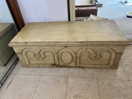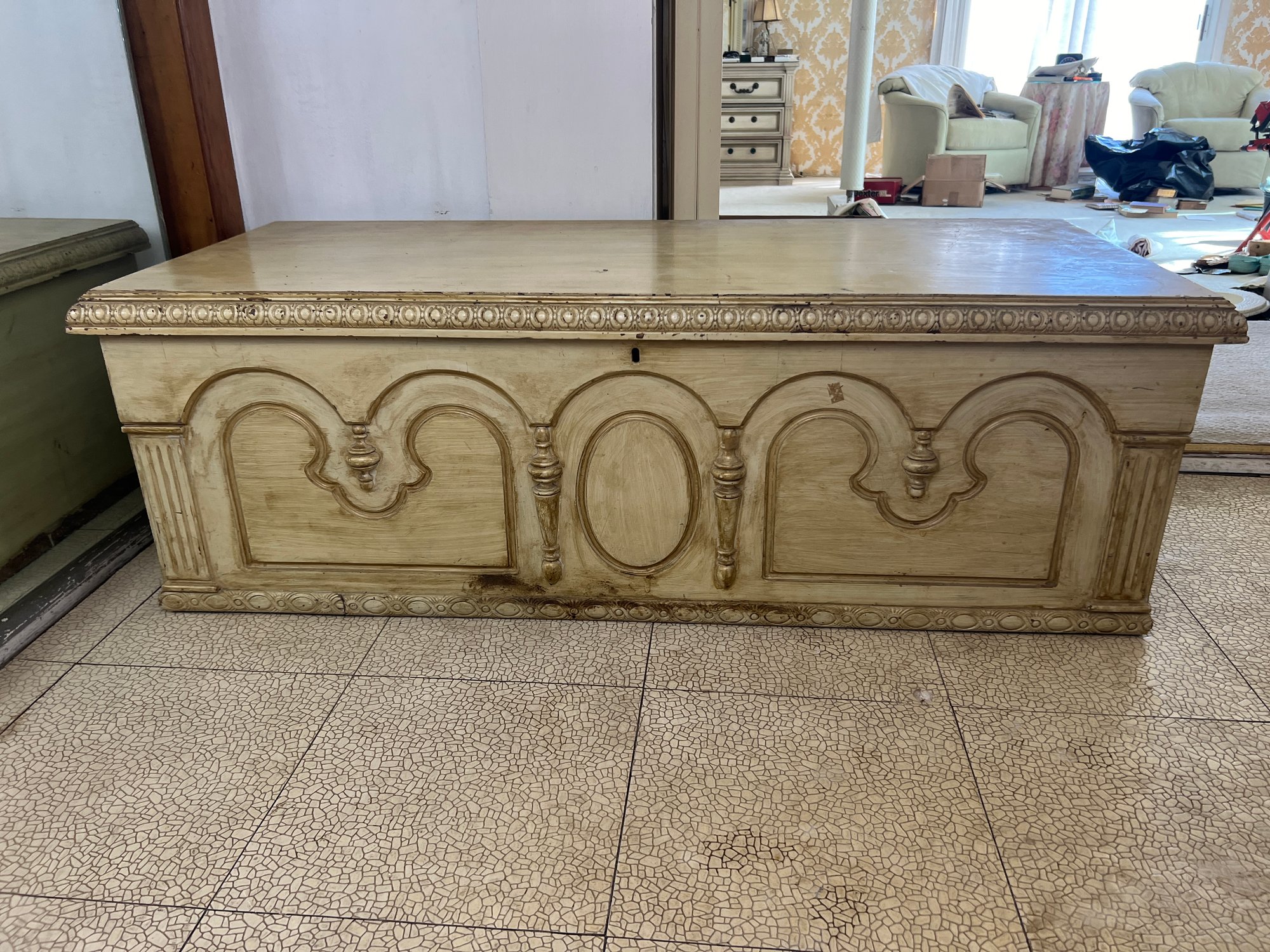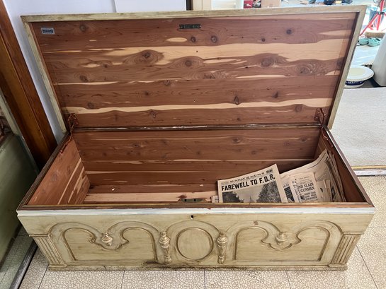 Mid century regency style cedar lined chest with an antiqued white finish.