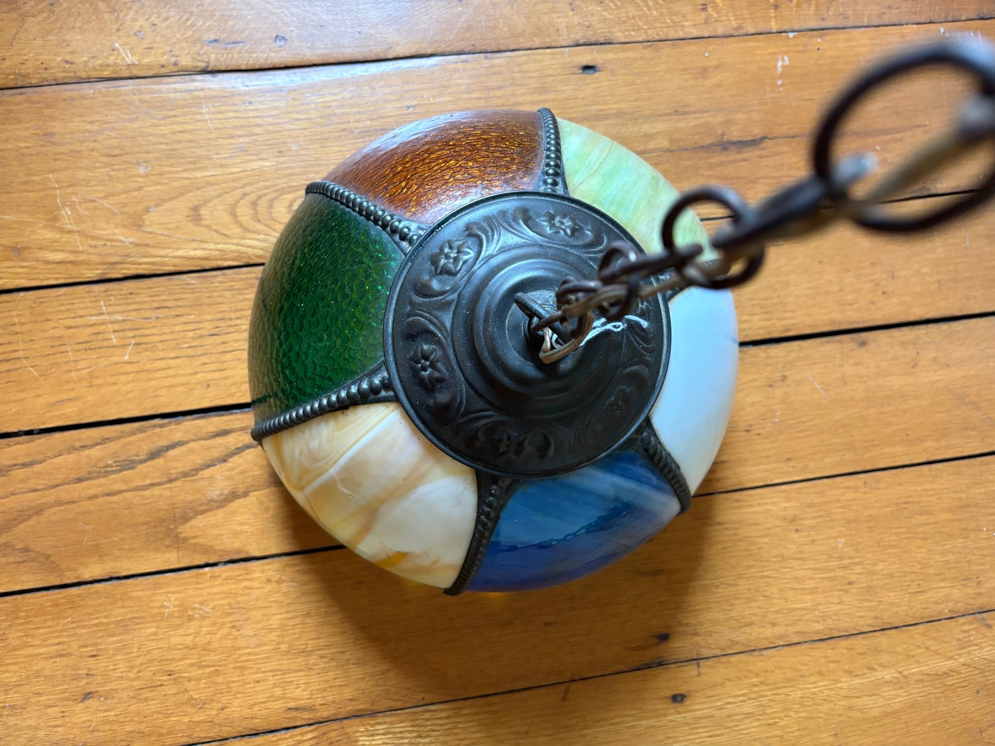 Mid century Tiffany-style slag glass hanging pendant lamp, featuring six colored panels in green, white, amber, and blue with detailed black-finished metalwork.