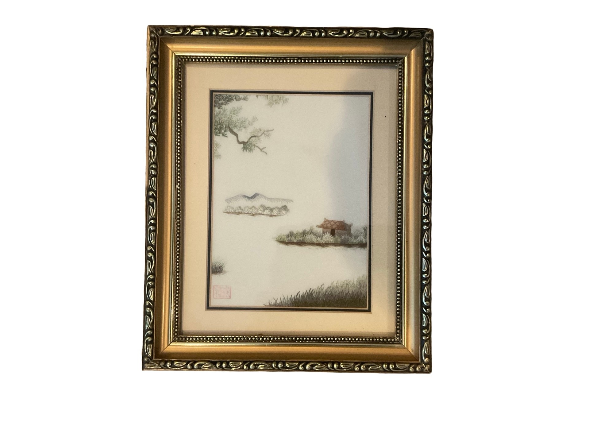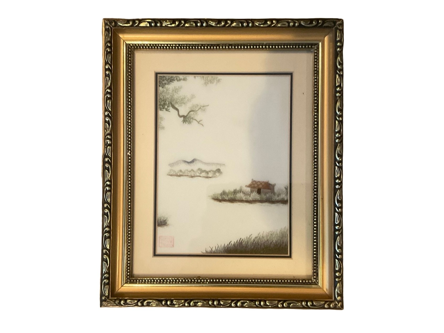 14 inches this is a piece of traditional Chinese silk embroidery, likely a mid-to-late 20th-century decorative work. The style is a classic "Shan Shui" (mountain-water) landscape, often created in the famous Su (Suzhou) embroidery tradition, which is known for its fine detail and "split hair" silk threads that mimic the look of a brush painting.
