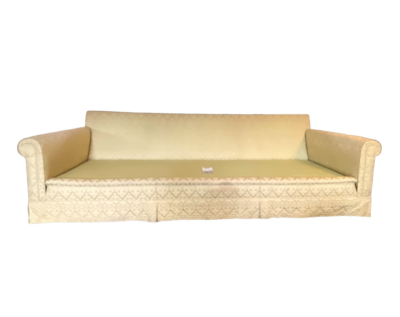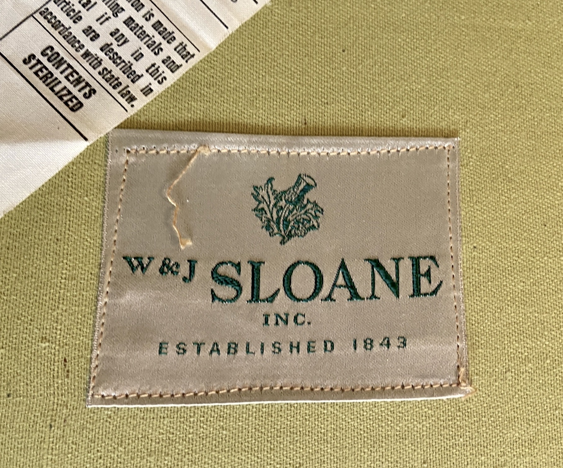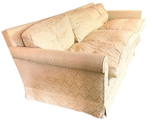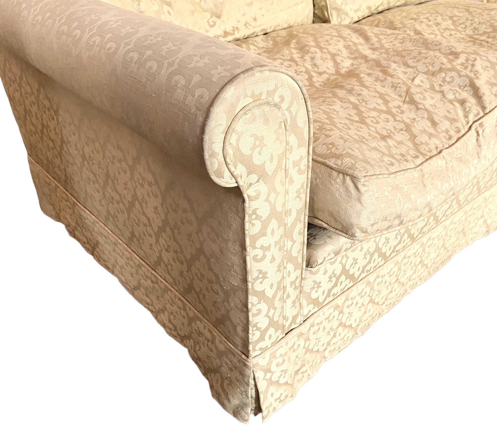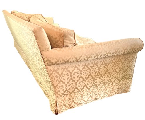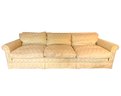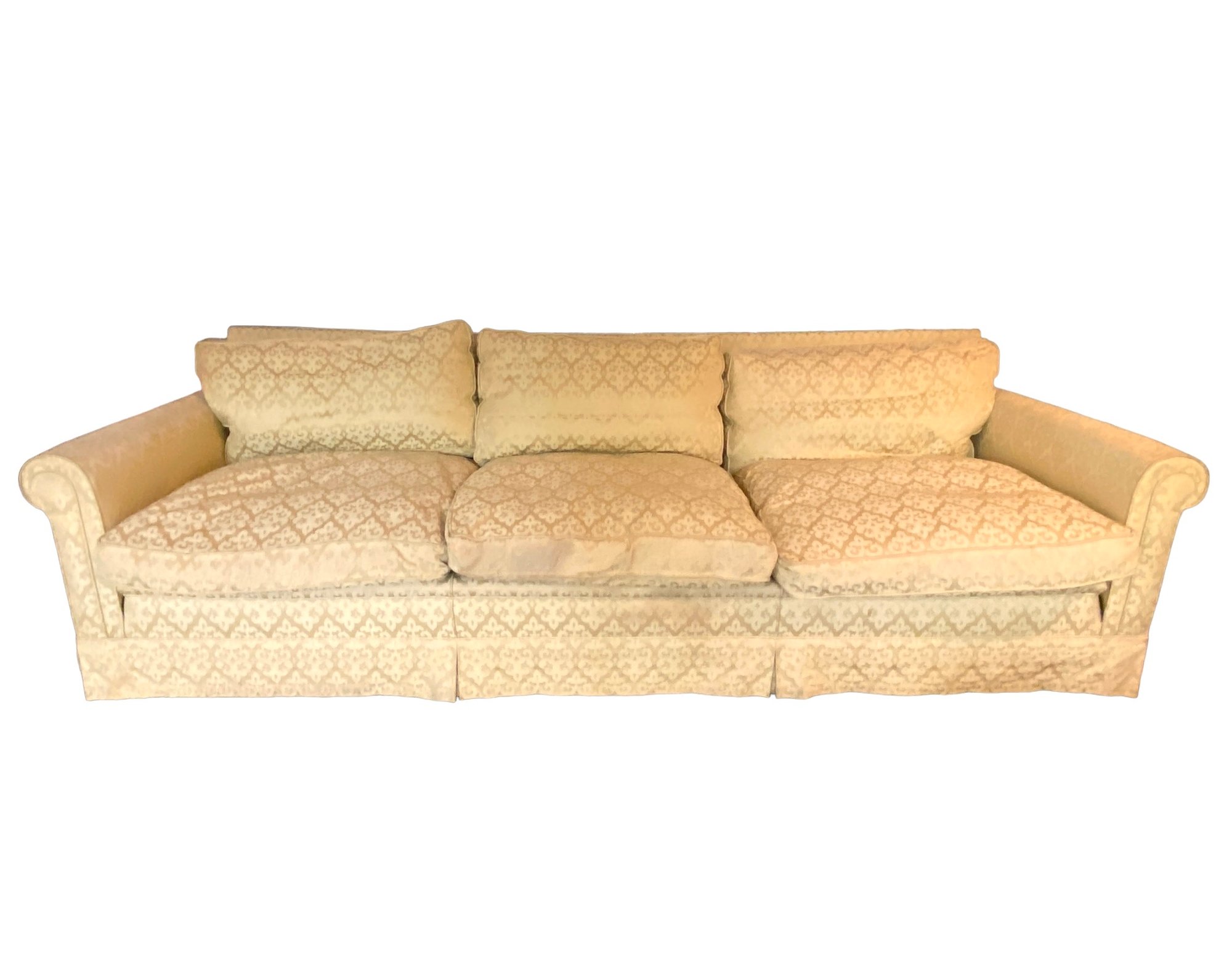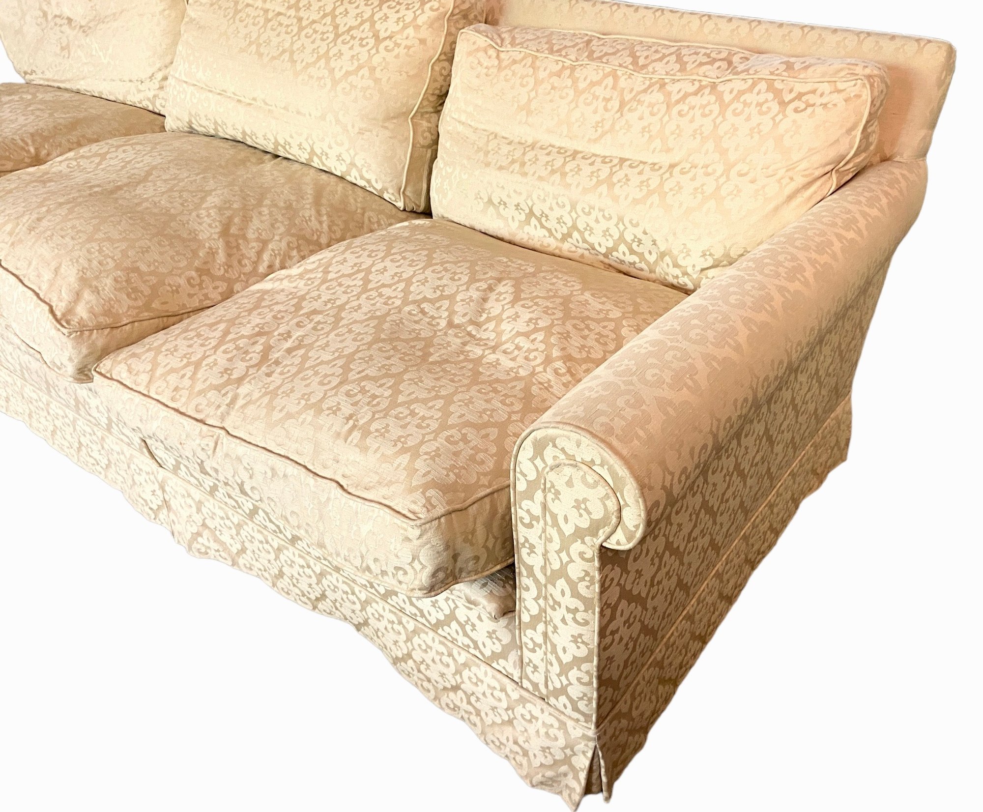 Classic three cushion sofa. Down filled cushions, seat height 16". Is skirted but has lovely legs. Includes a book W & J Sloane "The Beacon Hill Collection". The fabric color is shown clearly in the last picture. A couple of small stains.