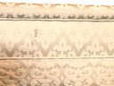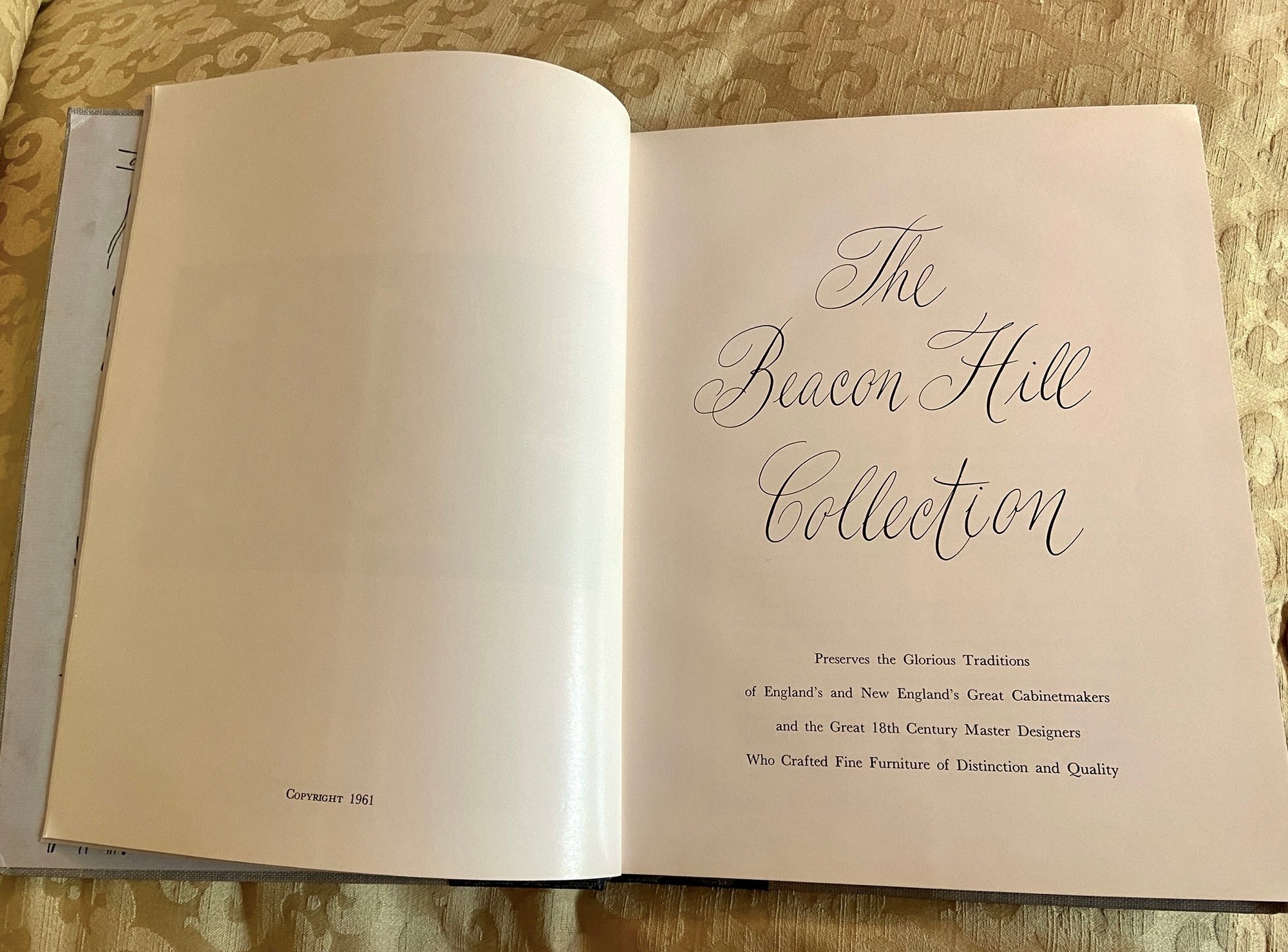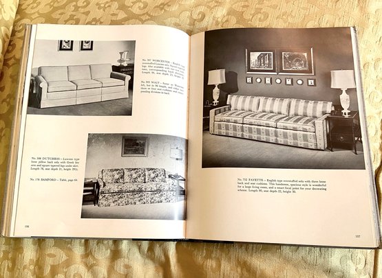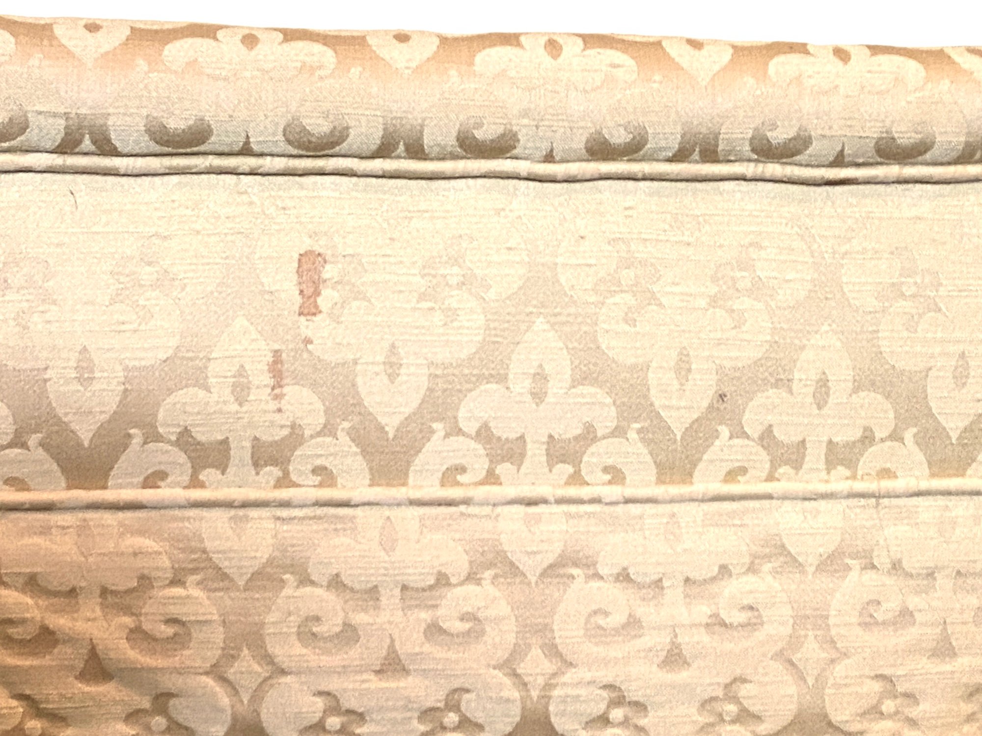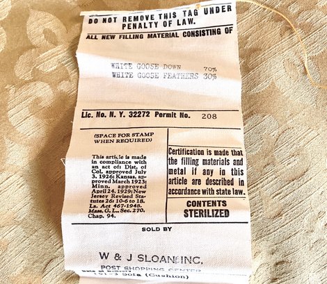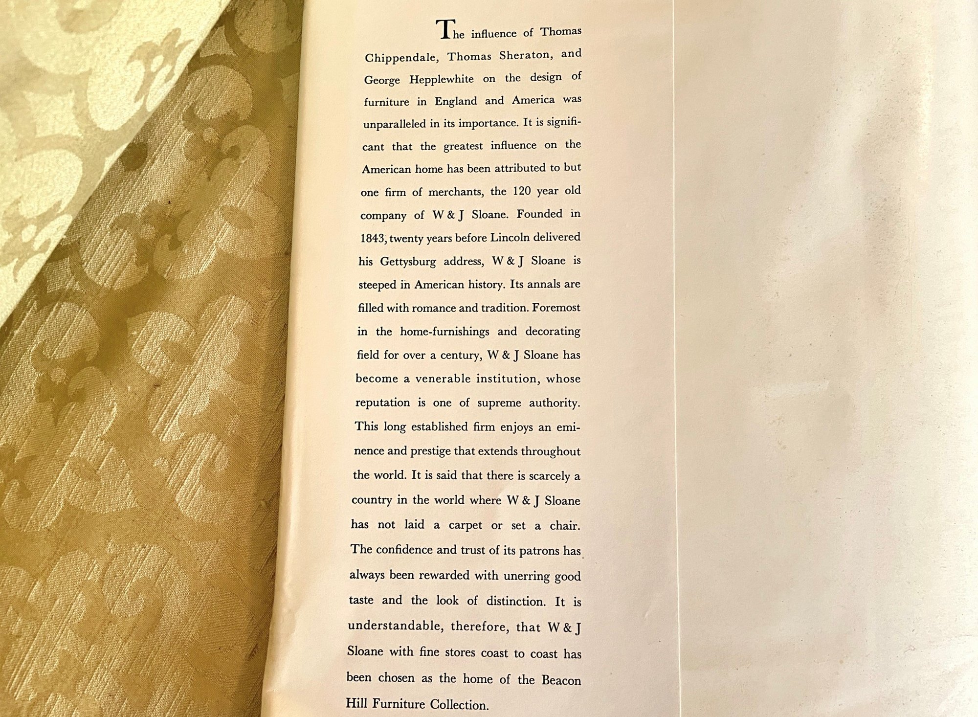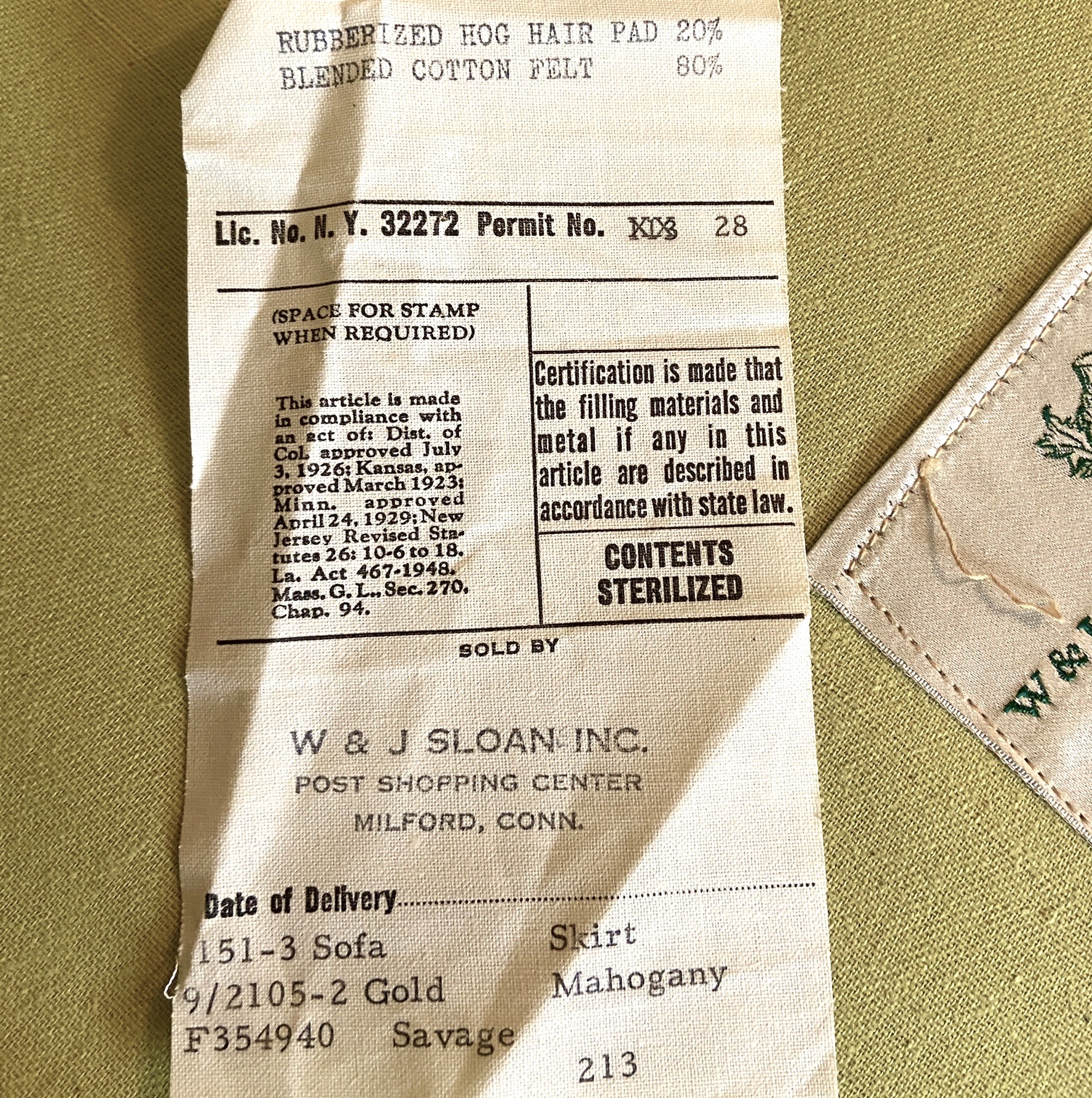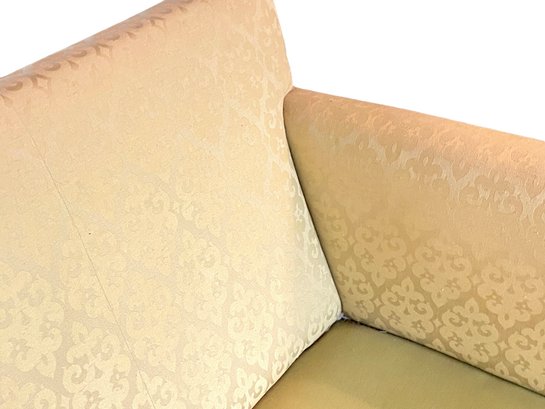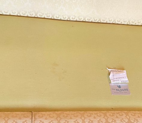 Classic three cushion sofa. Down filled cushions, seat height 16". Is skirted but has lovely legs. Includes a book W & J Sloane "The Beacon Hill Collection". The fabric color is shown clearly in the last picture. A couple of small stains.