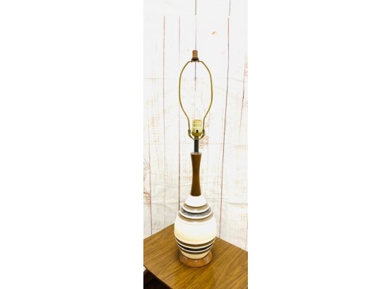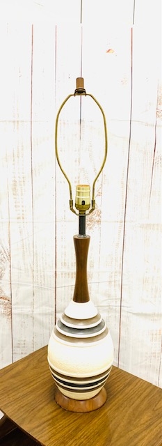 Flash Back to the past with this awesome vintage mid century bowling pin style table lamp! Made of Walnut and Ceramic, it measures 29" tall, and 7" diameter at its widest.