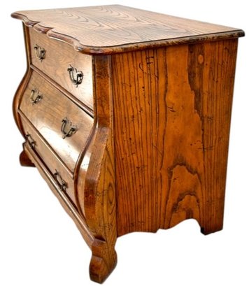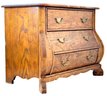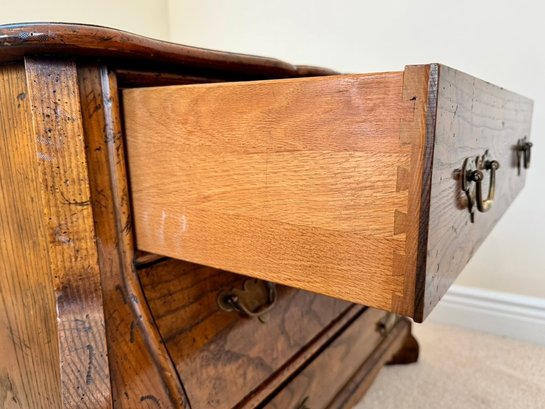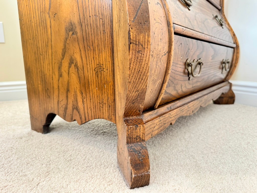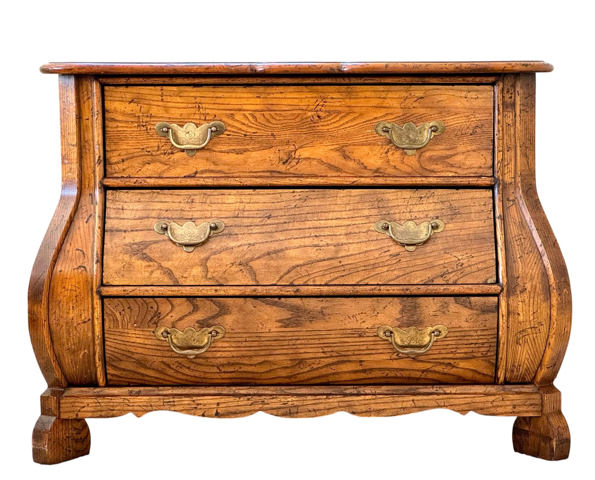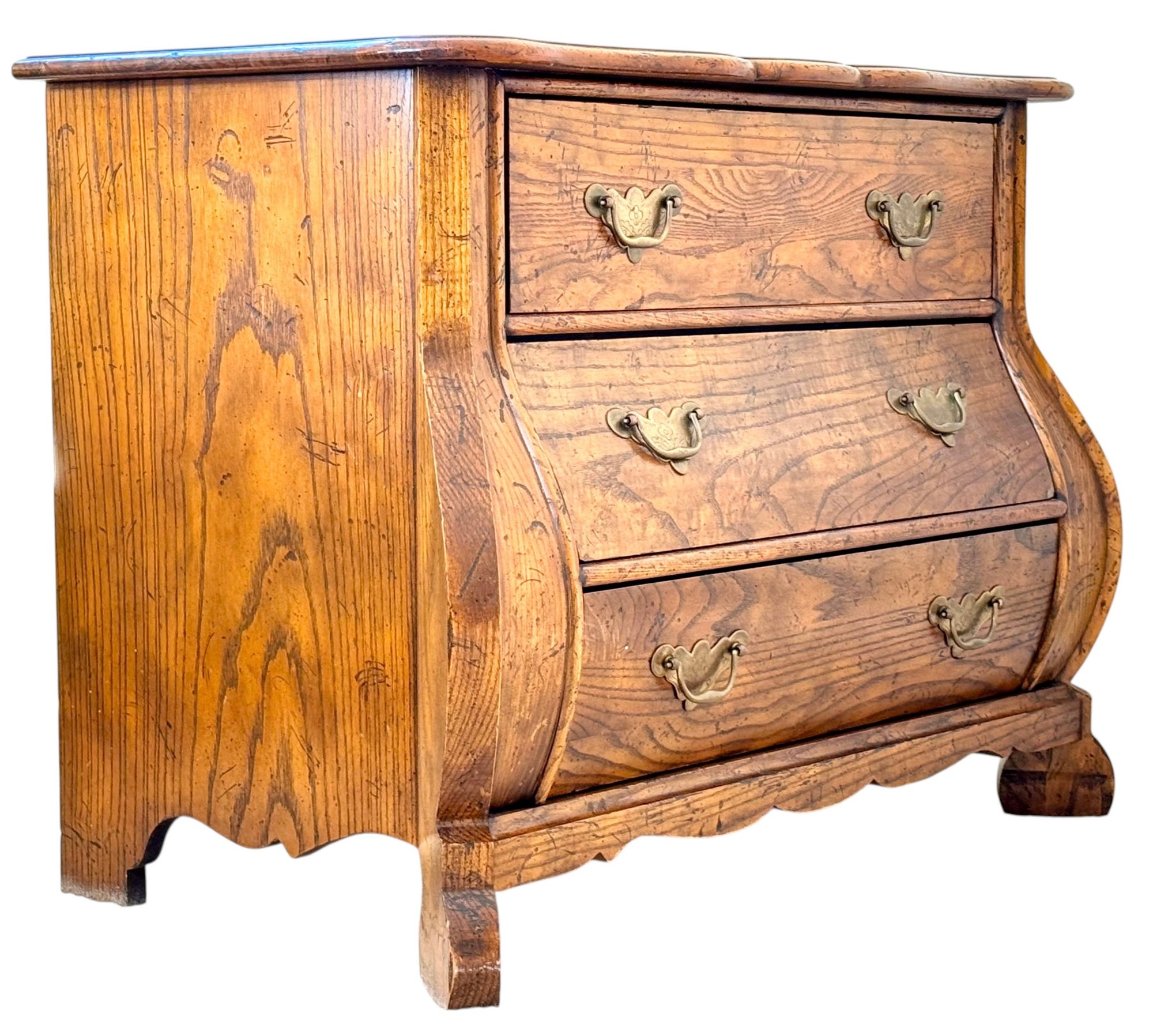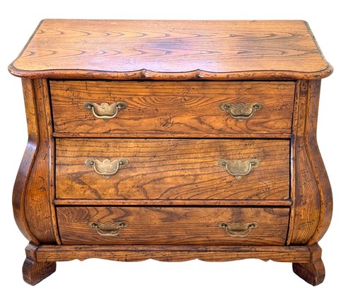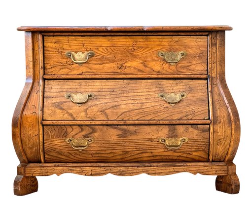 This elegant three-drawer chest features classic serpentine (bombe) shaping along the sides and front, resting on sculpted bracket feet. The warm honey-toned oak showcases striking natural grain throughout, complemented by traditional brass bail pulls.