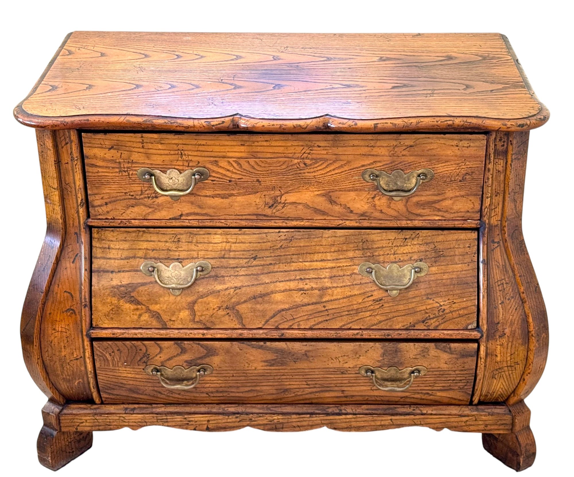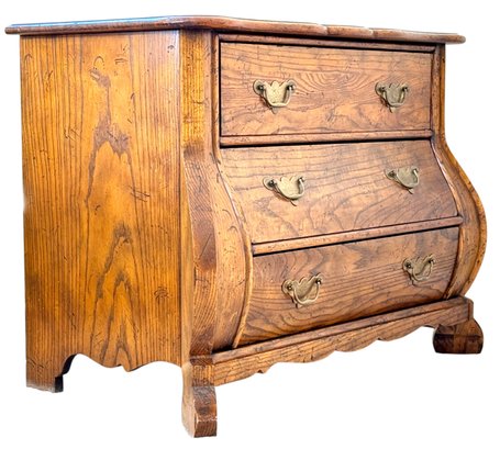 A beautifully crafted French Provincial–style bombe chest by Milling Road, a division of Baker Furniture, Inc., made in Craftsmen Corners, North Carolina.
