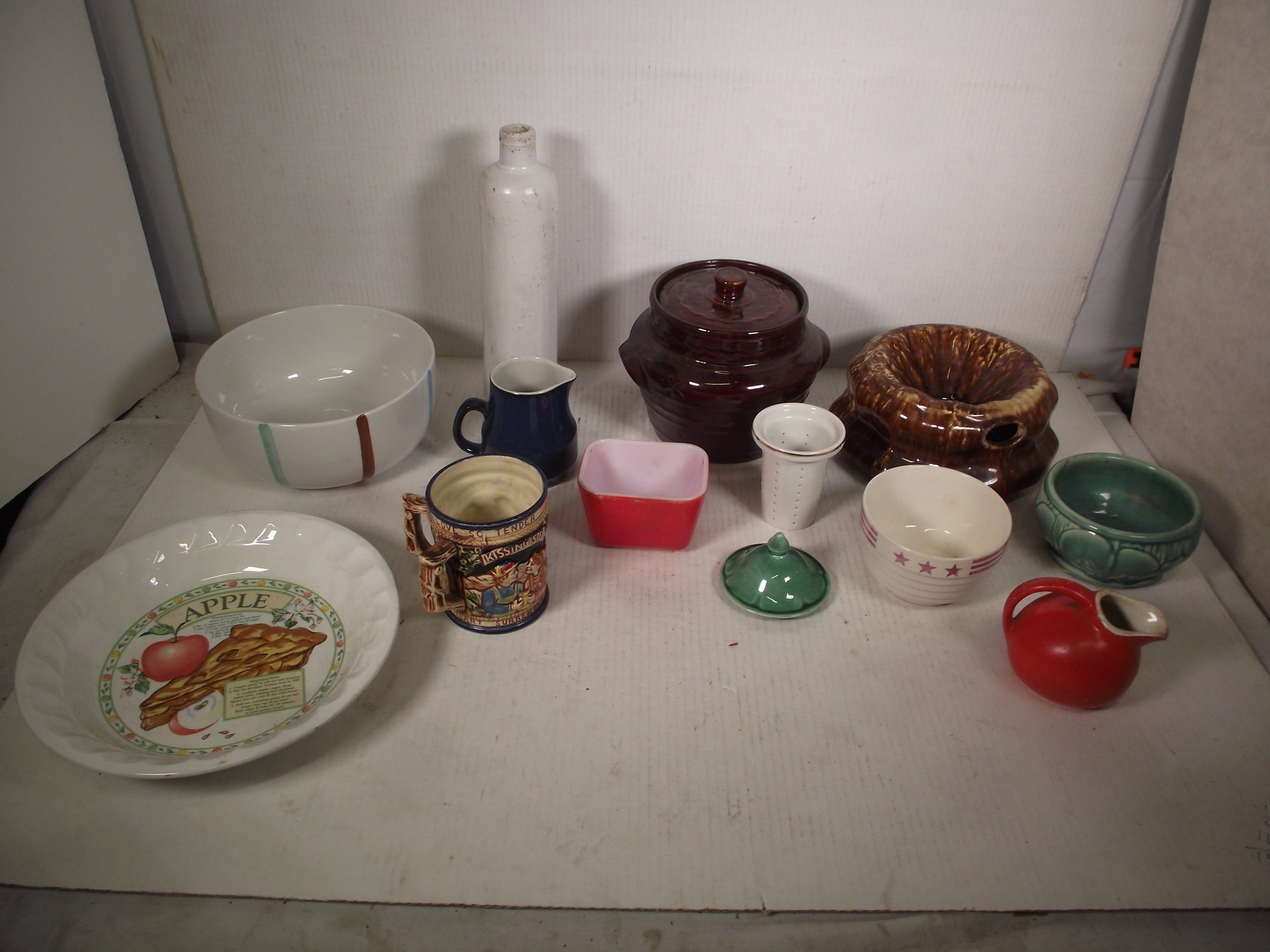 MISC. POTTERY LOT WITH SOME PYREX. PLEASE SEE PHOTOS FOR CONDITION AND VARIETY.