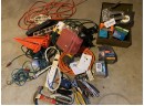 Perfect for electricians, with hand tools (pictured). Includes power strips, high gauge extension cords, bulbs, an outdoor architectural light, outlets, misc parts, and more.