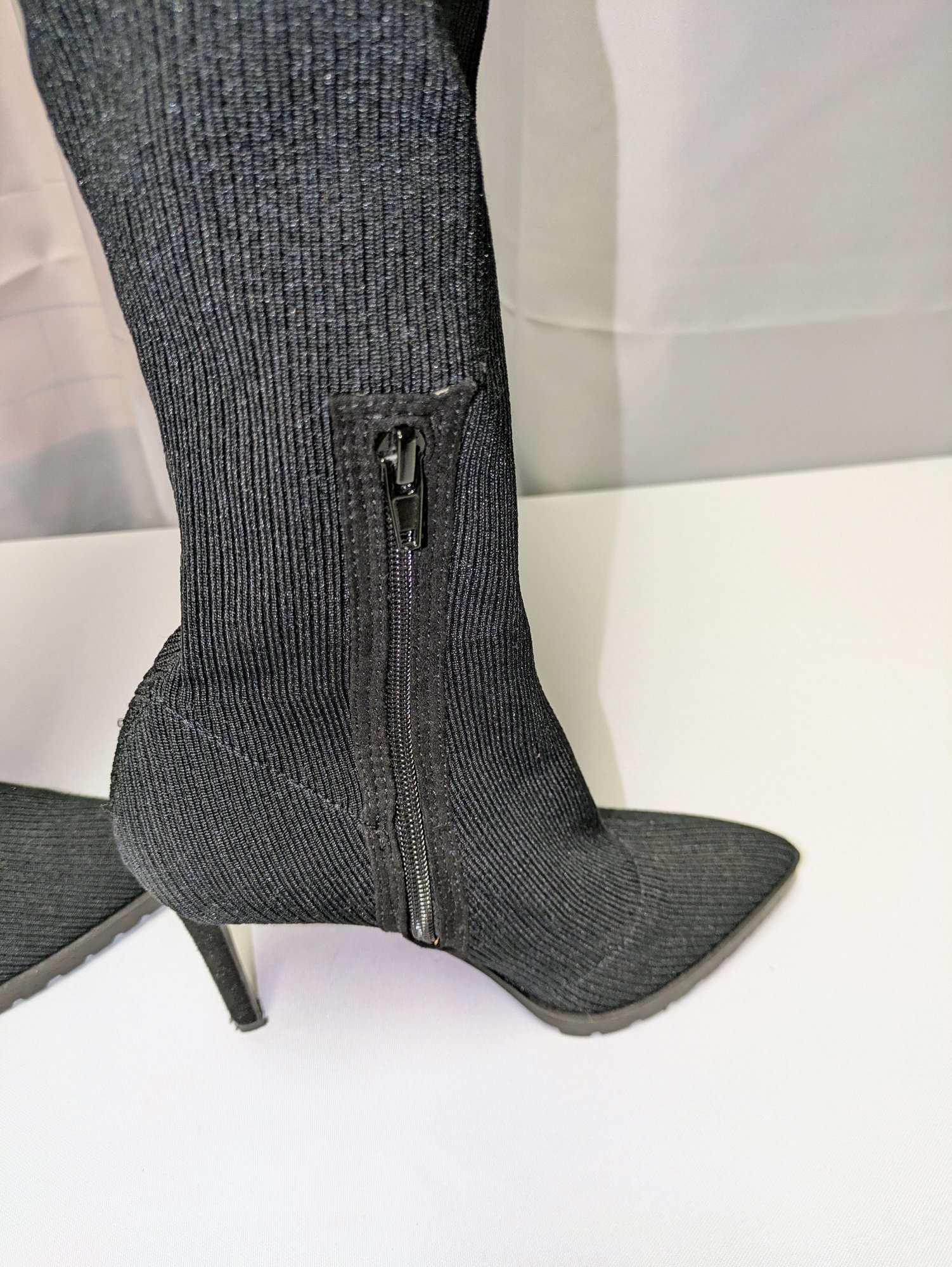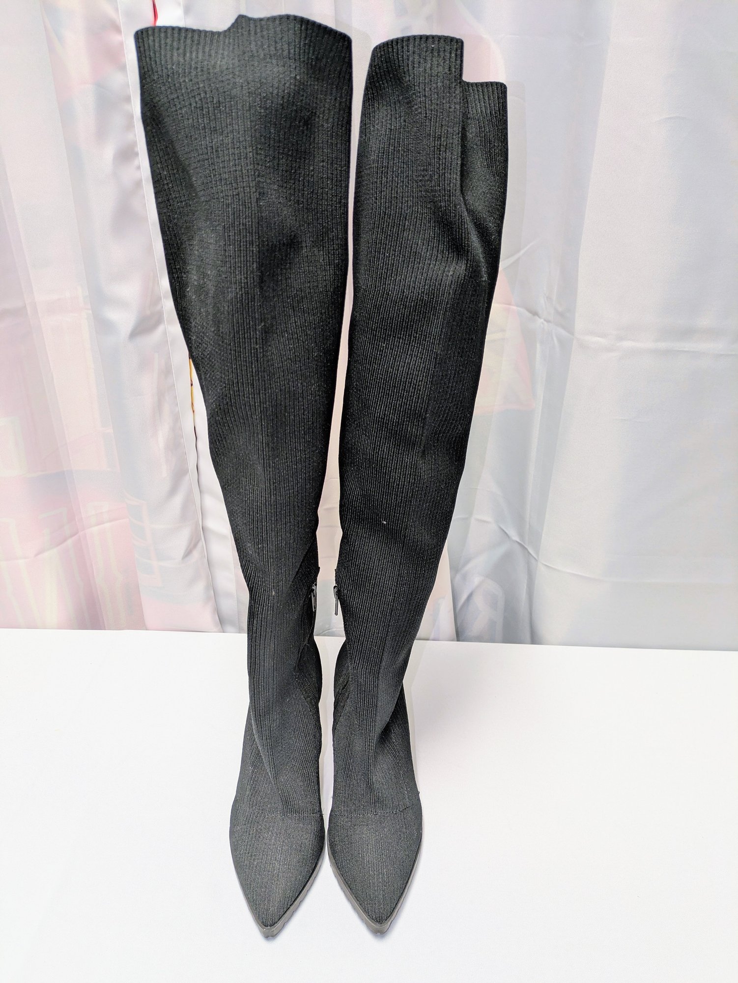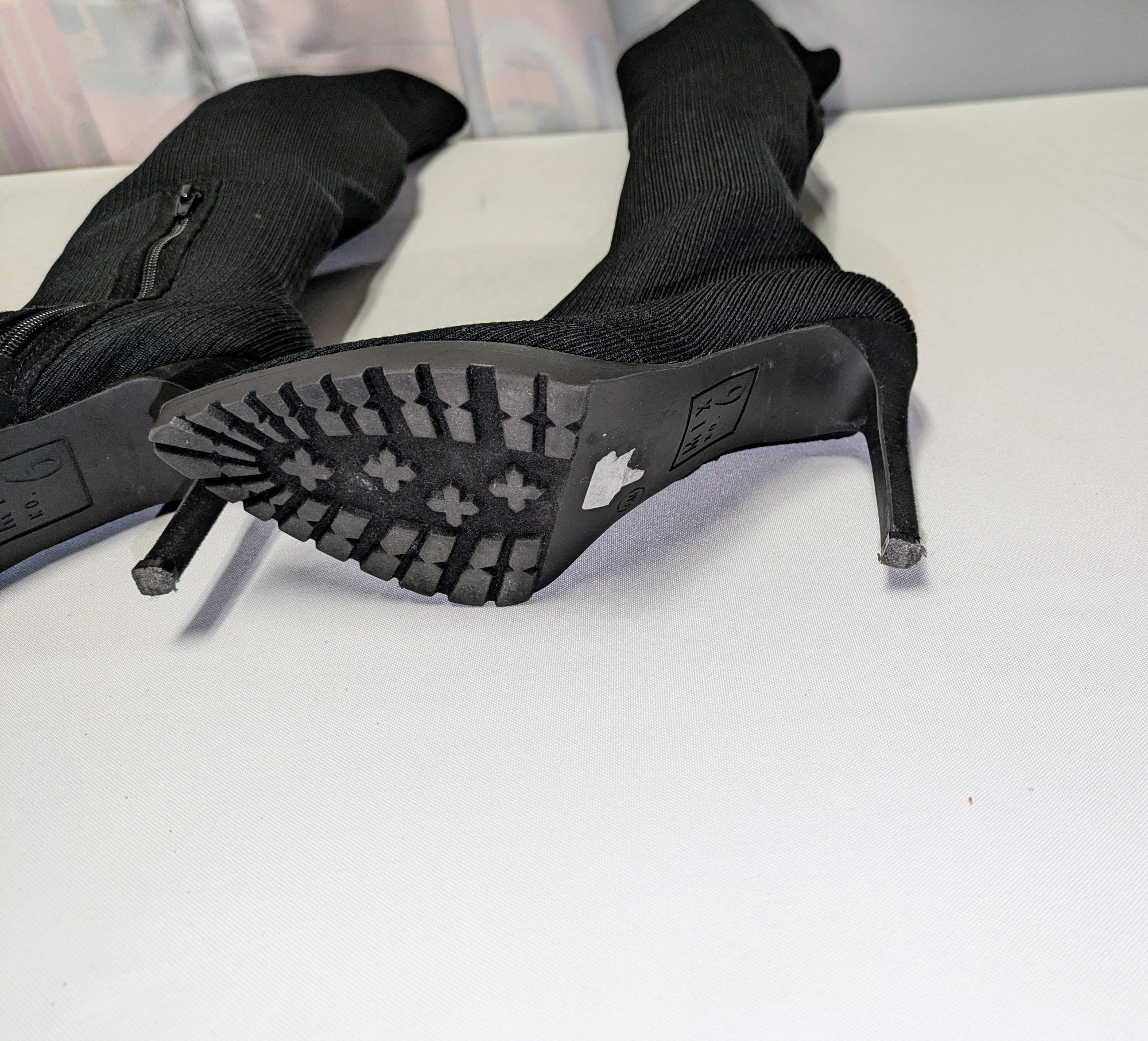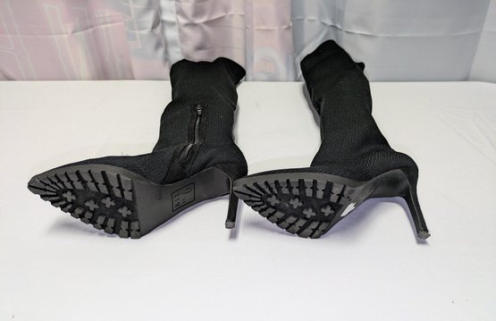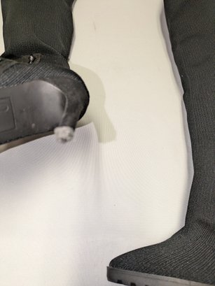 Some light mark (easily cleaned off), like brand new boots. Excellent/ Very Good Condition. Please see all photos as part of the description and condition. Heel 4"H / Boot 24"H (from the bottom of the heel to the top of the boot)