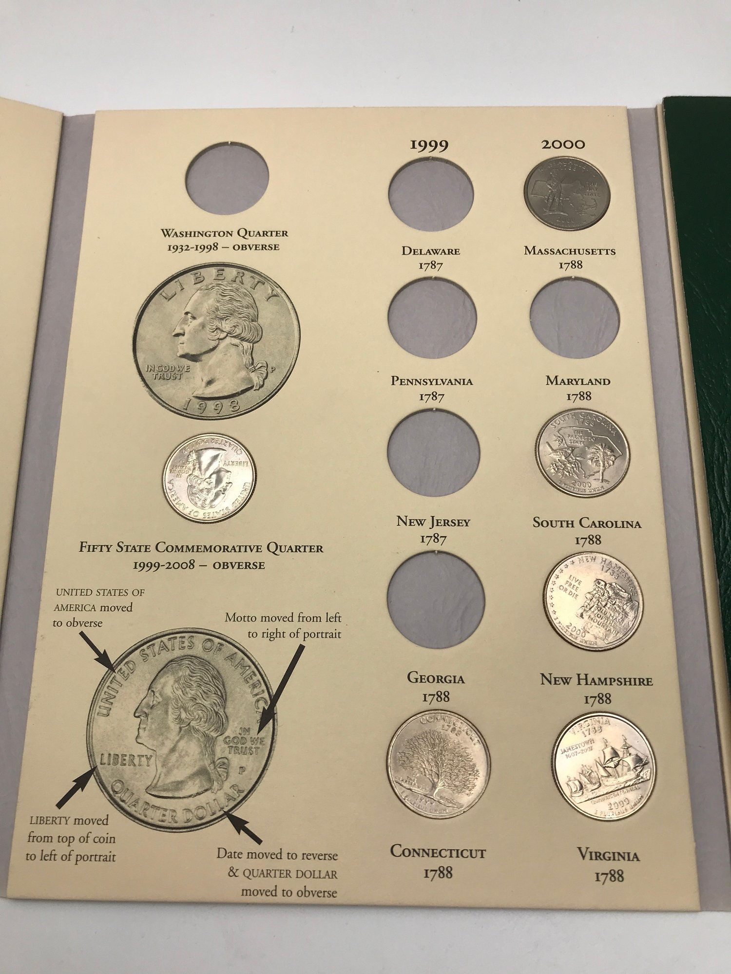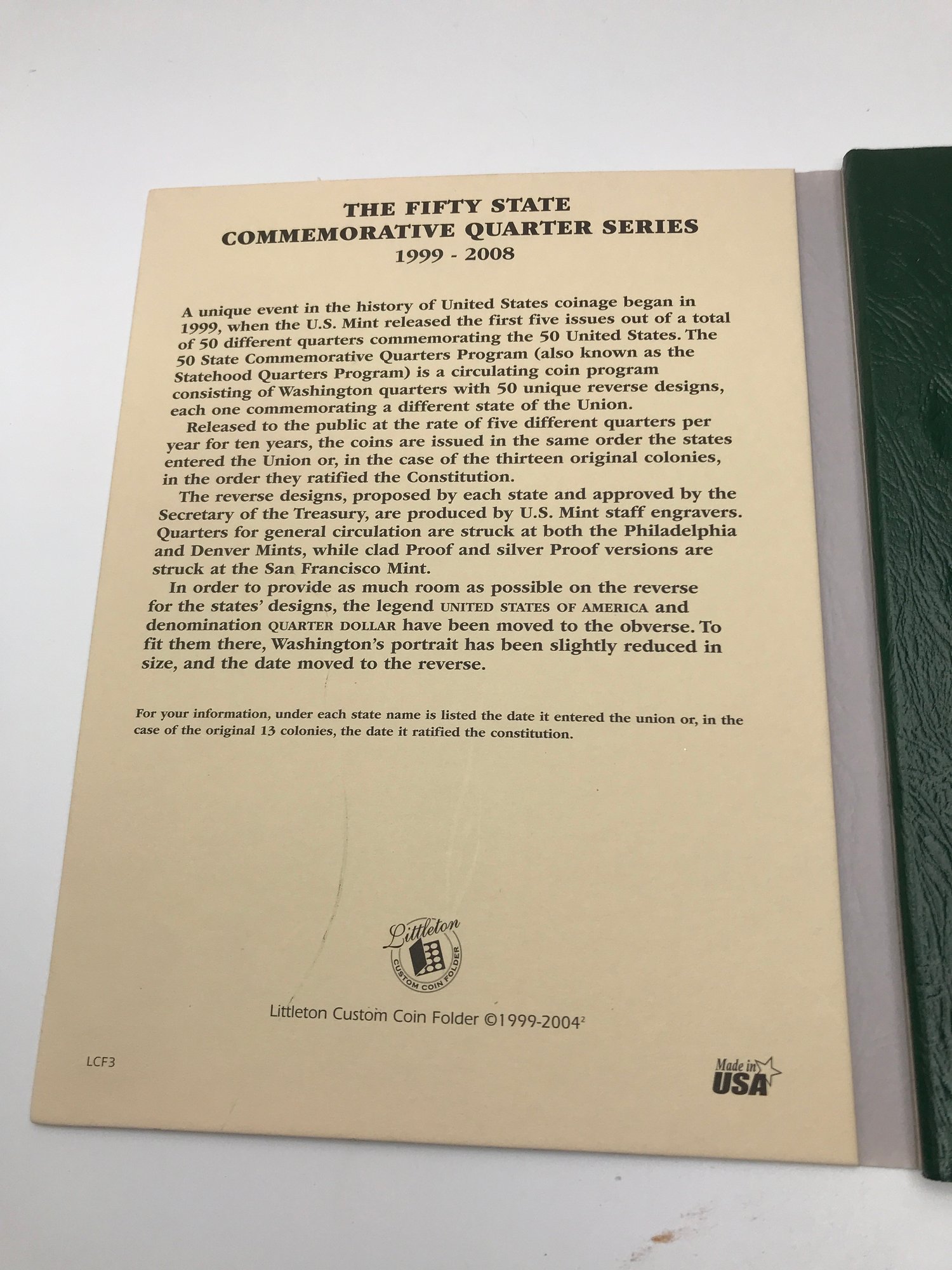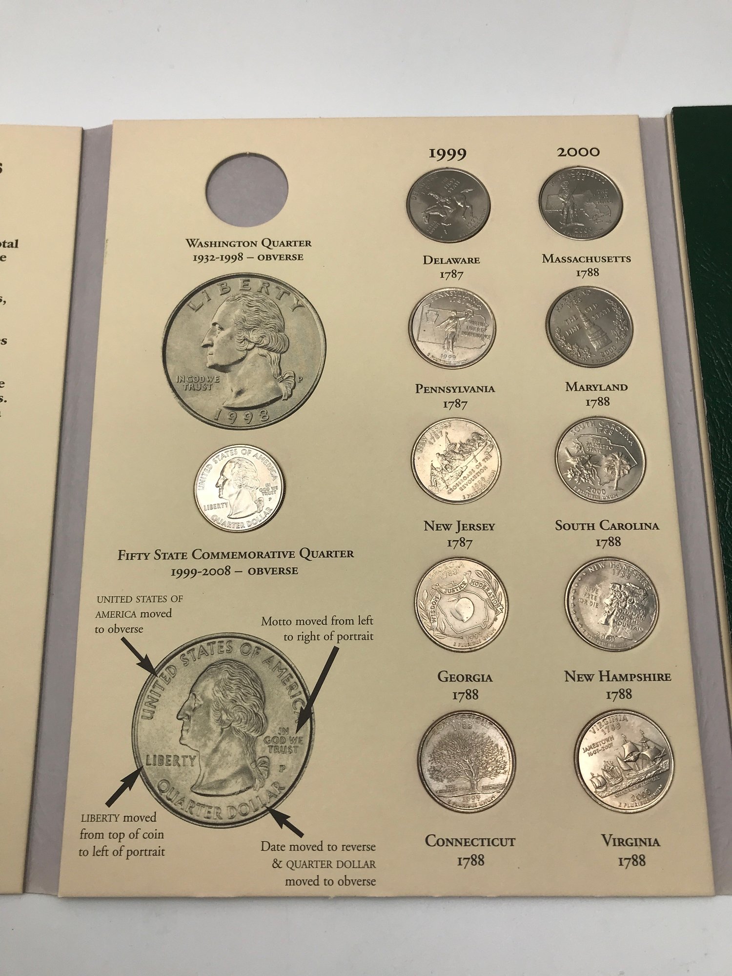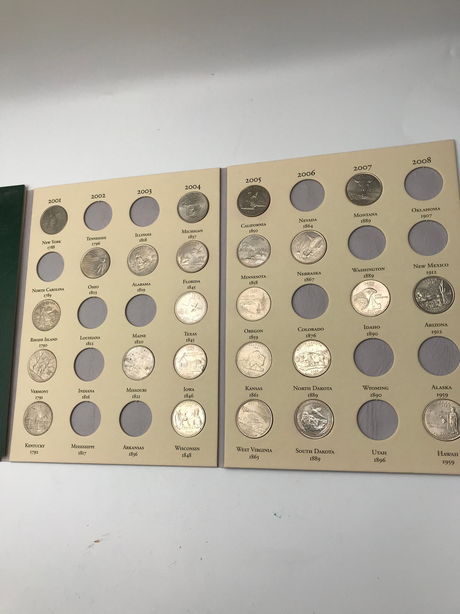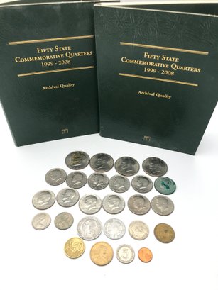 State Quarter Collection: Includes two "Fifty State Commemorative Quarters" archival-quality folders. Both folders are partially filled with various state issues from the 1999–2008 series.
