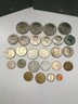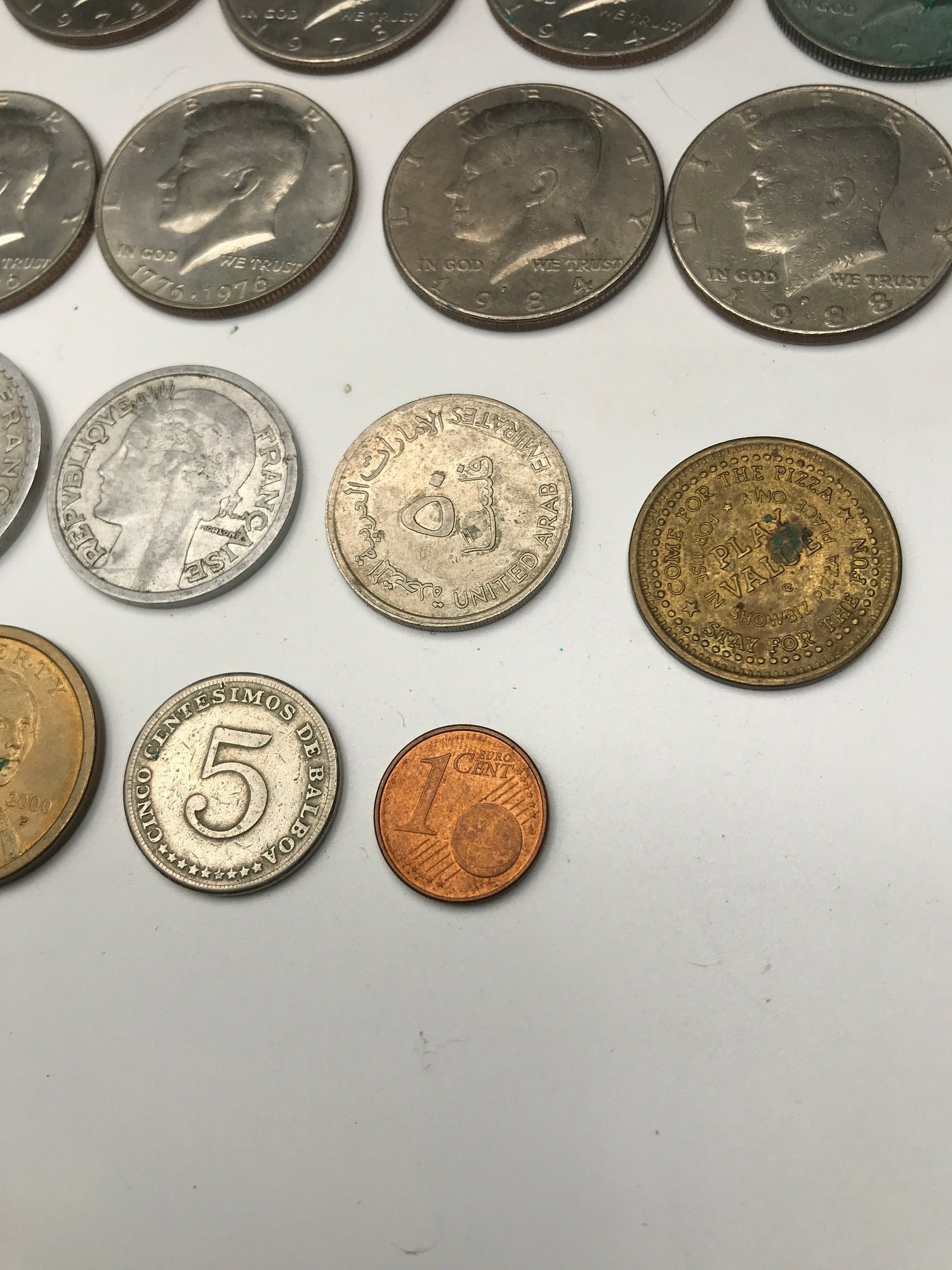 International & Misc. Coins: A selection of world coins including a French 5 Franc piece, Euro cents, coins from the United Arab Emirates, Panama, and a vintage "Play Value" amusement token.