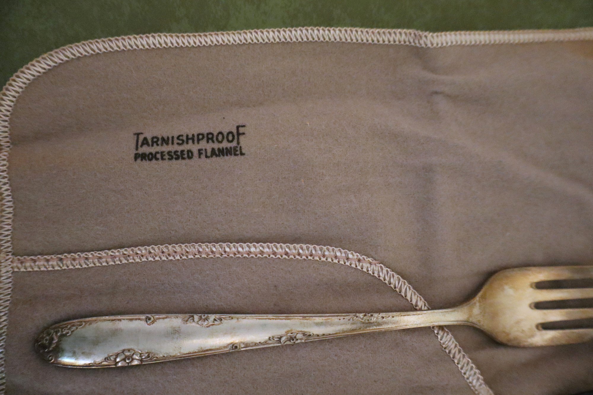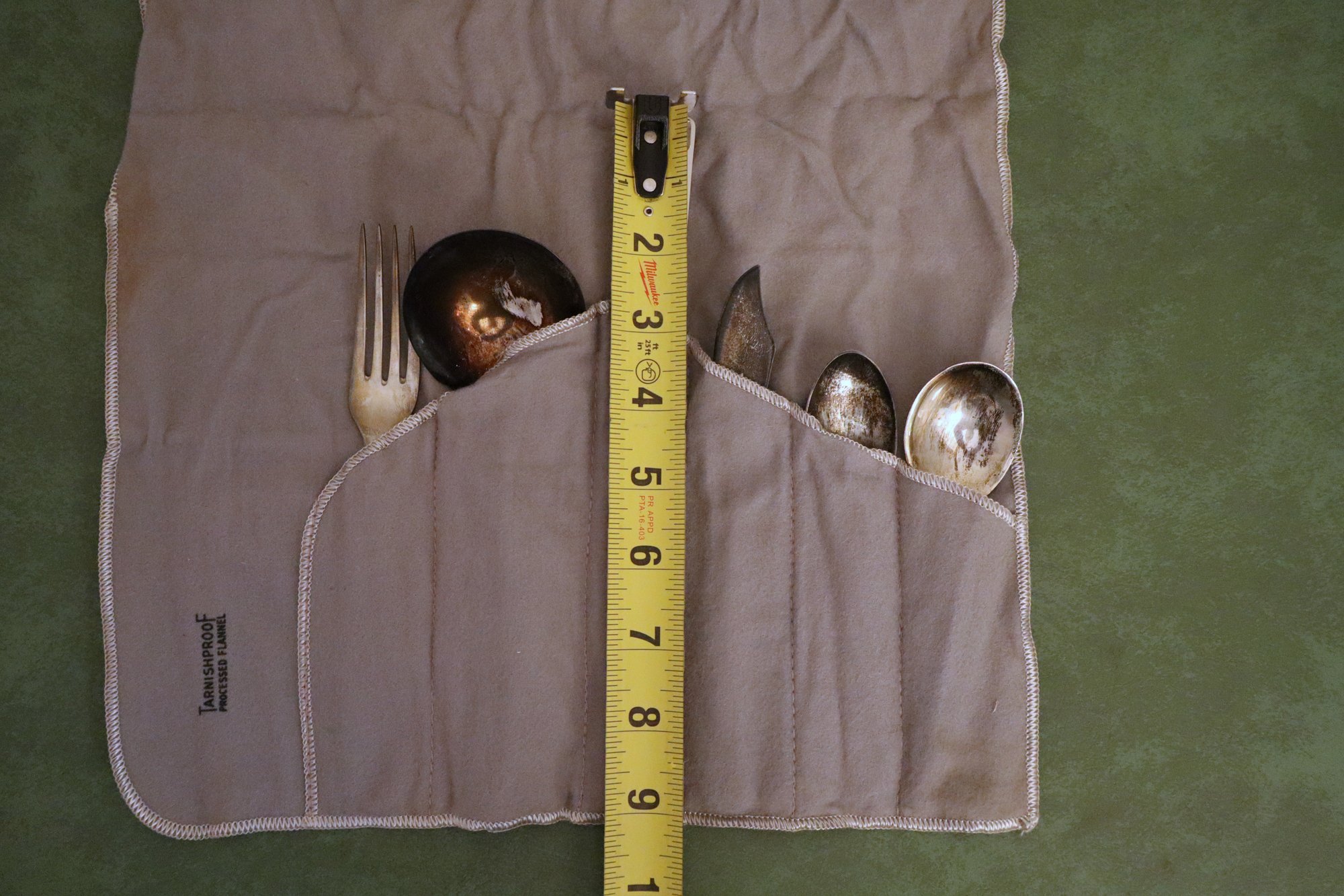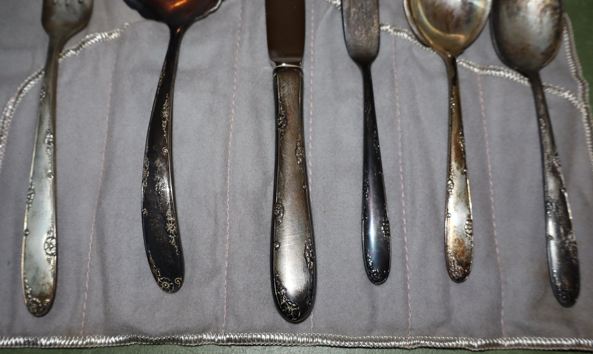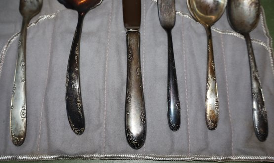Includes 1 spoon, 1 serving spoon, 1 ladle, 1 fork, 1 butter knife & 1 dinner knife in tarnish proof flannel